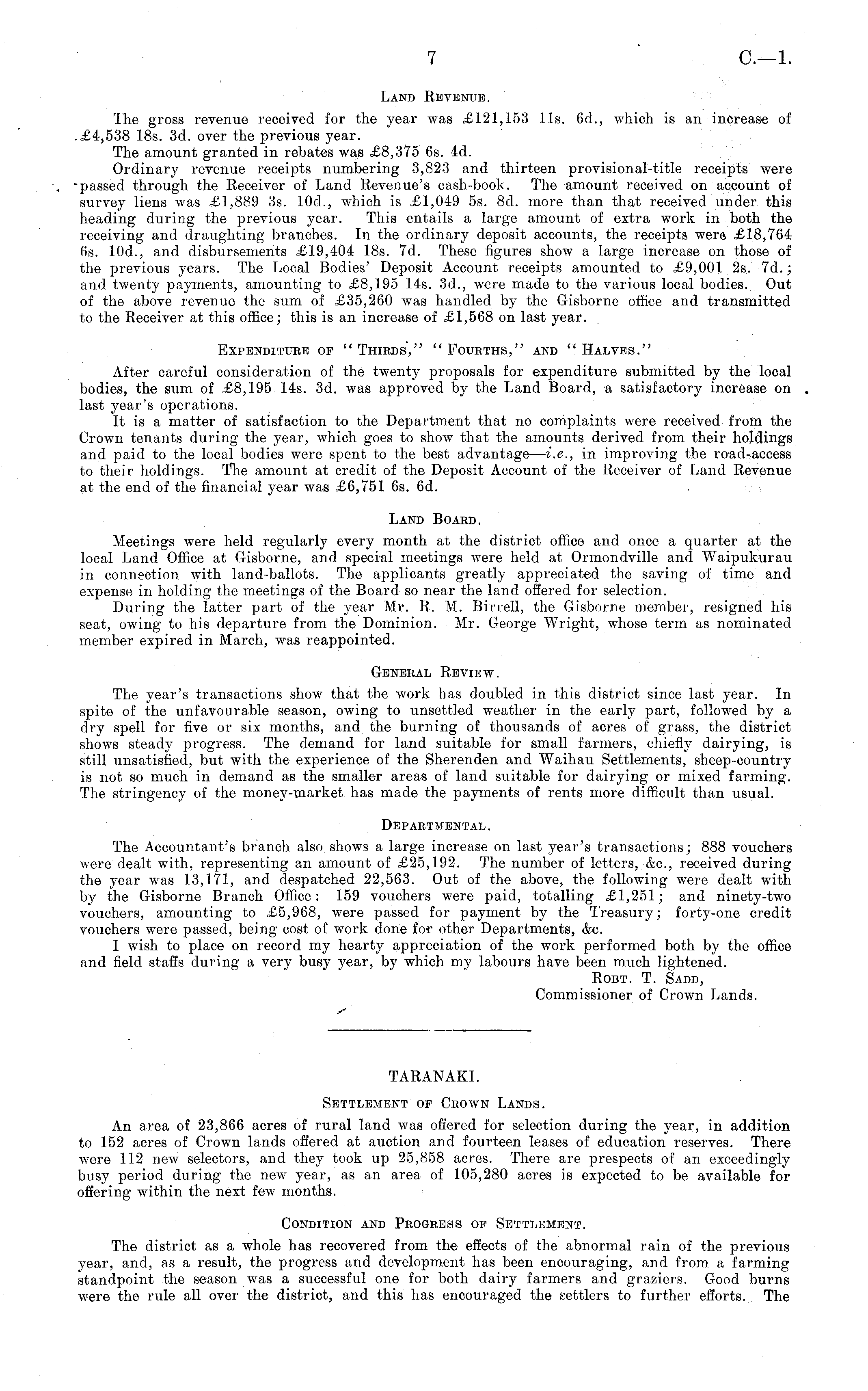 Land Revenue. The gross revenue received for the year was £121,153 lis. 6d., which is an increase of .£4,538 18s. 3d. over the previous year. The amount granted in rebates was £8,375 6s. 4d. Ordinary revenue receipts numbering 3,823 and thirteen provisional-title receipts were passed through the Receiver of Land Revenue's cash-book. The amount received on account of survey liens was £1,889 3s. 10d., which is £1,049 5s. 8d. more than that received under this heading during the previous year. This entails a large amount of extra work in both the receiving and draughting branches. In the ordinary deposit accounts, the receipts were £18,764 6s. 10d., and disbursements £19,404 18s. 7d. These figures show a large increase on those of the previous years. The Local Bodies' Deposit Account receipts amounted to £9,001 2s. 7d.; and twenty payments, amounting to £8,195 14s. 3d., were made to the various local bodies. Out of the above revenue the sum of £35,260 was handled by the Gisborne office and transmitted to the Receiver at this office; this is an increase of £1,568 on last year. Expenditure of "Thirds," "Fourths," and "Halves." After careful consideration of the twenty proposals for expenditure submitted by the local bodies, the sum of £8,195 14s. 3d. was approved by the Land Board, a satisfactory increase on last year's operations. It is a matter of satisfaction to the Department that no complaints were received from the Crown tenants during the year, which goes to show that the amounts derived from their holdings and paid to the local bodies were spent to the best advantage— i.e., in improving the road-access to their holdings. The amount at credit of the Deposit Account of the Receiver of Land Revenue at the end of the financial year was £6,751 6s. 6d. Land Board. Meetings were held regularly every month at the district office and once a quarter at the local Land Office at Gisborne, and special meetings were held at Ormondville and Waipukurau in connection with land-ballots. The applicants greatly appreciated the saving of time and expense in holding the meetings of the Board so near the land offered for selection. During the latter part of the year Mr. R. M. Birrell, the Gisborne member, resigned his seat, owing to his departure from the Dominion. Mr. George Wright, whose term as nominated member expired in March, was reappointed. General Review. The year's transactions show that the work has doubled in this district since last year. In spite of the unfavourable season, owing to unsettled weather in the early part, followed by a dry spell for five or six months, and the burning of thousands of acres of grass, the district shows steady progress. The demand for land suitable for small farmers, chiefly dairying, is still unsatisfied, but with the experience of the Sherenden and Waihau Settlements, sheep-country is not so much in demand as the smaller areas of land suitable for dairying or mixed farming. The stringency of the money-market has made the payments of rents more difficult than usual. Departmental. The Accountant's branch also shows a large increase on last year's transactions; 888 vouchers were dealt with, representing an amount of £25,192. The number of letters, &c, received during the year was 13,171, and despatched 22,563. Out of the above, the following were dealt with hj the Gisborne Branch Office: 159 vouchers were paid, totalling £1,251; and ninety-two vouchers, amounting to £5,968, were passed for payment by the Treasury; forty-one credit vouchers were passed, being cost of work done for other Departments, &c. I wish to place on record my hearty appreciation of the work performed both by the office and field staffs during a very busy year, by which my labours have been much lightened. Robt. T. Sadd, Commissioner of Crown Lands.