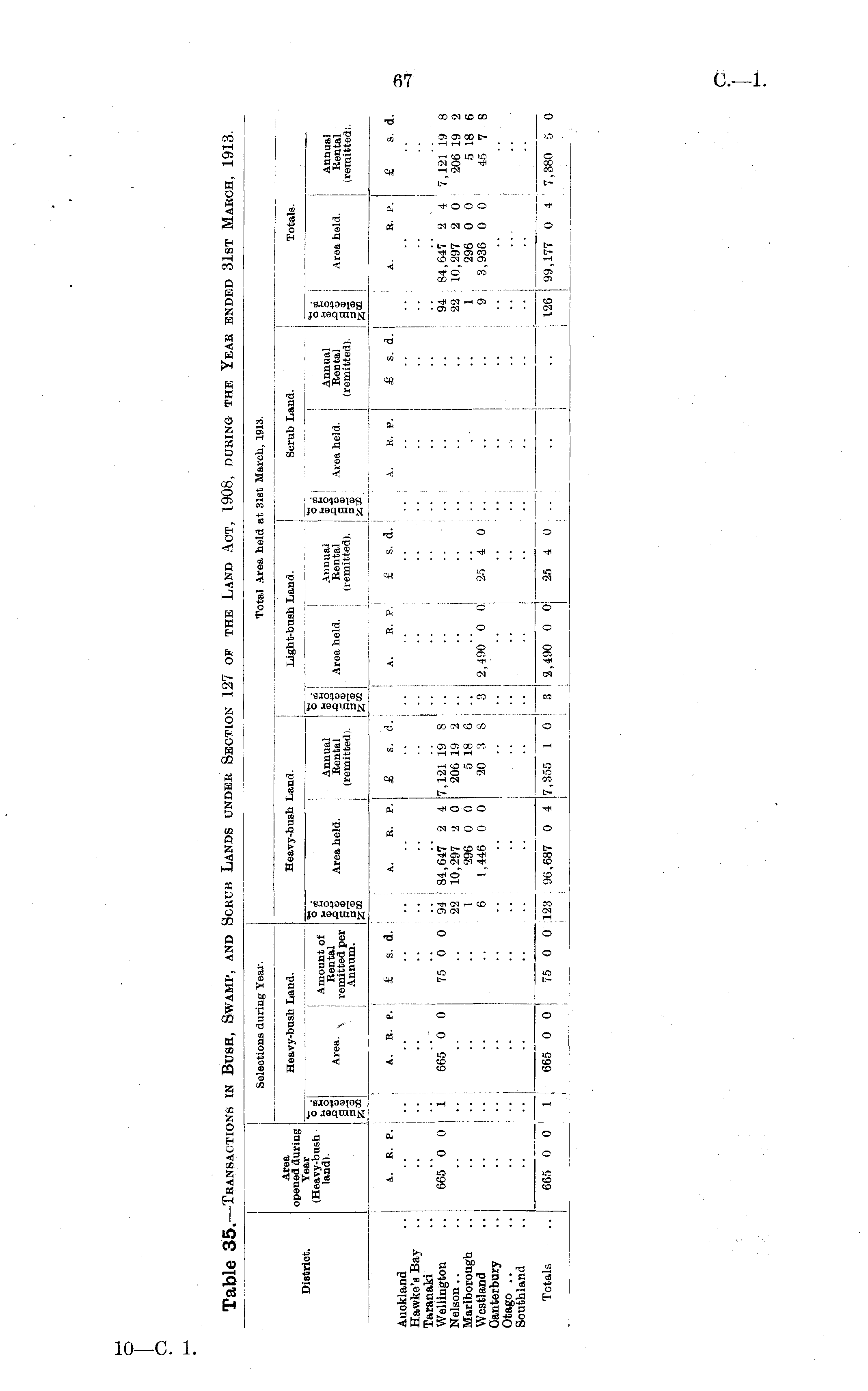 Table 35. —Transactions in Bush, Swamp, and Scrub Lands under Section 127 of the Land Act, 1908, during the Year ended 31st March, 1913.