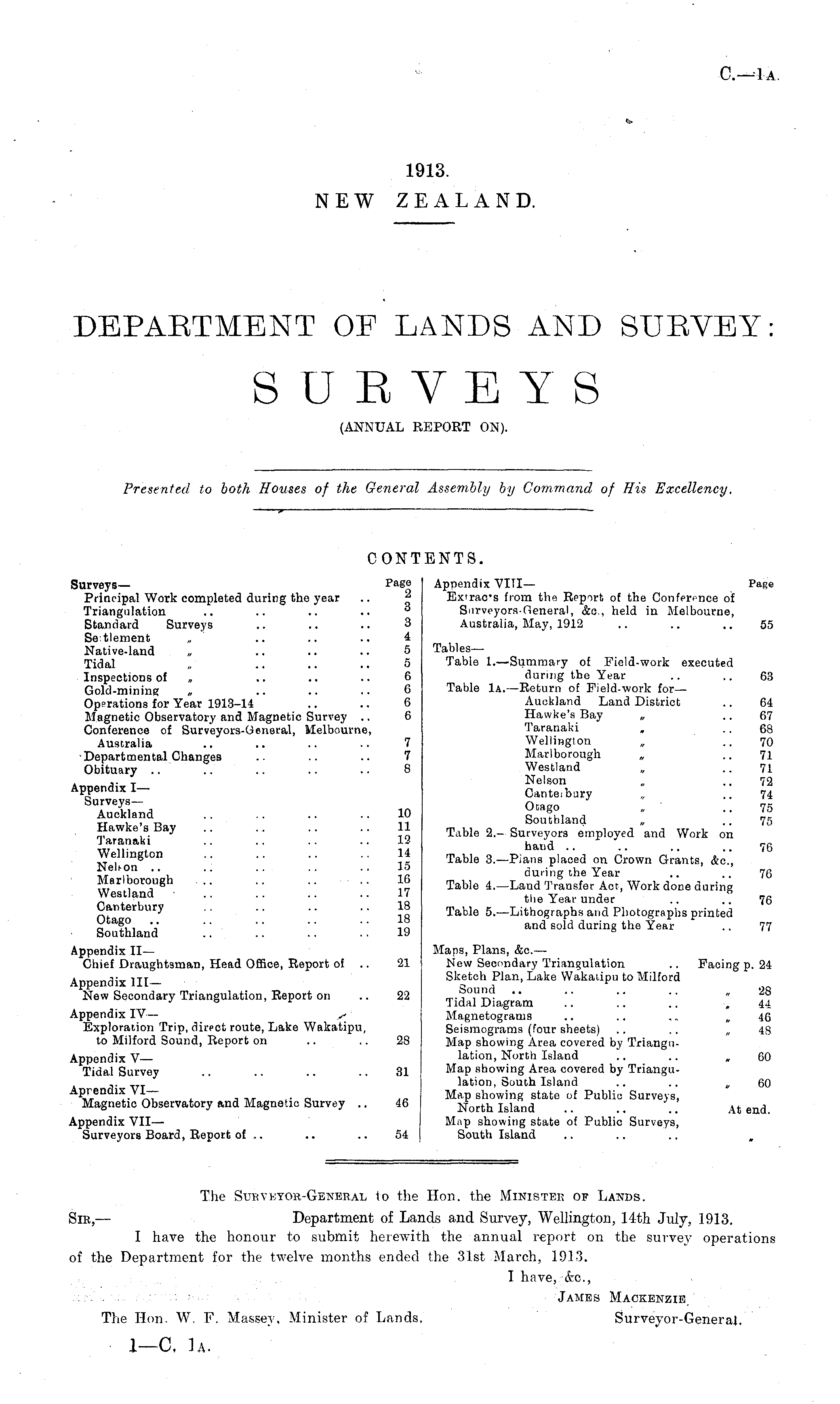 The Surveyor-General to the Hon. the Minister of Lands. Sir, — Department of Lands and Survey, Wellington, 14th July, 1913. I have the honour to submit herewith the annual report on the survey operations of the Department for the twelve months ended the 31st March, 1913. I have, &c., James Mackenzie, The Hon. W. F. Massey, Minister of Lands, Surveyor-General.