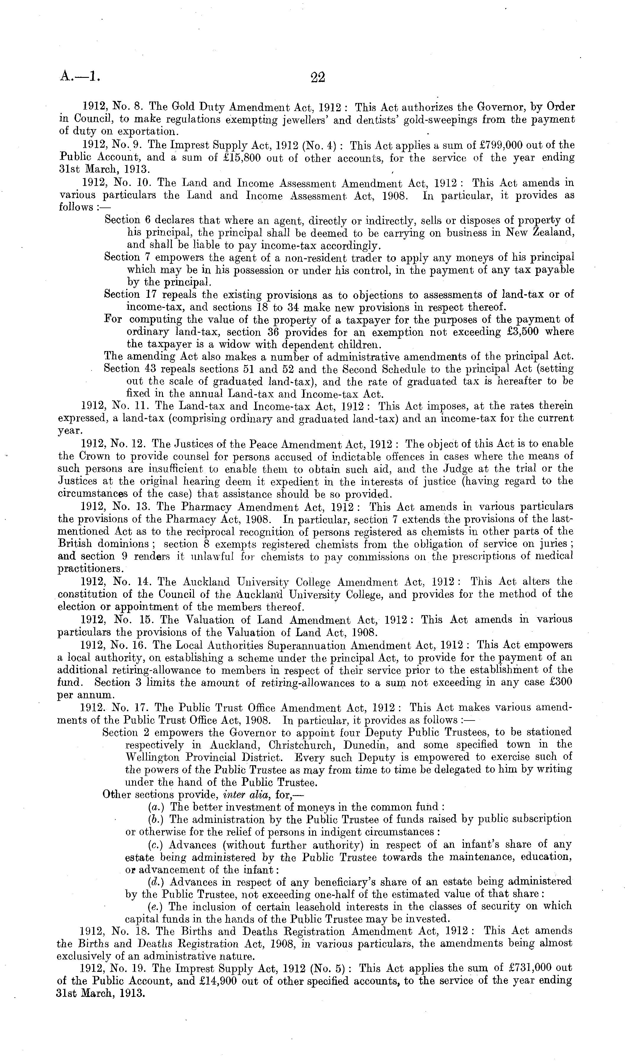 1912, No. 8. The Gold Duty Amendment Act, 1912 : This Act authorizes the Governor, by Order in Council, to make regulations exempting jewellers' and dentists' gold-sweepings from the payment of duty on exportation. 1912, No, 9. The Imprest Supply Act, 1912 (No. 4) : This Act applies a sum of £799,000 out of the Public Account, and a sum of £15,800 out of other accounts, for the service of the year ending 31st March, 1913. 1912, No. 10. The Land and Income Assessment Amendment Act, 1912 : This Act amends in various particulars the Land and Income Assessment Act, 1908. In particular, it provides as follows :— Section 6 declares that where an agent, directly or indirectly, sells or disposes of property of his principal, the principal shall be deemed to be carrying on business in New Zealand, and shall be liable to pay income-tax accordingly. Section 7 empowers the agent of a non-resident trader to apply any moneys of his principal which may be in his possession or under his control, in the payment of any tax payable by the principal. Section 17 repeals the existing provisions as to objections to assessments of land-tax or of income-tax, and sections 18 to 34 make new provisions in respect thereof. For computing the value of the property of a taxpayer for the purposes of the payment of ordinary land-tax, section 36 provides for an exemption not exceeding £3,500 where the taxpayer is a widow with dependent children. The amending Act also makes a number of administrative amendments of the principal Act. Section 43 repeals sections 51 and 52 and the Second Schedule to the principal Act (setting out the scale of graduated land-tax), and the rate of graduated tax is hereafter to be fixed in the annual Land-tax and Income-tax Act. 1912, No. 11. The Land-tax and Income-tax Act, 1912 : This Act imposes, at the rates therein expressed, a land-tax (comprising ordinary and graduated land-tax) and an income-tax for the current year. 1912, No. 12. The Justices of the Peace Amendment Act, 1912 : The object of this Act is to enable the Crown to provide counsel for persons accused of indictable offences in cases where the means of such persons are insufficient to enable them to obtain such aid, and the Judge at the trial or the Justices at the original hearing deem it expedient in the interests of justice (having regard to the circumstances of the case) that assistance should be so provided. 1912, No. 13. The Pharmacy Amendment Act, 1912 : This Act amends in various particulars the provisions of the Pharmacy Act, 1908. In particular, section 7 extends the provisions of the lastmentioned Act as to the reciprocal recognition of persons registered as chemists in other parts of the British dominions ; section 8 exempts registered chemists from the obligation of service on juries ; and section 9 renders it unlawful for chemists to pay commissions on the prescriptions of medical practitioners. 1912, No. 14. The Auckland University College Amendment Act, 1912 : This Act alters the constitution of the Council of the Auckland University College, and provides for the method of the election or appointment of the members thereof. 1912, No. 15. The Valuation of Land Amendment Act, 1912 : This Act amends in various particulars the provisions of the Valuation of Land Act, 1908. 1912, No. 16. The Local Authorities Superannuation Amendment Act, 1912 : This Act empowers a local authority, on establishing a scheme under the principal Act, to provide for the payment of an additional retiring-allowance to members in respect of their service prior to the establishment of the fund. Section 3 limits the amount of retiring-allowances to a sum not exceeding in any case £300 per annum. 1912. No. 17. The Public Trust Office Amendment Act, 1912 : This Act makes various amendments of the Public Trust Office Act, 1908. In particular, it provides as follows : — Section 2 empowers the Governor to appoint four Deputy Public Trustees, to be stationed respectively in Auckland, Christchurch, Dunedin, and some specified town in the Wellington Provincial District. Every such Deputy is empowered to exercise such of the powers of the Public Trustee as may from time to time be delegated to him by writing under the hand of the Public Trustee. Other sections provide, inter alia, for, — (a.) The better investment of moneys in the common fund : (b.) The administration by the Public Trustee of funds raised by public subscription or otherwise for the relief of persons in indigent circumstances : (c.) Advances (without further authority) in respect of an infant's share of any estate being administered by the Public Trustee towards the maintenance, education, or advancement of the infant: (d.) Advances in respect of any beneficiary's share of an estate being administered by the Public Trustee, not exceeding one-half of the estimated value of that share : (c.) The inclusion of certain leasehold interests in the classes of security on which capital funds in the hands of the Public Trustee may be invested. 1912, No. 18. The Births and Deaths Registration Amendment Act, 1912 : This Act amends the Births and Deaths Registration Act, 1908, in various particulars, the amendments being almost exclusively of an administrative nature. 1912, No. 19. The Imprest Supply Act, 1912 (No. 5) : This Act applies the sum of £731,000 out of the Public Account, and £14,900 out of other specified accounts, to the service of the year ending 31st March, 1913.