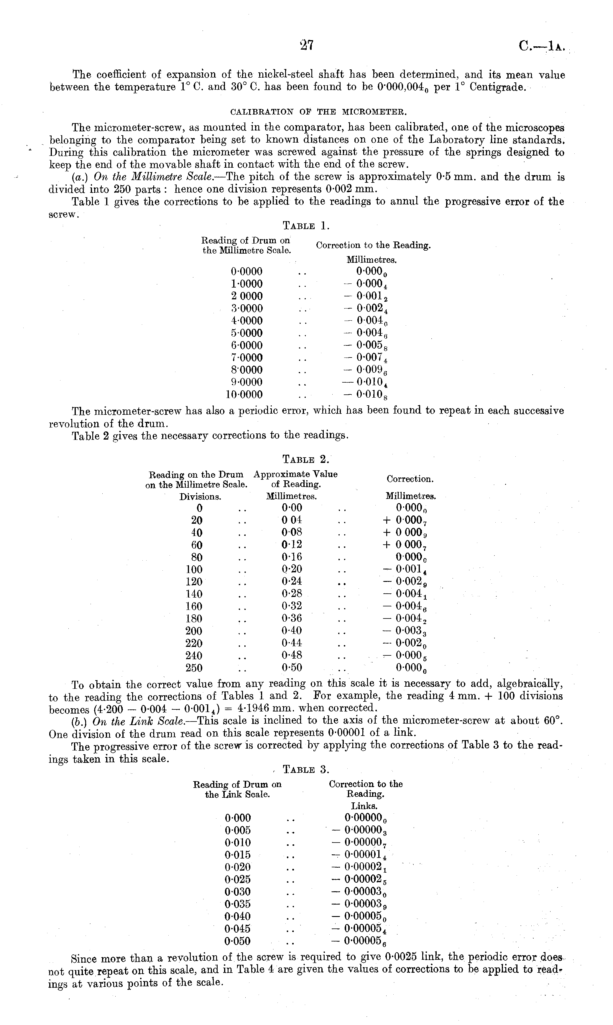 The coefficient of expansion of the nickel-steel shaft has been determined, and its mean value between the temperature 1° C. and 30° C. has been found to be 0 - 000,004 0 per 1° Centigrade. calibration of The micrometer. The micrometer-screw, as mounted in the comparator, has been calibrated, one of the microscopes belonging to the comparator being set to known distances on one of the Laboratory line standards. During this calibration the micrometer was screwed against the pressure of the springs designed to keep the end of the movable shaft in contact with the end of the screw. (a.) On the Millimetre Scale. —The pitch of the screw is approximately 0-5 mm. and the drum is divided into 250 parts : hence one division represents 0-002 mm. Table 1 gives the corrections to be applied to the readings to annul the progressive error of the screw. Table 1. a t n ff• ° f ? m Q m T Correction to the Reading, the Millimetre Scale. s Millimetres. 00000 .. 0-000 0 1-0000 .. - 0000, 2 0000 .. -0001, 30000 .. - 0002 4 40000 .. - 0004 0 50000 .. - 0-004, 6-0000 .. - 0-005 8 7-0000 .. - 0-007 4 80000 .. - 0 009 6 9-0000 .. — 0010 4 100000 .. - 0-010 8 The micrometer-screw has also a periodic error, which has been found to repeat in each successive revolution of the drum. Table 2 gives the necessary corrections to the readings. Table 2. Reading on the Drum Approximate Value Correction on the Millimetre Scale. of Reading. Divisions. Millimetres. Millimetres. 0 .. 000 .. 0-000„ 20 • • 004 .. + 0 000 7 40 .. 008 .. +0 000 9 60 .. 012 .. + 0 000 7 80 .. 016 .. 0 000 0 100 .. 0-20 .. - 0-001 4 120 .. 0-24 .. -0-002 9 140 .. 0-28 .. - 0-004! 160 .. 0-32 .. - 0-004 8 180 .. 0-36 .. - 0-004 2 200 .. 0-40 .. - 0-003, 220 .. 0-44 .. - 0-002 0 240 .. 0-48 .. - 0-000 6 250 .. 0-50 .. 0-000 0 To obtain the correct value from any reading on this scale it is necessary to add, algebraically, to the reading the corrections of Tables 1 and 2. For example, the reading 4 mm. + 100 divisions becomes (4-200 — 0-004 — 0-001 4 ) = 4-1946 mm. when corrected. (b.) On the Link Scale. —This scale is inclined to the axis of the micrometer-screw at about 60°. One division of the drum read on this scale represents 0-00001 of a link. The progressive error of the screw is corrected by applying the corrections of Table 3 to the readings taken in this scale. . Table 3. Reading of Drum on Correction to the the Link Scale. Reading. Links. 0000 . . 0000000 0005 .. - 0000003 0010 .. - 0-00000, 0015 .. - 0-00001 4 0-020 .. -0-00002! 0025 .. - 000002 6 0030 .. - 000003 0 0035 .. - 0-00003 9 0-040 .. - 0-00005 0 0-045 .. - 0-00005 4 0-050 .. - 0-00005 6 Since more than a revolution of the screw is required to give 0-0025 link, the periodic error does not quite repeat on this scale, and in Table 4 are given the values of corrections to be applied to readings at various points of the scale.