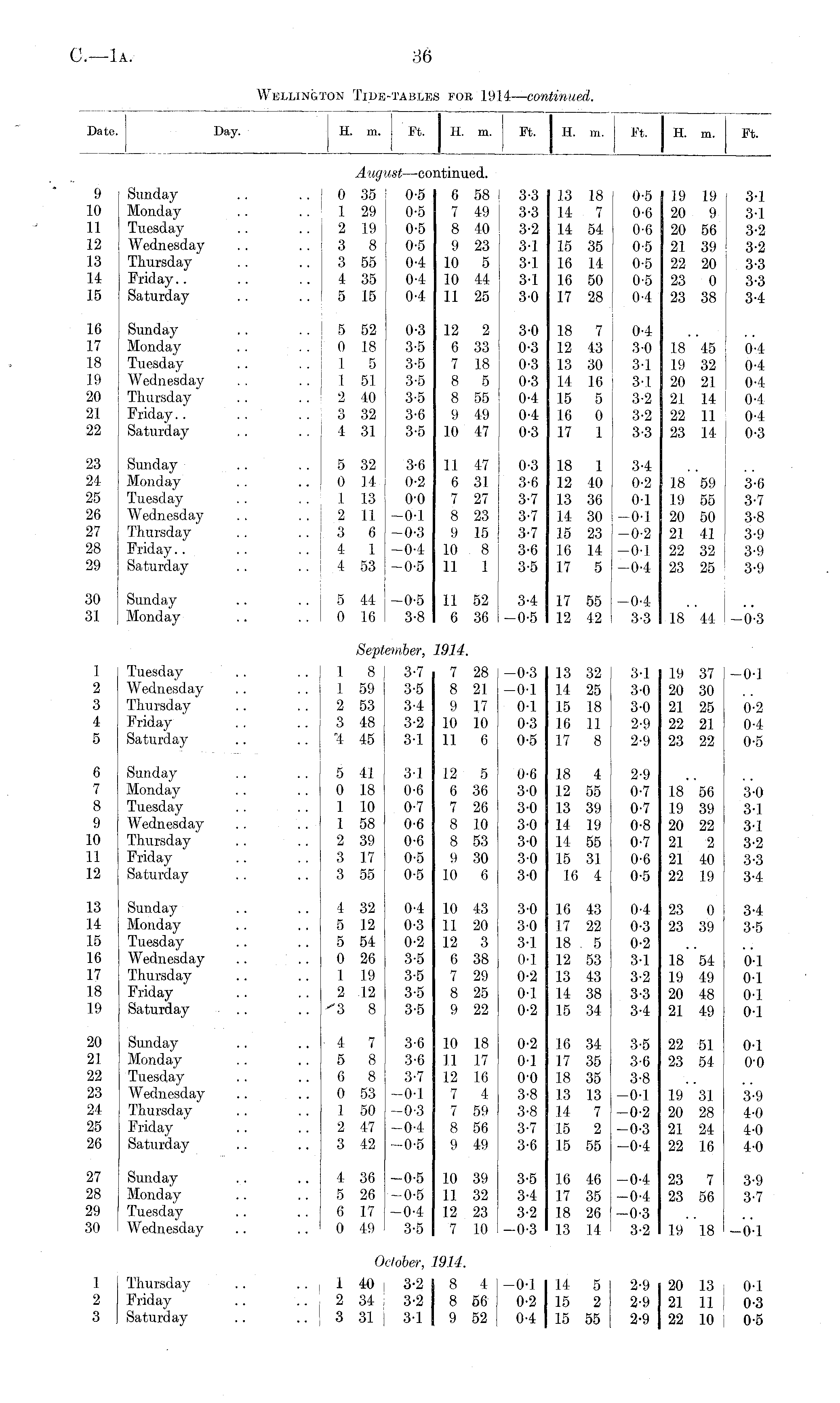 Date. -_ Day. H. in. Ft. H. m. Ft. H. m. Ft. H. m. Ft. Augi ust —continued. 9 10 11 12 13 M 15 9 LO 11 L2 13 M 15 Sunday Monday Tuesday Wednesday Thursday Friday.. Saturday 0 1 2 3 3 4 5 35 29 19 8 55 35 15 0-5 6 58 0-5 7 49 0-5 8 40 0-5 9 23 0-4 10 5 0-4 10 44 0-4 11 25 3-3 3-3 3-2 3-1 3-1 3-1 3-0 13 18 14 7 14 54 15 35 16 14 16 50 17 28 0-5 0-6 0-6 0-5 0-5 0-5 0-4 19 19 20 9 20 56 21 39 22 20 23 0 23 38 3-1 3-1 3-2 3-2 3-3 3-3 3-4 16 17 18 19 20 2! 22 16 L7 18 19 50 51 52 Sunday Monday Tuesday Wednesday Thursday Friday.. Saturday 5 0 1 1 2 o o 4 52 18 5 51 40 32 31 0-3 12 2 3-5 6 33 3-5 7 .1.8 3-5 8 5 3-5 8 55 3-6 9 49 3-5 10 47 3-0 0-3 0-3 0-3 0-4 0-4 0-3 18 7 12 43 13 30 14 16 15 5 16 0 17 1 0-4 3-0 3-1 31 3-2 3-2 3-3 18 45 19 32 | 20 21 21 14 22 11 23 14 0-4 0-4 0-4 0-4 0-4 0-3 23 24 25 20 27 28 2!) 53 !4 55 56 57 58 59 Sunday Monday Tuesday Wednesday Thursday | Friday.. ! Saturday 5 0 .1 2 3 4 4 32 14 13 11 6 1 53 3-6 11 47 0-2 6 31 0-0 7 27 -0-1 8 23 -0-3 9 15 -0-4 10 8 -0-5 11 1 0-3 3-6 3-7 3-7 3-7 3-6 3-5 18 1 12 40 13 36 14 30 15 23 16 14 17 5 3-4 0-2 0-1 -0-1 -0-2 -0-1 -0-4 18 59 19 55 20 50 21 41 22 32 23 25 3-6 3-7 3-8 3-9 3-9 3-9 30 31 10 11 Sunday Monday 5 0 44 16 -0-5 11 52 3-8 6 36 3-4 -0-5 17 55 12 42 -04 3-3 18 44 -0-3 Septt iember, 1914. -0-3 -0-1 0-1 0-3 0-5 13 32 14 25 15 18 16 11 17 8 3-1 3-0 3-0 2-9 2-9 19 37 20 30 21 25 22 21 23 22 -0-1 0-2 0-4 0-5 1 2 3 4 1 2 3 4 5 Tuesday Wednesday Thursday Friday Saturday 1 1. 2 3 "4 8 59 53 48 45 3-7 7 28 3-5 8 21 3-4 9 17 3-2 10 10 3-1 11 6 5 6 7 8 9 10 .11 12 6 7 8 9 0 .1 12 Sunday Monday Tuesday Wednesday Thursday Friday Saturday 5 0 1 1 2 3 3 41 18 10 58 39 17 55 31 12 5 0-6 6 36 0-7 7 26 0-6 8 10 0-6 8 53 0-5 9 30 0-5 10 6 0-6 3-0 3-0 3-0 3-0 30 3-0 18 4 12 55 13 39 14 19 14 55 15 31 16 4 2-9 0-7 0-7 0-8 0-7 0-6 0-5 18 56 19 39 20 22 21 2 21 40 22 19 3-0 3-1 3-1 3-2 3-3 3-4 13 14 15 16 17 18 19 [3 14 15 16 17 18 19 Sunday Monday Tuesday Wednesday Thursday Friday Saturday 4 5 5 0 1 2 32 12 54 26 19 12 8 0-4 10 43 0-3 11 20 0-2 12 3 3-5 6 38 3-5 7 29 3-5 8 25 3-5 9 22 3-0 3-0 3-1 0-1 0-2 0-1 0-2 16 43 17 22 18 5 12 53 13 43 14 38 15 34 0-4 0-3 0-2 31 3-2 3-3 3-4 23 0 23 39 18 54 19 49 20 48 21 49 3-4 3-5 0-1 0-1 0-1 0-1 20 21 22 23 21 25 26 20 .] 52 53 U 55 56 Sunday Monday Tuesday Wednesday Thursday Friday Saturday 4 5 6 0 1 2 3 7 8 8 53 50 47 42 3-6 10 18 3-6 11 17 3-7 12 16 -0-1 7 4 -0-3 7 59 -0-4 8 56 -0-5 9 49 0-2 0-1 0-0 3-8 3-8 3-7 3-6 16 34 17 35 18 35 13 13 14 7 15 2 15 55 3-5 3-6 3-8 -0-1 -0-2 -0-3 -0-4 22 51 23 54 19 31 20 28 21 24 22 16 0-1 o-o 3-9 4-0 4-0 4-0 27 28 29 30 57 58 !9 10 Sunday Monday Tuesday Wednesday 4 5 6 0 36 26 17 49 -0-5 10 39 -0-5 11 32 -0-4 12 23 3-5 7 10 3-5 3-4 3-2 -0-3 16 46 17 35 18 26 13 14 -0-4 -0-4 -0-3 3-2 23 7 23 56 3-9 3-7 19 .18 -0-1 O, ktober, 1914. -0-1 0-2 0-4 .14 5 15 2 15 55 2-9 2-9 2-9 20 13 21 11 22 10 0-1 0-3 0-5 1 2 3 Thursday Friday Saturday 1 2 3 40 34 31 3-2 8 4 3-2 8 56 3-1 9 52