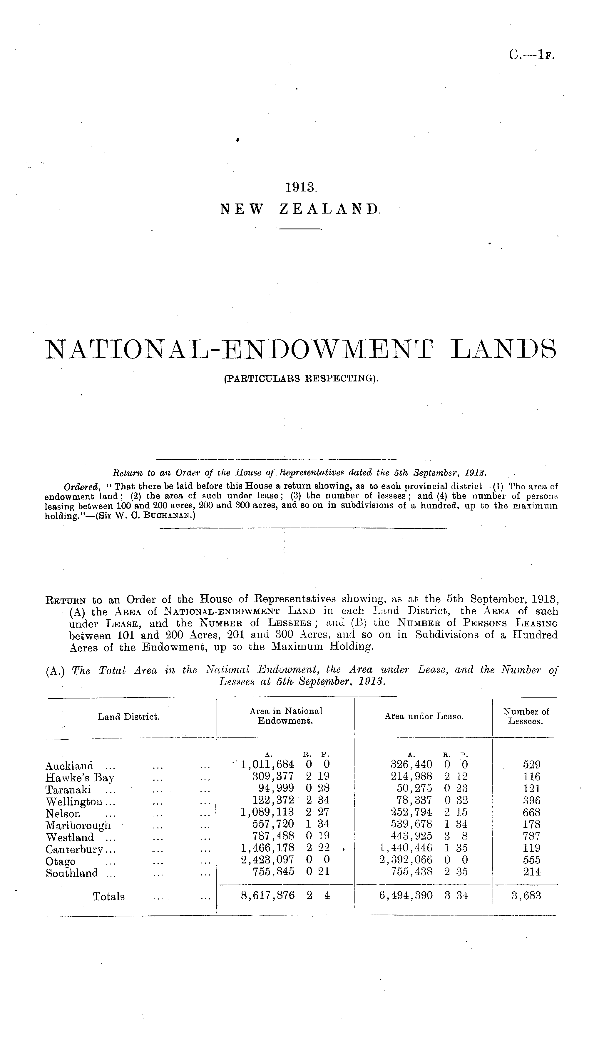 Return to an Order of the House of Representatives showing, as at the 5th September, 1913, (A) the Area of National-endowment Land in each Land District, the Area of such under Lease, and the Number of Lessees; and (B) the Number of Persons Leasing between 101 and 200 Acres, 201 and 300 Acres, and so on in Subdivisions of a Hundred Acres of the Endowment, up to the Maximum Holding. (A.) The Total Area in the National Endowment, the Area under Lease, and the Number of Lessees at 5th September, 1913.