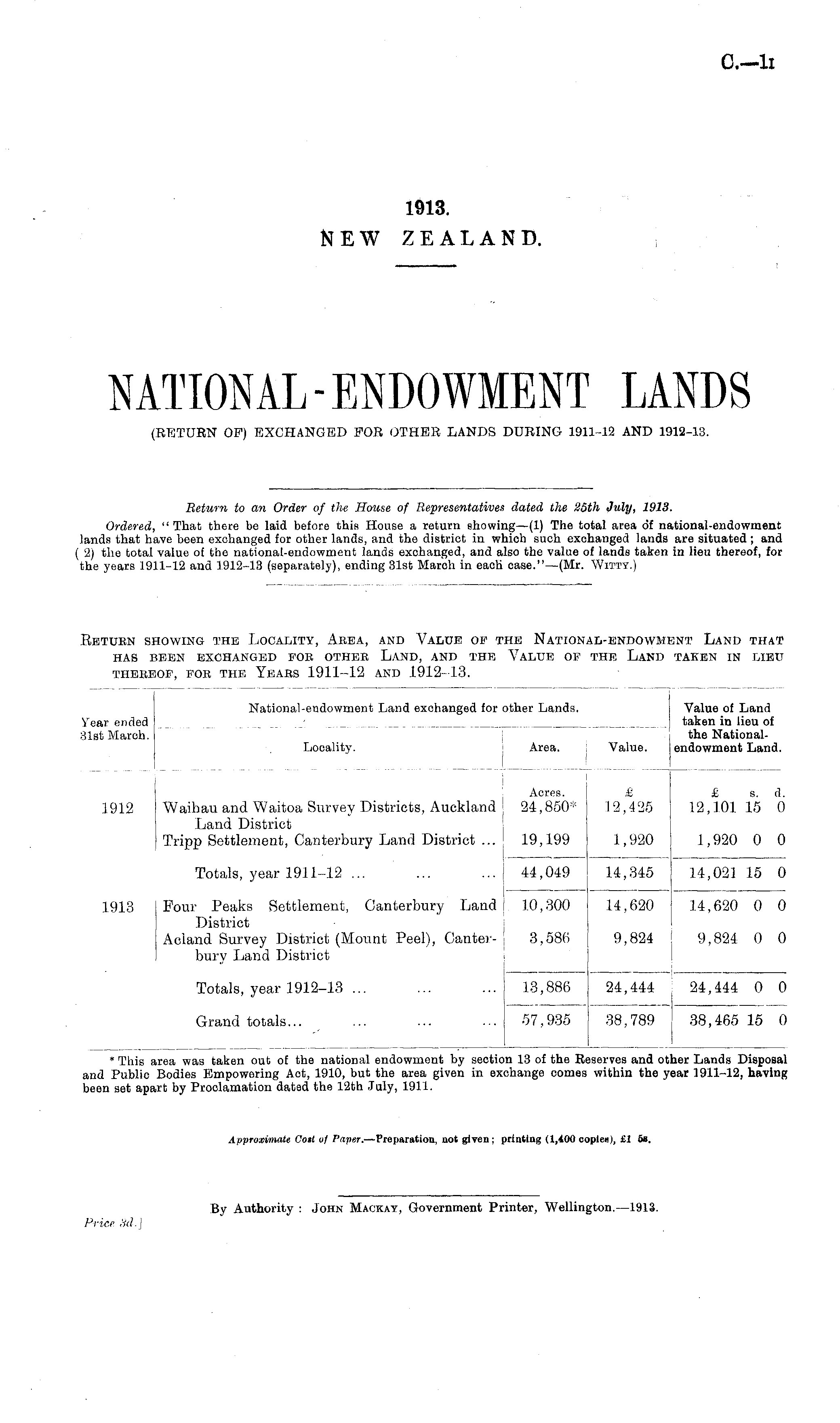 Return to an Order of the House of Representatives dated the 25th July, 1913. Ordered, " That there be laid before this House a return showing—(l) The total area of national-endowment lands that have been exchanged for other lands, and the district in which such exohanged lands are situated; and ( 2) the total value of the national-endowment lands exchanged, and also the value of lands taken in lieu thereof, for the years 1911-12 and 1912-13 (separately), ending 31sfc Maroh in eaoti case."—(Mr. Witty.)