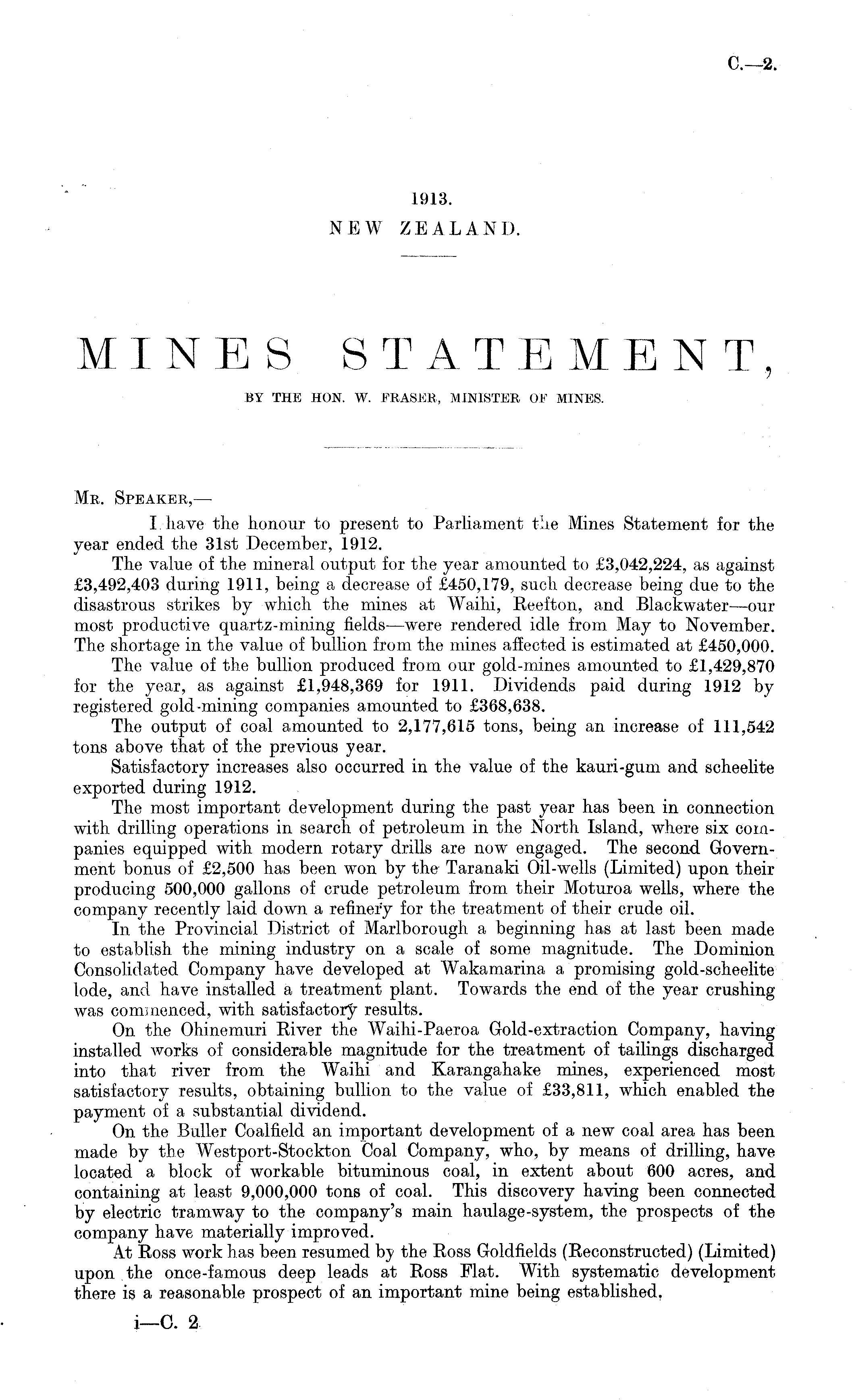 Mr. Speaker,— I. have the honour to present to Parliament the Mines Statement for the year ended the 31st December, 1912. The value of the mineral output for the year amounted to £3,042,224, as against £3,492,403 during 1911, being a decrease of £450,179, such decrease being due to the disastrous strikes by which the mines at Waihi, Reefton, and Blackwater—our most productive quartz-mining fields—were rendered idle from May to November. The shortage in the value of bullion from the mines affected is estimated at £450,000. The value of the bullion produced from our gold-mines amounted to £1,429,870 for the year, as against £1,948,369 for 1911. Dividends paid during 1912 by registered gold-mining companies amounted to £368,638. The output of coal amounted to 2,177,615 tons, being an increase of 111,542 tons above that of the previous year. Satisfactory increases also occurred in the value of the kauri-gum and scheelite exported during 1912. The most important development during the past year has been in connection with drilling operations in search of petroleum in the North Island, where six companies equipped with modern rotary drills are now engaged. The second Government bonus of £2,500 has been won by the Taranaki Oil-wells (Limited) upon their producing 500,000 gallons of crude petroleum from their Moturoa wells, where the company recently laid down a refinery for the treatment of their crude oil. In the Provincial District of Marlborough a beginning has at last been made to establish the mining industry on a scale of some magnitude. The Dominion Consolidated Company have developed at Wakamarina a promising gold-scheelite lode, and have installed a treatment plant. Towards the end of the year crushing was commenced, with satisfactory results. On the Ohinemuri River the Waihi-Paeroa Gold-extraction Company, having installed works of considerable magnitude for the treatment of tailings discharged into that river from the Waihi and Karangahake mines, experienced most satisfactory results, obtaining bullion to the value of £33,811, which enabled the payment of a substantial dividend. On the Buller Coalfield an important development of a new coal area has been made by the Westport-Stockton Coal Company, who, by means of drilling, have located a block of workable bituminous coal, in extent about 600 acres, and containing at least 9,000,000 tons of coal. This discovery having been connected by electric tramway to the company's main haulage-system, the prospects of the company have materially improved. At Ross work has been resumed by the Ross Goldfields (Reconstructed) (Limited) upon the once-famous deep leads at Ross Flat. With systematic development there is a reasonable prospect of an important mine being established.