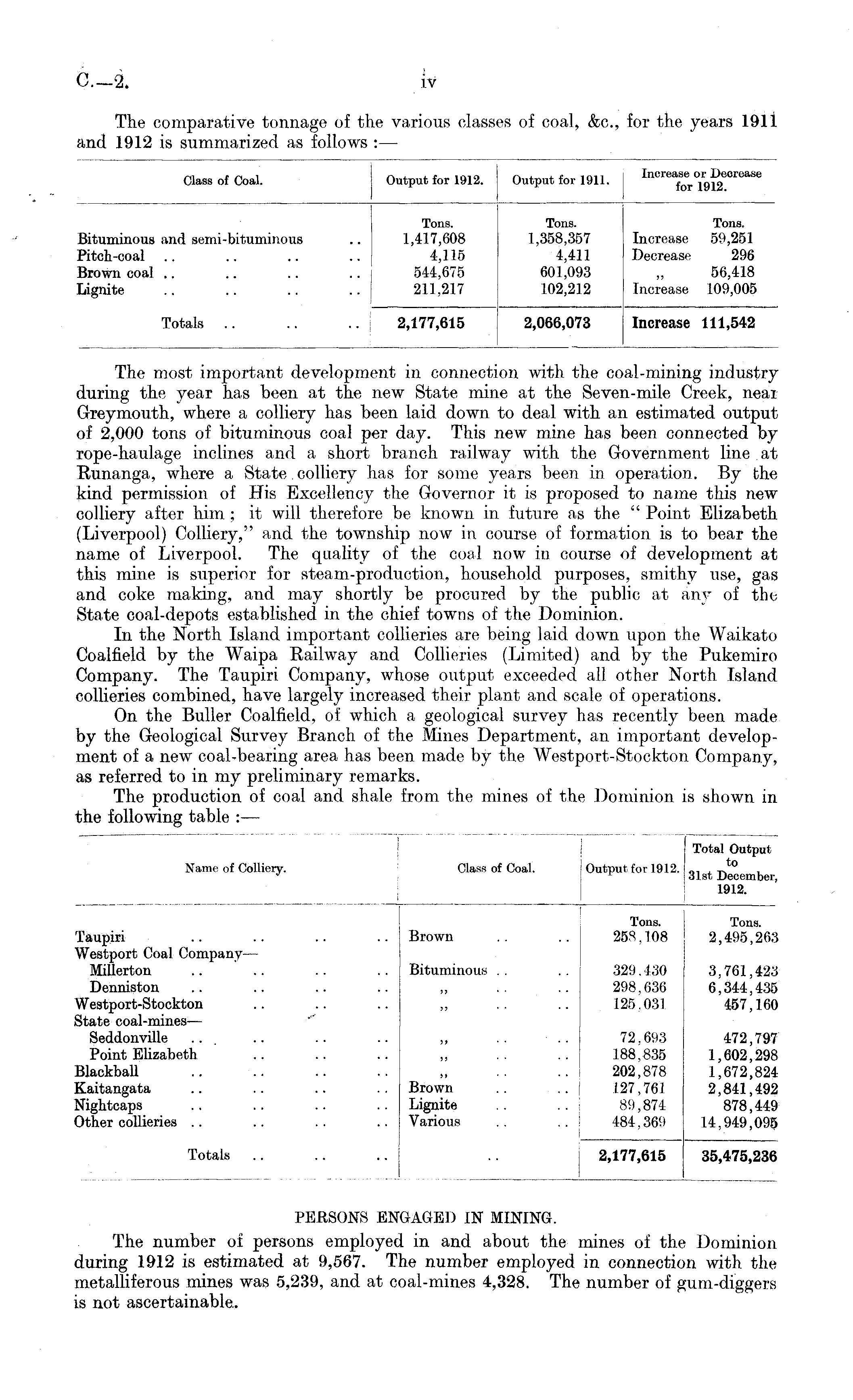 The comparative tonnage of the various classes of coal, &c, for the years 1911 and 1912 is summarized as follows :—