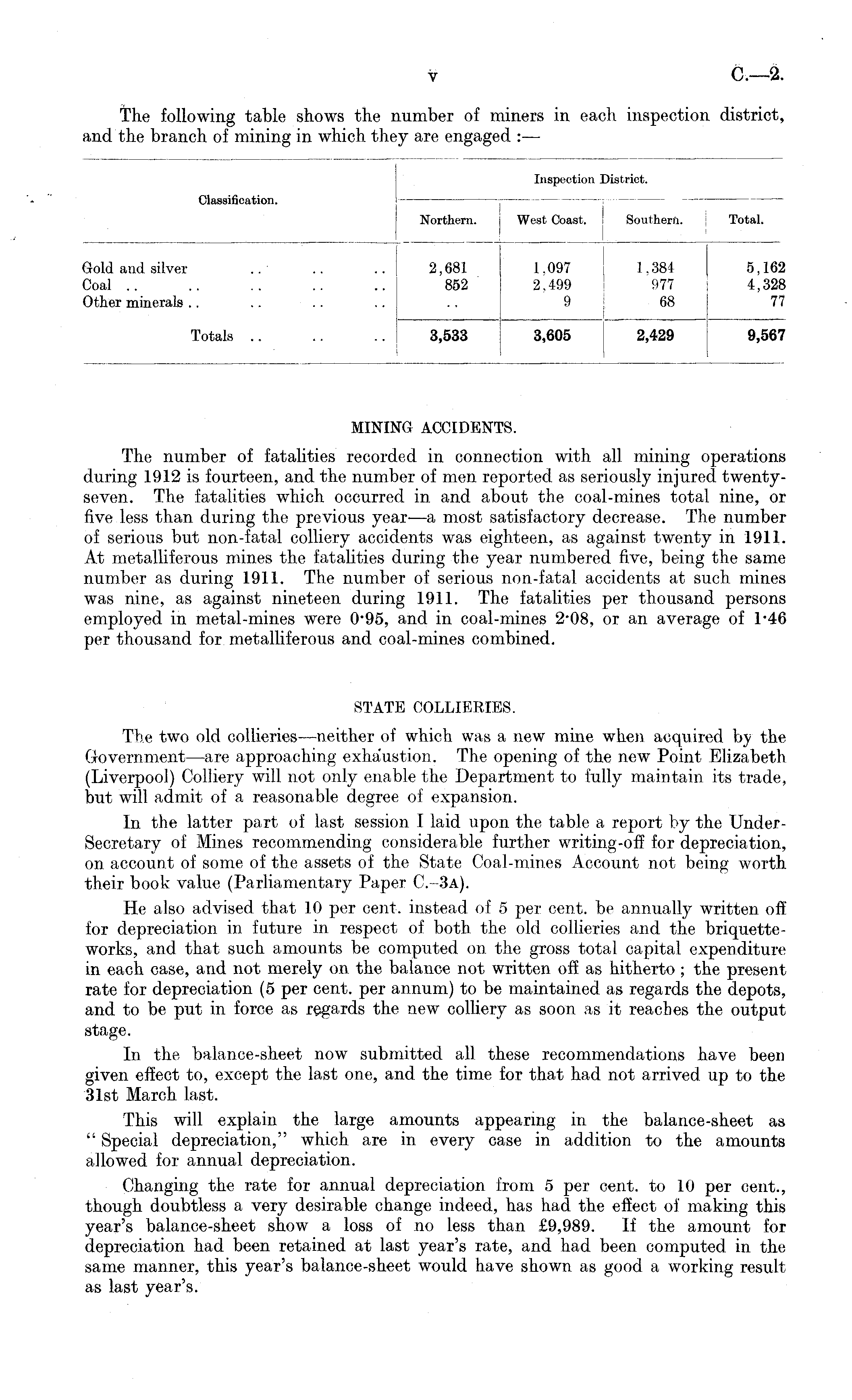 MINING ACCIDENTS. The number of fatalities recorded in connection with all mining operations during 1912 is fourteen, and the number of men reported as seriously injured twentyseven. The fatalities which occurred in and about the coal-mines total nine, or five less than during the previous year—a most satisfactory decrease. The number of serious but non-fatal colliery accidents was eighteen, as against twenty in 1911. At metalliferous mines the fatalities during the year numbered five, being the same number as during 1911. The number of serious non-fatal accidents at such mines was nine, as against nineteen during 1911. The fatalities per thousand persons employed in metal-mines were 0"95, and in coal-mines 2*oB, or an average of 1"46 per thousand for metalliferous and coal-mines combined. STATE COLLIERIES. The two old collieries—neither of which was a new mine when acquired by the Government —are approaching exhaustion. The opening of the new Point Elizabeth (Liverpool) Colliery will not only enable the Department to fully maintain its trade, but will admit of a reasonable degree of expansion. In the latter part of last session I laid upon the table a report by the Undersecretary of Mines recommending considerable further writing-off for depreciation, on account of some of the assets of the State Coal-mines Account not being worth their book value (Parliamentary Paper C.-3a). He also advised that 10 per cent, instead of 5 per cent, be annually written off for depreciation in future in respect of both the old collieries and the briquetteworks, and that such amounts be computed on the gross total capital expenditure in each case, and not merely on the balance not written off as hitherto ; the present rate for depreciation (5 per cent, per annum) to be maintained as regards the depots, and to be put in force as regards the new colliery as soon as it reaches the output stage. In the balance-sheet now submitted all these recommendations have been given effect to, except the last one, and the time for that had not arrived up to the 31st March last. This will explain the large amounts appearing in the balance-sheet as " Special depreciation," which are in every case in addition to the amounts allowed for annual depreciation. Changing the rate for annual depreciation from 5 per cent, to 10 per cent., though doubtless a very desirable change indeed, has had the effect of making this year's balance-sheet show a loss of no less than £9,989. If the amount for depreciation had been retained at last year's rate, and had been computed in the same manner, this year's balance-sheet would have shown as good a working result as last year's.