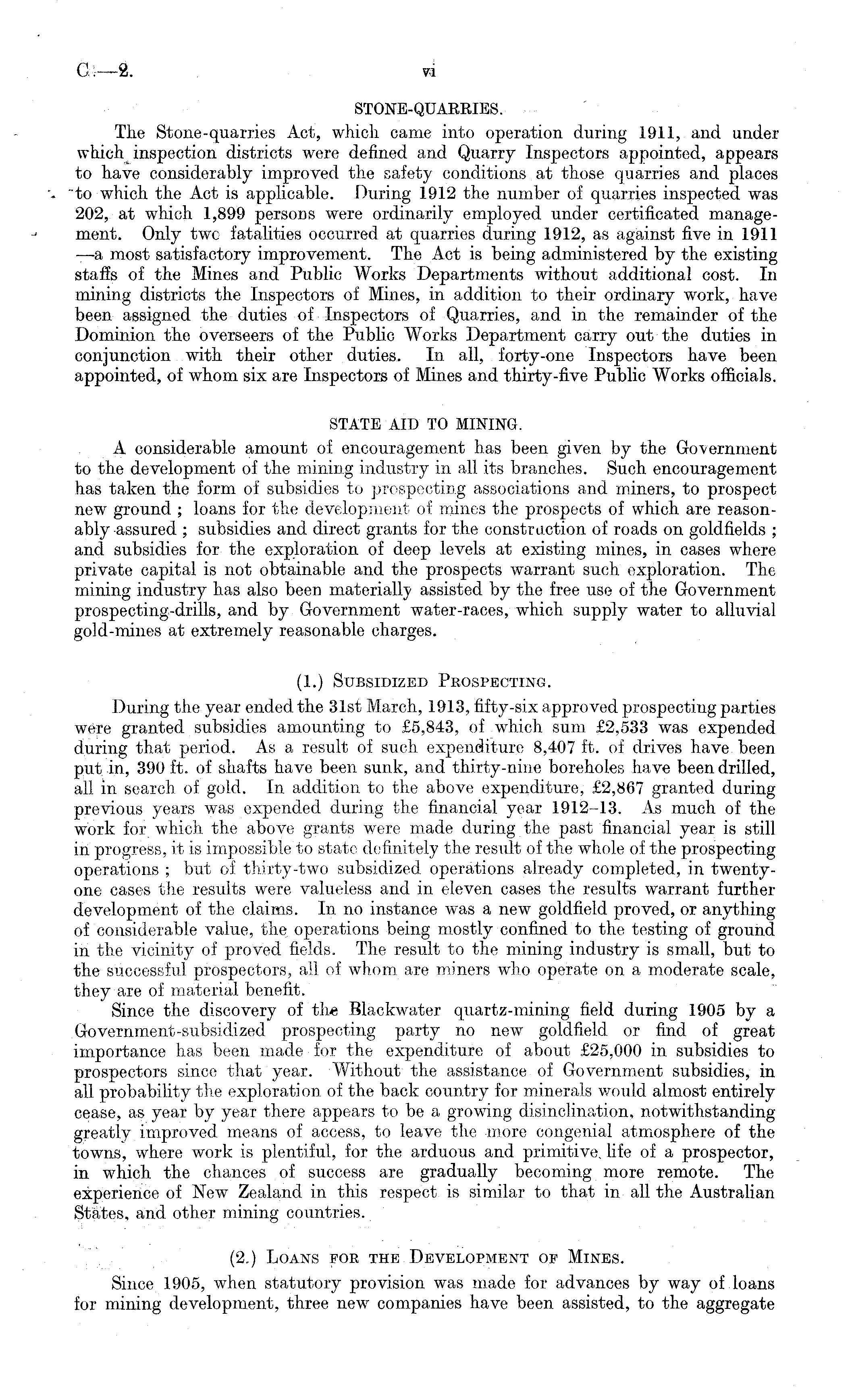 STONE-QUARRIES. The Stone-quarries Act, which came into operation during 1911, and under which inspection districts were defined and Quarry Inspectors appointed, appears to have considerably improved the safety conditions at those quarries and places to which the Act is applicable. During 1912 the number of quarries inspected was 202, at which 1,899 persons were ordinarily employed under certificated management. Only twc fatalities occurred at quarries during 1912, as against five in 1911 —a most satisfactory improvement. The Act is being administered by the existing staffs of the Mines and Public Works Departments without additional cost. In mining districts the Inspectors of Mines, in addition to their ordinary work, have been assigned the duties of Inspectors of Quarries, and in the remainder of the Dominion the overseers of the Public Works Department carry out the duties in conjunction with their other duties. In all, forty-one Inspectors have been appointed, of whom six are Inspectors of Mines and thirty-five Public Works officials. STATE AID TO MINING. A considerable amount of encouragement has been given by the Government to the development of the mining industry in all its branches. Such encouragement has taken the form of subsidies to prospecting associations and miners, to prospect new ground ; loans for the development of mines the prospects of which are reasonably assured ; subsidies and direct grants for the construction of roads on goldfields ; and subsidies for the exploration of deep levels at existing mines, in cases where private capital is not obtainable and the prospects warrant such exploration. The mining industry has also been materially assisted by the free use of the Government prospecting-drills, and by Government water-races, which supply water to alluvial gold-mines at extremely reasonable charges. (1.) Subsidized Prospecting. During the year ended the 31st March, 1913, fifty-six approved prospecting parties were granted subsidies amounting to £5,843, of which sum £2,533 was expended during that period. As a result of such expenditure 8,407 ft. of drives have been put in, 390 ft. of shafts have been sunk, and thirty-nine boreholes have been drilled, all in search of gold. In addition to the above expenditure, £2,867 granted during previous years was expended during the financial year 1912-13. As much of the work for which the above grants were made during the past financial year is still in progress, it is impossible to state definitely the result of the whole of the prospecting operations ; but of thirty-two subsidized operations already completed, in twentyone cases the results were valueless and in eleven cases the results warrant further development of the claims. In no instance was a new goldfield proved, or anything of considerable value, the. operations being mostly confined to the testing of ground in the vicinity of proved fields. The result to the mining industry is small, but to the successful prospectors, all of whom, are miners who operate on a moderate scale, they are of material benefit. Since the discovery of the Blackwater quartz-mining field during 1905 by a Government-subsidized prospecting party no new goldfield or find of great importance has been made for the expenditure of about £25,000 in subsidies to prospectors since that year. Without the assistance of Government subsidies, in all probability the exploration of the back country for minerals would almost entirely cease, as year by year there appears to be a growing disinclination, notwithstanding greatly improved means of access, to leave the more congenial atmosphere of the towns, where work is plentiful, for the arduous and primitive, life of a prospector, in which the chances of success are gradually becoming more remote. The experience of New Zealand in this respect is similar to that in all the Australian States, and other mining countries. (2,) Loans for the Development of Mines. Since 1905, when statutory provision was made for advances by way of loans for mining development, three new companies have been assisted, to the aggregate