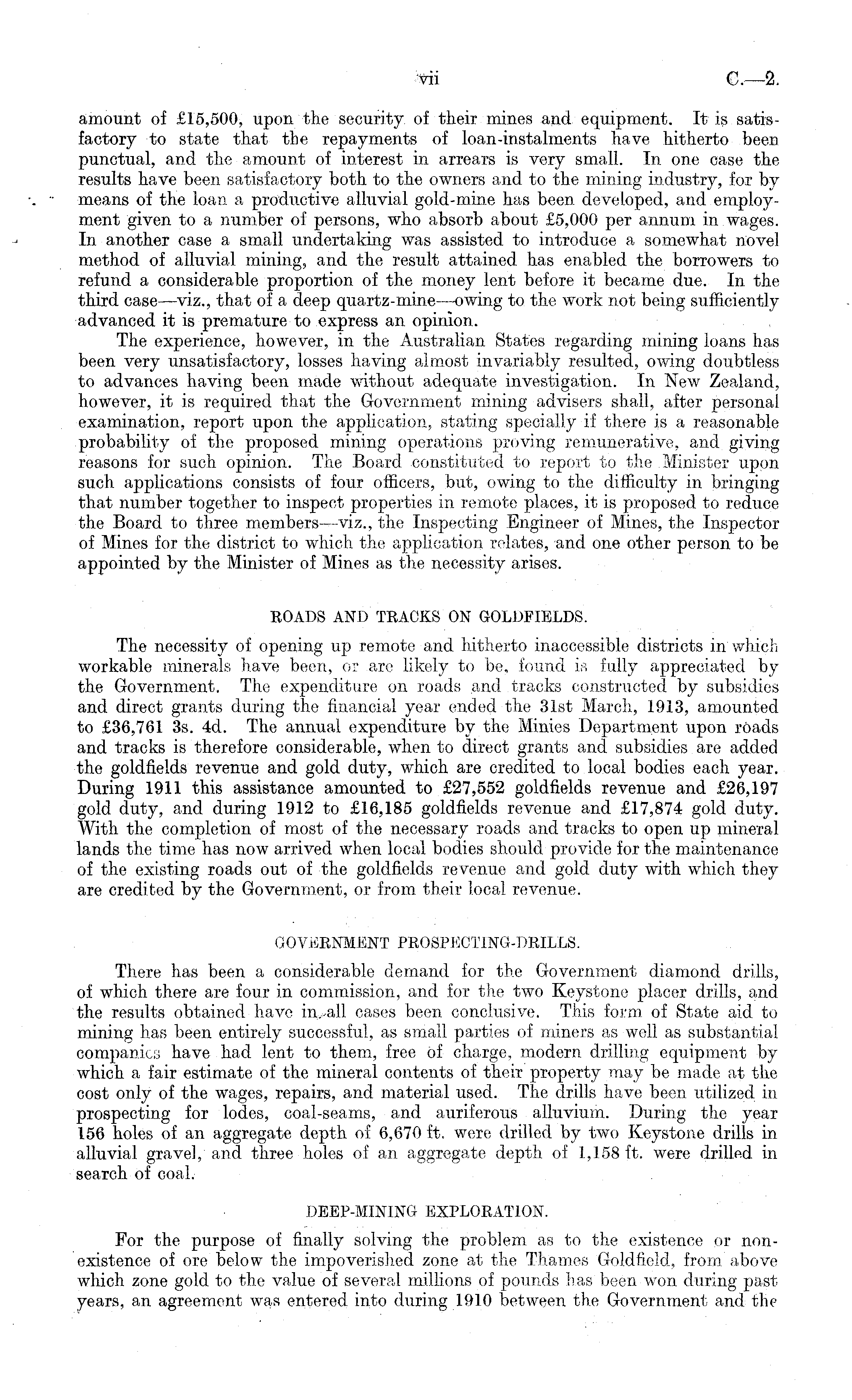 amount of £15,500, upon the security of their mines and equipment. It is satisfactory to state that the repayments of loan-instalments have hitherto been punctual, and the amount of interest in arrears is very small. In one case the results have been satisfactory both to the owners and to the mining industry, for by means of the loan a productive alluvial gold-mine has been developed, and employment given to a number of persons, who absorb about £5,000 per annum in wages. In another case a small undertaking was assisted to introduce a somewhat novel method of alluvial mining, and the result attained has enabled the borrowers to refund a considerable proportion of the money lent before it became due. In the third case —viz., that of a deep quartz-mine—owing to the work not being sufficiently advanced it is premature to express an opinion. The experience, however, in the Australian States regarding mining loans has been very unsatisfactory, losses having almost invariably resulted, owing doubtless to advances having been made without adequate investigation. In New Zealand, however, it is required that the Government mining advisers shall, after personal examination, report upon the application, stating specially if there is a reasonable probability of the proposed mining operations proving remunerative, and giving reasons for such opinion. The Board constituted to report to the Minister upon such applications consists of four officers, but, owing to the difficulty in bringing that number together to inspect properties in remote places, it is proposed to reduce the Board to three members—viz., the Inspecting Engineer of Mines, the Inspector of Mines for the district to which the application relates, and one other person to be appointed by the Minister of Mines as the necessity arises. ROADS AND TRACKS ON GOLDFIBLDS. The necessity of opening up remote and hitherto inaccessible districts in which workable minerals have been, or are likely to be, found is fully appreciated by the Government. The expenditure on roads and tracks constructed by subsidies and direct grants during the financial year ended the 31st March, 1913, amounted to £36,761 3s. 4d. The annual expenditure by the Minies Department upon roads and tracks is therefore considerable, when to direct grants and subsidies are added the goldfields revenue and gold duty, which are credited to local bodies each year. During 1911 this assistance amounted to £27,552 goldfields revenue and £26,197 gold duty, and during 1912 to £16,185 goldfields revenue and £17,874 gold duty. With the completion of most of the necessary roads and tracks to open up mineral lands the time has now arrived when local bodies should provide for the maintenance of the existing roads out of the goldfields revenue and gold duty with which they are credited by the Government, or from their local revenue. GOVERNMENT PROSPECTING-] >RILLS. There has been a considerable demand for the Government diamond drills, of which there are four in commission, and for the two Keystone placer drills, and the results obtained have in,-all cases been conclusive. This form of State aid to mining has been entirely successful, as small parties of miners as well as substantial companies have had lent to them, free of charge, modern drilling equipment by which a fair estimate of the mineral contents of their property may be made at the cost only of the wages, repairs, and material used. The drills have been utilized in prospecting for lodes, coal-seams, and auriferous alluvium. During the year 156 holes of an aggregate depth of 6,670 ft. were drilled by two Keystone drills in alluvial gravel, and three holes of an aggregate depth of 1,158 ft. were drilled in search of coal. DEEP-MINING EXPLORATION. For the purpose of finally solving the problem as to the existence or nonexistence of ore below the impoverished zone at the Thames Goldfield, from above which zone gold to the value of several millions of pounds lias been won during past years, an agreement was entered into during 1910 between the Government and the