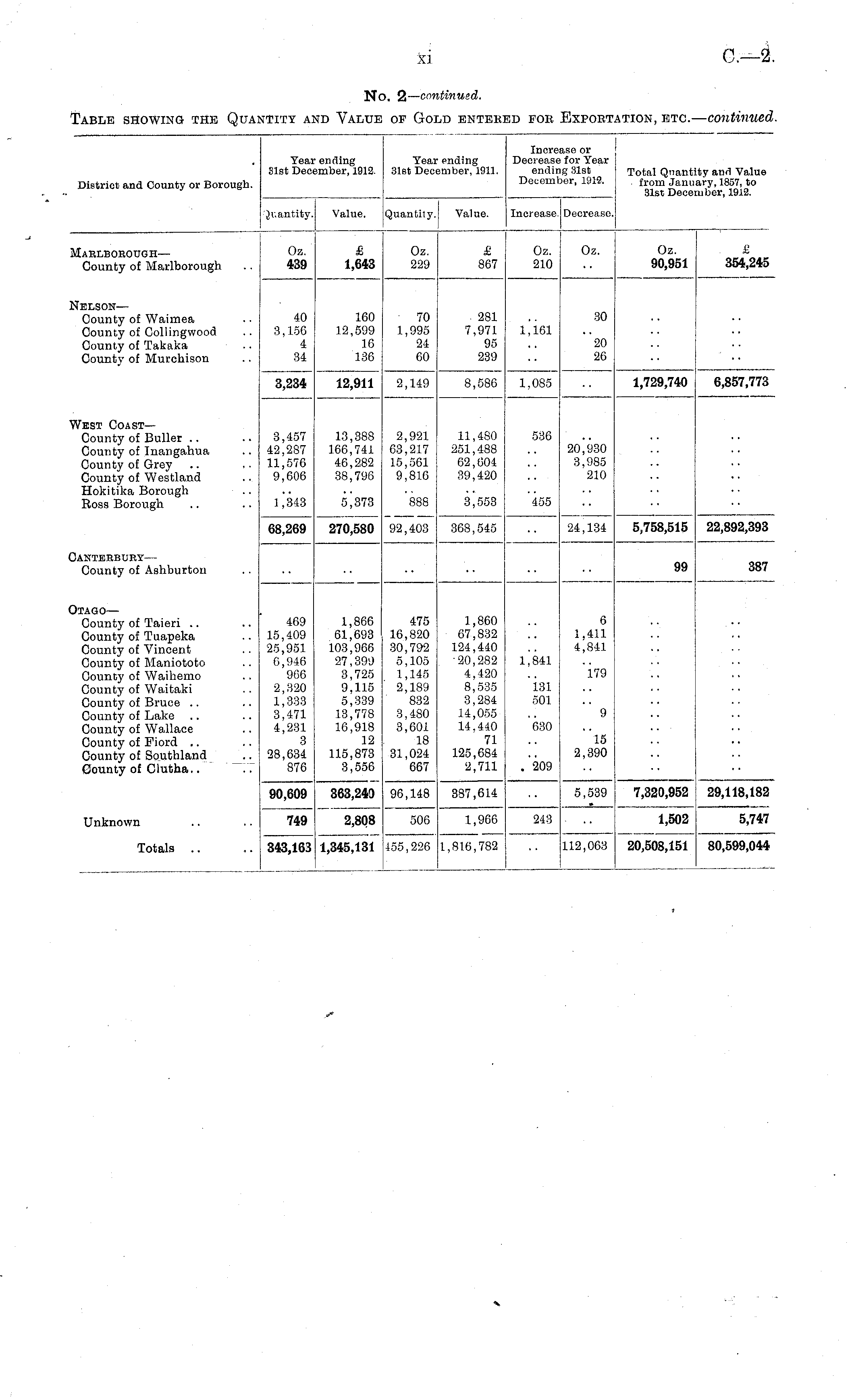 Year ending 31st December, 1912. Year ending 31st December, 1911. Increase or Decrease for Year ending 31st December, 1912. District and County or Borough. Total Quantity and Value from January, 1857, to 31st December, 1912. Quantity. Value. Quantity. Value. Increase. Decrease. Marlborough— County of Marlborough Oz. 439 £ 1,643 Oz. 229 £ 867 Oz. 210 Oz. Oz. 90,951 £ 354,245 Nelson — County of Waimea County of Collingwood County of Takaka County of Murchison 40 3,156 4 34 160 12,599 16 136 70 1,995 24 60 281 7,971 95 239 1,161 30 "20 26 3,234 12,911 2,149 8,586 1,085 1,729,740 6,857,773 West Coast— County of Buller .. County of Inangahua County of Grey County of Westland Hokitika Borough Ross Borough 3,457 42,287 11,576 9,606 1.3,388 166,741 46,282 38,796 2,921 63,217 15,561 9,816 11,480 251,488 62,604 39,420 536 20,930 3,985 210 1,343 5^373 '888 3,553 455 92,403 22,892,393 68,269 270,580 368,545 24,134 5,758,515 Canterbury— County of Ashburton 99 387 Otago— County of Taieri .. County of Tuapeka County of Vincent County of Maniototo County of Waihemo County of Waitaki County of Bruce .. County of Lake County of Wallace County of Fiord .. County of Southland County of Clutha.. 469 15,409 25,951 6,946 966 2,320 1,333 3,471 4,231 3 28,634 876 1,866 61,693 103,966 27,399 3,725 9,115 5,339 13,778 16,918 12 115,873 3,556 475 16,820 30,792 5,105 1,145 2,189 832 3,480 3,601 18 31,024 667 1,860 67,832 124,440 ■20,282 4,420 8,535 3,284 14,055 14,440 71 125,684 2,711 1,841 131 501 6 1,411 4,841 179 630 9 "l5 2,390 .209 90,609 363,240 96,148 387,614 5,539 7,820,952 29,118,182 Unknown 749 2,808 506 1,966 243 1,502 5,747 Totals 343,163 1,345,131 455,226 1,816,782 112,063 20,508,151 80,599,044