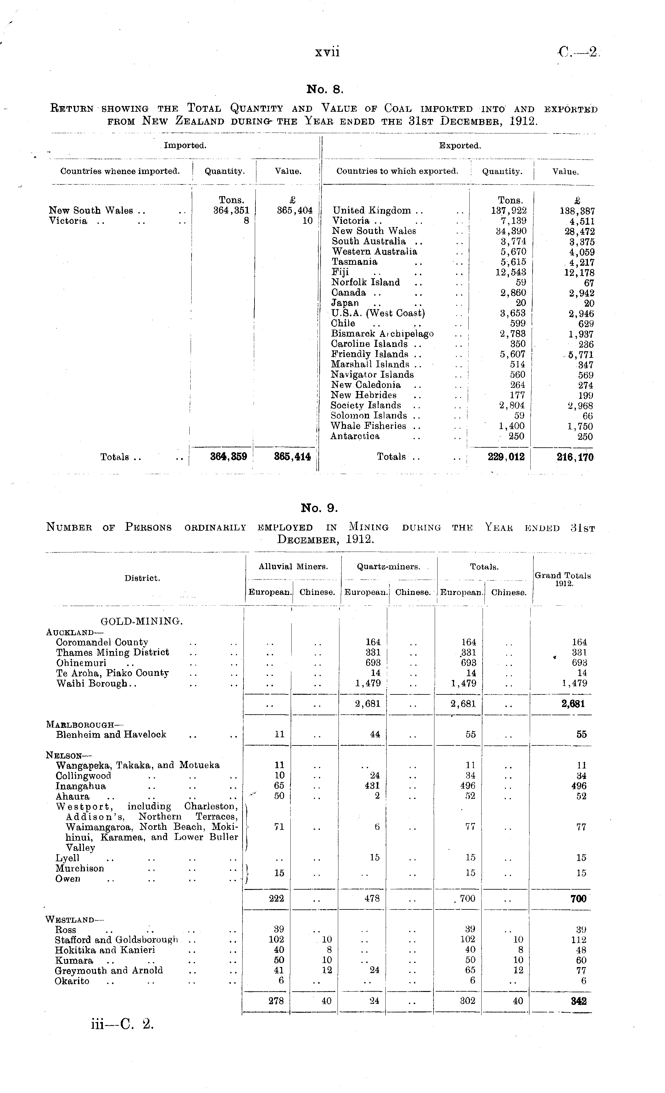 j. o. Return showing the Total Quantity and from New Zealand during the Yi Value of Coal imported into and exportkj ar ended the 31st December, 1912. i Imported. Exported. Countries whence imported. Quantity, j Value. j Countries to which exported. Quantity, j Value. Tons. £ New South Wales .. .. 364,351 365,404 Victoria .. .. .. i 8 10 Tons. £ Tons, i £ New South Wales .. .. 364,351 365,404; United Kingdom .. .. ! 137,922 ! 138,387 Victoria .. .. .. 8 10 Victoria.. .. 7,139 j 4,511 New South Wales ..: 34,390 28,472 South Australia .. .. 3,774 I 3,375 Western Australia .. 5,670 j 4,059 Tasmania .. .. 5,615 4,217 Fiji .. .. .. 12,543 12,178 Norfolk Island .. .. 59 67 Canada .. .. .. 2,860 2,942 Japan .. .. 20 20 U.S.A. (West Coast) 3,653 2,946 Chile .. .. .. | 599 : 629 Bismarck Aichipelago .. , 2,783 j 1,937 Caroline Islands .. .. j 350 I 236 Friendly Islands .. 5,607 5,771 Marshall Islands .. .. 514 347 Navigator Islands .. | 560 569 New Caledonia .. 264 ! 274 New Hebrides .. .. 177 199 Society Islands .. .. 2,804 j 2,968 Solomon Islands .. .. 59 j 66 I Whale Fisheries .. .., 1,400; 1,750 Antarctica .. .. 250 I 250 Totals.. .. 364,359 865,414 Totals.. 229,012 216,170 I j No. 9. Dumber of Persons ordinarily employed in Mining during the Year ended 31st December, 1912. Alluvial Miners. Quartz-miners. | Totals. District. - ! Grand Totals 1SJ12. European.1 Chinese. European.! Chinese. j European.' Chinese, j GOLD-MINING. LUCKLAND — Coromandel County .. .. .. .. 164 .. 164 .. 164 Thames Mining Dfstrict .. .. .. .. 331 I .. .331 .. ,331 Ohinemuri .. .. .. .. .. 693 .. 693 .. 693 Te Aroha, Piako County .. .. .. .. 14 .. 14 14 Waihi Borough.. .. .. .. .. 1,479 .. 1,479 .. 1,479 2,681 ! .. 2,681 .. 2,681 , /Iablbobough— Blenheim and Havelock .. .. 11 .. 44 .. 55 .. 55 Jelson — Wangapeka, Takaka, and Motueka 11 .. .. .. 11 .. 11 Collingwood .. .. .. 10 .. 24 .. 34 .. 34 Inangahua .. .. .. 65 .. 431 .. 496 .. 496 Ahaura .. .. .. .. 50 .. 2 .. 52 .. 52 Westport, including Charleston, \ Addison's, Northern Terraces, Waimangaroa, North Beach, Moki- 71 .. 6 .. 77 77 hinui, Karamea, and Lower Buller Valley j Lyell .. .. .. .. .. .. 15 .. 15 .. 15 Murehison I 15 15 .. 15 Owen .. .. .. .. J 222 .. 478 .700 .. 700 6 77 15 15 15 478 . 700 Vbstland — Ross .. .'. .. .. 39 .. .. .. 39 .. 39 Stafford and Goldsborough .. .. 102 10 .. .. 102 10 112 Hokitika and Kanieri .. .. 40 8 .. .. 40 8 48 Kumara .. .. .. .. 50 10 .. .. 50 10 60 Greymouth and Arnold .. .. 41 12 24 65 12 77 Okarito .. .. .. .. 6 .. .. .. 6 .. 6 10 8 10 12 39 102 40 50 65 6 10 8 10 12 8a 112 48 60 77 6 24 278 40 24 .. 302 40 342 40 24 302 40 342 iii—C. ±