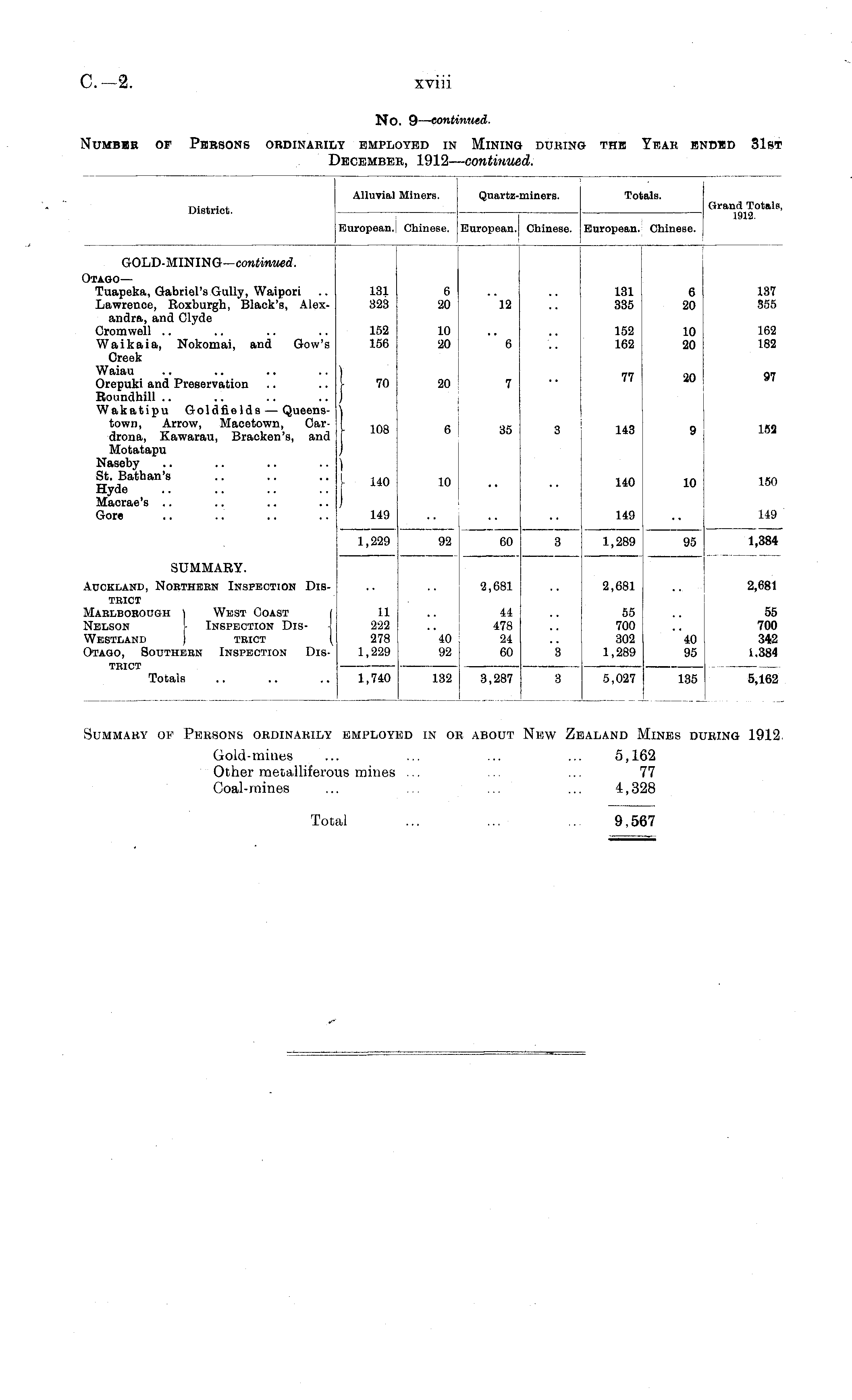 Summary of Persons ordinarily employed in or about New Zealand Mines during 1912. Gold-mines ... ... ... ... 5,162 Other metalliferous mines ... ... ... 77 Coal-mines ... ... ... ... 4,328 Tocal ... ... ... 9,567