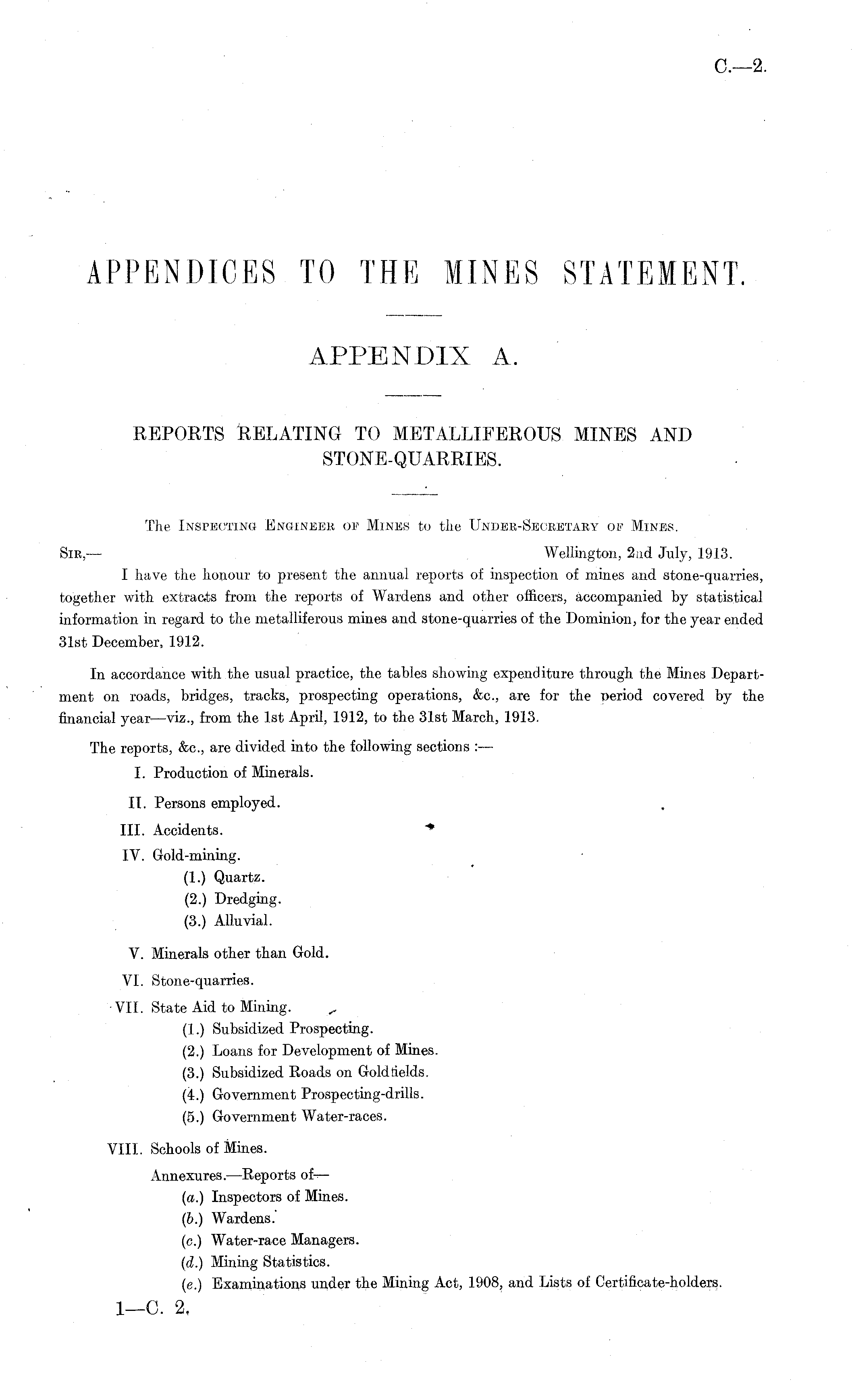The Inspecting Engineer of Mines to the Undee-Seoretaky of Mines. Sir,— Wellington, 2nd July, 1913. I have the honour to present the annual reports of inspection of mines and stone-quarries, together with extracts from the reports of Wardens and other officers, accompanied by statistical information in regard to the metalliferous mines and stone-quarries of the Dominion, for the year ended 31st December, 1912. In accordance with the usual practice, the tables showing expenditure through the Mines Department on roads, bridges, tracks, prospecting operations, &c, are for the period covered by the financial year —viz., from the Ist April, 1912, to the 31st March, 1913. The reports, &c, are divided into the following sections : — I. Production of Minerals. IT. Persons employed. 111. Accidents. "* IV. Gold-mining. (1.) Quartz. (2.) Dredging. (3.) Alluvial. V. Minerals other than Gold. VI. Stone-quarries. VII. State Aid to Mining. (1.) Subsidized Prospecting. (2.) Loans for Development of Mines. (3.) Subsidized Roads on Gold fields. (4.) Government Prospecting-drills. (5.) Government Water-races. VIII. Schools of Mines. Annexures. —Reports (a.) Inspectors of Mines. (b.) Wardens, (c.) Water-race Managers. (d.) Mining Statistics, (c.) Examinations under the Mining Act, 1908, and Lists of Certificate-holders.
