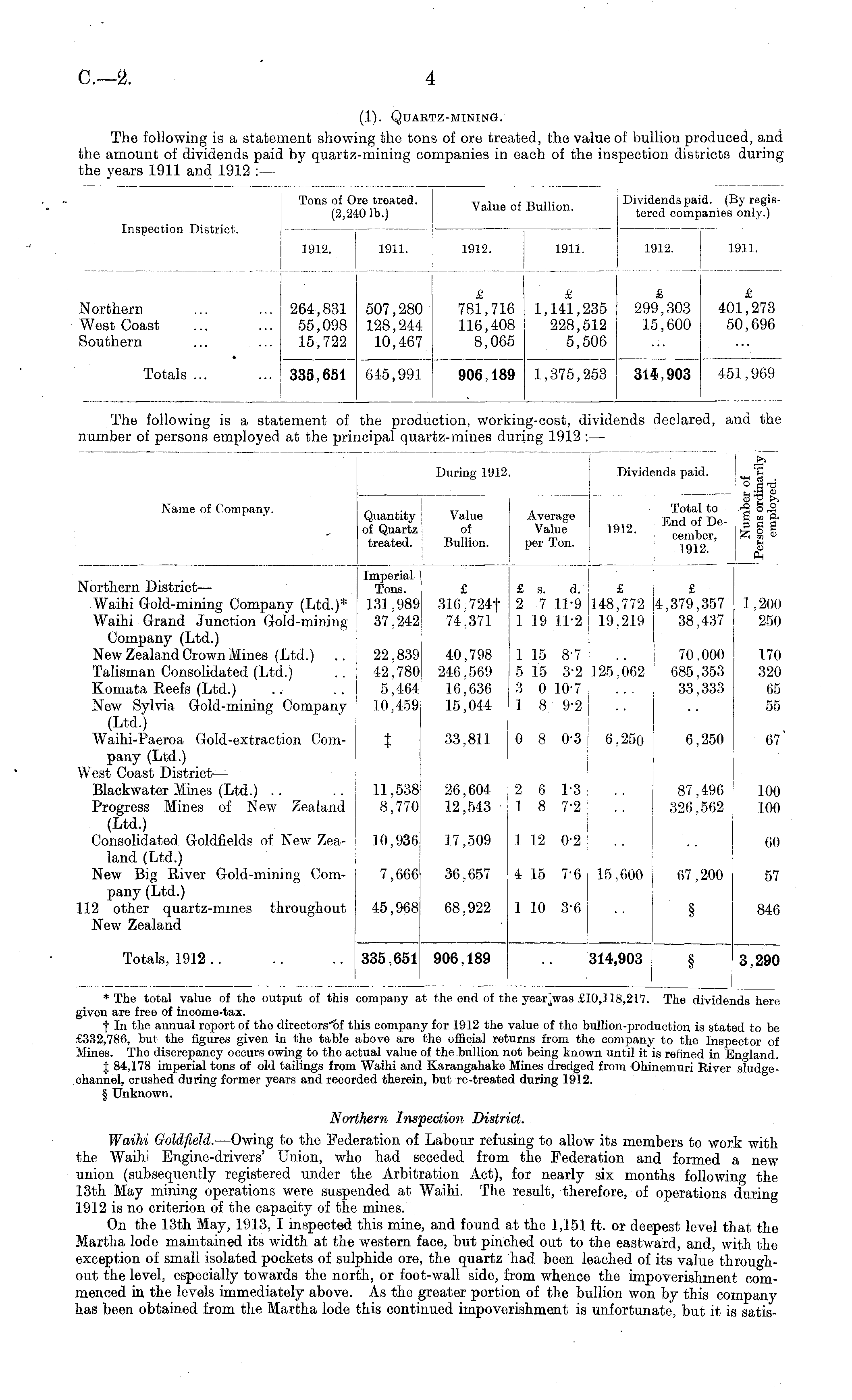 The following is a statement of the production, working-cost, dividends declared, and the number of persons employed at the principal quartz-mines during 1912 : —