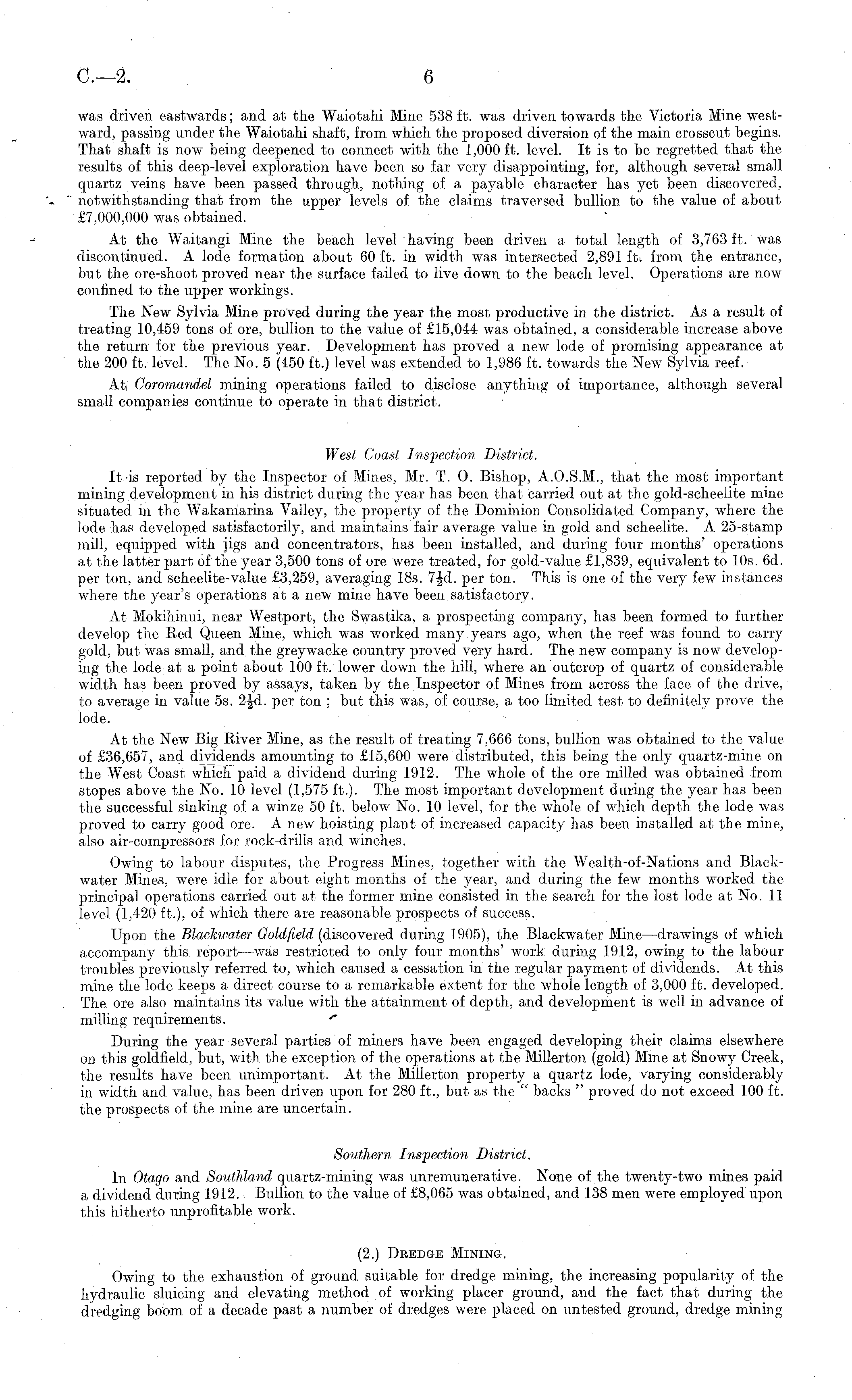 was driven eastwards; and at the Waiotahi Mine 538 ft. was driven towards the Victoria Mine westward, passing under the Waiotahi shaft, from which the proposed diversion of the main crosscut begins. That shaft is now being deepened to connect with the 1,000 ft. level. It is to be regretted that the results of this deep-level exploration have been so far very disappointing, for, although several small quartz veins have been passed through, nothing of a payable character has yet been discovered, notwithstanding that from the upper levels of the claims traversed bullion to the value of about £7,000,000 was obtained. At the Waitangi Mine the beach level having been driven a total length of 3,763 ft. was discontinued. A lode formation about 60 ft. in width was intersected 2,891 ft. from the entrance, but the ore-shoot proved near the surface failed to live down to the beach level. Operations are now confined to the upper workings. The New Sylvia Mine proved during the year the most productive in the district. As a result of treating 10,459 tons of ore, bullion to the value of £15,044 was obtained, a considerable increase above the return for the previous year. Development has proved a new lode of promising appearance at the 200 ft. level. The No. 5 (450 ft.) level was extended to 1,986 ft. towards the New Sylvia reef. At Coromandel mining operations failed to disclose anything of importance, although several small companies continue to operate in that district. West Coast Inspection District. It is reported by the Inspector of Mines, Mr. T. 0. Bishop, A.0.5.M., that the most important mining development in his district during the year has been that carried out at the gold-scheelite mine situated in the Wakamarina Valley, the property of the Dominion Consolidated Company, where the lode has developed satisfactorily, and maintains fair average value in gold and scheelite. A 25-stamp mill, equipped with jigs and concentrators, has been installed, and during four months' operations at the latter part of the year 3,500 tons of ore were treated, for gold-value £1,839, equivalent to 10s. 6d. per ton, and scheelite-value £3,259, averaging 18s. 7|d. per ton. This is one of the very few instances where the year's operations at a new mine have been satisfactory. At Mokihinui, near Westport, the Swastika, a prospecting company, has been formed to further develop the Red Queen Mine, which was worked many years ago, when the reef was found to carry gold, but was small, and the greywacke country proved very hard. The new company is now developing the lode at a point about 100 ft. lower down the hill, where an outcrop of quartz of considerable width has been proved by assays, taken by the Inspector of Mines from across the face of the drive, to average in value ss. 2Jd. per ton ; but this was, of course, a too limited test to definitely prove the lode. At the New Big River Mine, as the result of treating 7,666 tons, bullion was obtained to the value of £36,657, and dividends amounting to £15,600 were distributed, this being the only quartz-mine on the West Coast which paid a dividend during 1912. The whole of the ore milled was obtained from stopes above the No. 10 level (1,575 ft.). The most important development during the year has been the successful sinking of a winze 50 ft. below No. 10 level, for the whole of which depth the lode was proved to carry good ore. A new hoisting plant of increased capacity has been installed at the mine, also air-compressors for rock-drills and winches. Owing to labour disputes, the Progress Mines, together with the Wealth-of-Nations and Blackwater Mines, were idle for about eight months of the year, and. during the few months worked the principal operations carried out at the former mine consisted in the search for the lost lode at No. 11 level (1,420 ft.), of which there are reasonable prospects of success. Upon the Blackwater Goldfield (discovered during 1905), the Blackwater Mme —drawings of which accompany this report —was restricted to only four months' work during 1912, owing to the labour troubles previously referred to, which caused a cessation in the regular payment of dividends. At this mine the lode keeps a direct course to a remarkable extent for the whole length of 3,000 ft. developed. The ore also maintains its value with the attainment of depth, and development is well in advance of milling requirements. During the year several parties of miners have been engaged developing their claims elsewhere on this goldfield, but, with the exception of the operations at the Millerton (gold) Mine at Snowy Creek, the results have been unimportant. At the Millerton property a quartz lode, varying considerably in width, and value, has been driven upon for 280 ft., but as the " backs " proved do not exceed 100 ft. the prospects of the mine are uncertain. Southern Inspection District. In Otago and Southland quartz-mining was unremunerative. None of the twenty-two mines paid a dividend during 1912. Bullion to the value of £8,065 was obtained, and 138 men were employed upon this hitherto unprofitable work. (2.) Dredge Mining. Owing to the exhaustion of ground suitable for dredge mining, the increasing popularity of the hydraulic sluicing and elevating method of working placer ground, and the fact that during the (hedging boom of a decade past a number of dredges were placed on untested ground, dredge mining