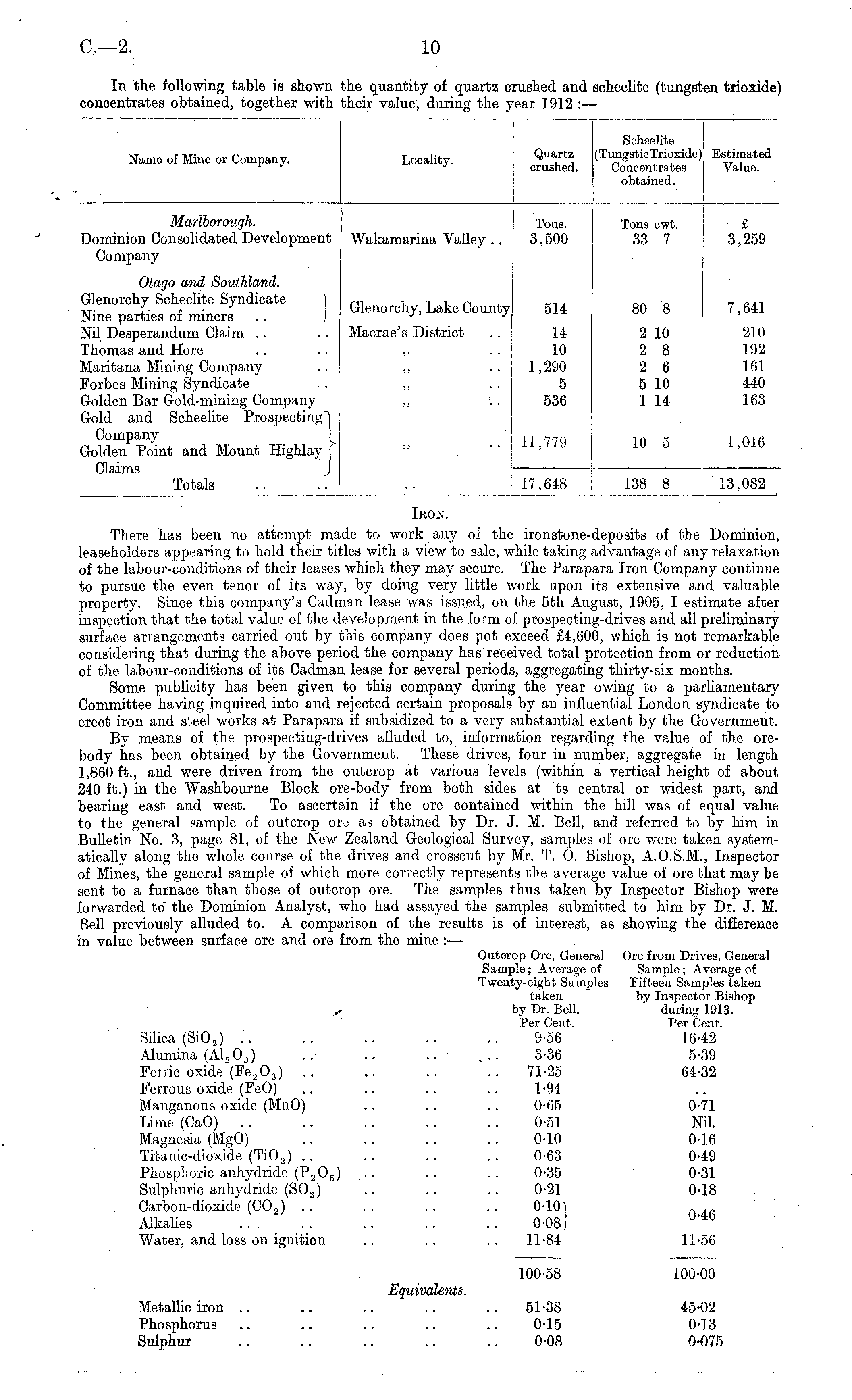 Name of Mine or Company. Locality. Quartz crushed. Scheelite (TungsticTrioxide) Concentrates obtained. Estimated Value. Marlborough. Dominion Consolidated Development Company Wakamarina Valley .. Tons. 3,500 Tons cwt. 33 7 £ 3,259 Otago and Southland. Glenorchy Scheelite Syndicate ) Nine parties of miners .. I Nil Desperandum Claim Thomas and Hore Maritana Mining Company Forbes Mining Syndicate Golden Bar Gold-mining Company Gold and Scheelite Prospecting"] Company I Golden Point and Mount Highlay \ Claims J Glenorchy, Lake County Macrae's District rr • • i rr 514 14 10 1,290 5 536 80 8 2 10 2 8 2 6 5 10 1 14 7,641 210 192 161 440 163 11,779 10 5 1,016 Totals 17,648 138 8 13,082