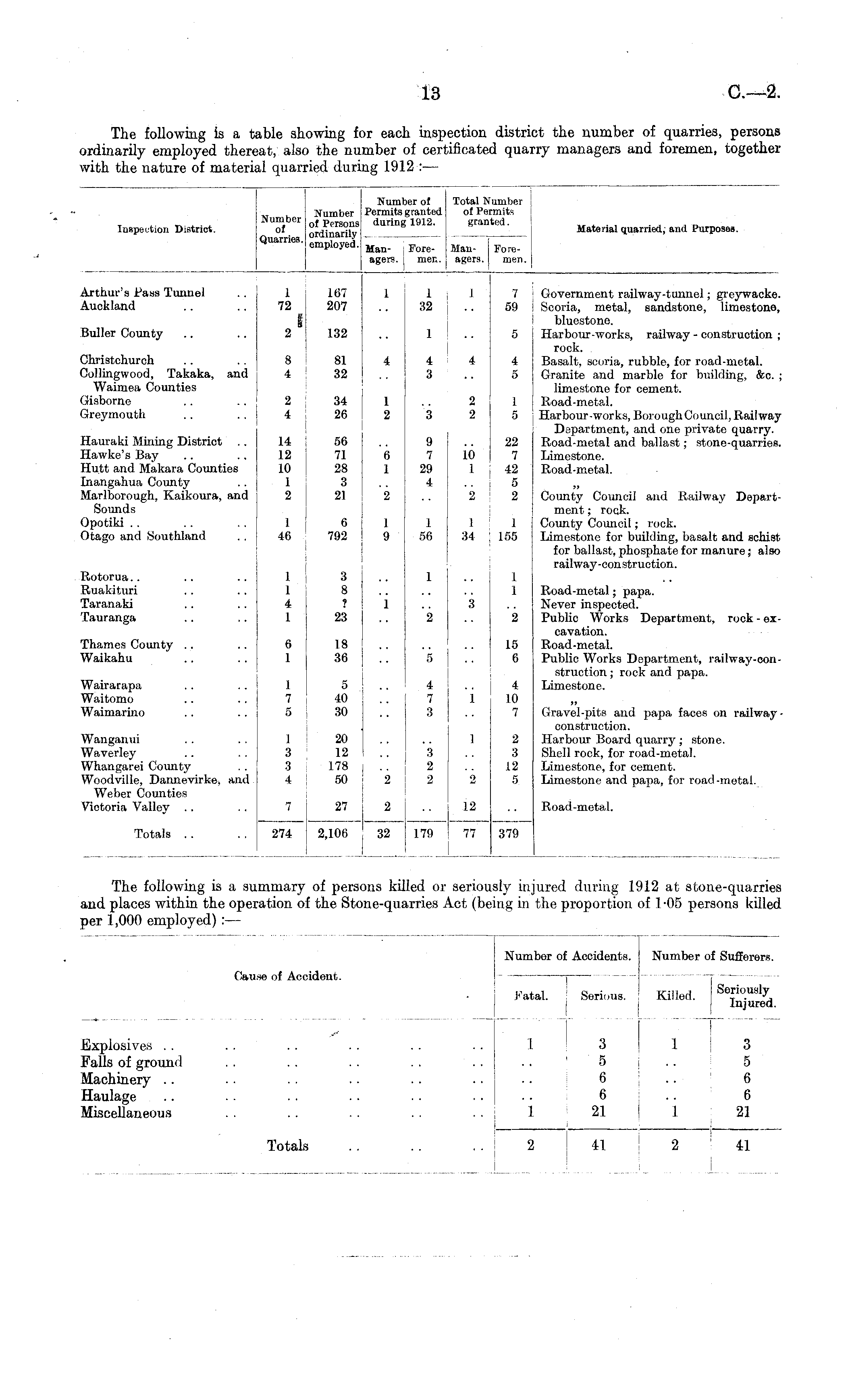The following is a table showing for each inspection district the number of quarries, persons irdinarily employed thereat, also the number of certificated quarry managers and foremen, together nth the nature of material quarried during 1912 : — Inspection District. " r o"ns Number of Total Number Permits granted of Permits during 1912. granted. Man- I Fore- Man- Foreagers. I men., agers. men. Material quarried, and Purposes. Arthur's Pass Tunnel .. 1 , 167 Auckland .. 72 207 I Buller County .. .. 2 132 1 1 1 i 32 1 7 ; Government railway-tunnel; greywacke. 59 ' Scoria, metal, sandstone, limestone, bluestone. 5 Harbour-works, railway - construction ; rock. 4 Basalt, scoria, rubble, for road-metal. 5 Granite and marble for building, &c. ; limestone for cement. 1 | Road-metal. 5 j Harbour-works, Borough Council, Railway Department, and one private quarry. 22 Road-metal and ballast; stone-quarries. 7 Limestone. j 42 Road-metal. 5 2 County Council and Railway Department ; rock. 1 County Council; rock. 155 Limestone for building, basalt and schist for ballast, phosphate for manure; also railway-construction. Christchurch .. .. 8 81 Collingwood, Takaka, and 4 32 Waimea Counties Gisborne .. .. 2 34 I Greymouth .. .. 4 26 4 1 2 i 4 4 3 2 3 2 1 2 Hauraki Mining District .. 14 56 Hawke's Bay .. .. 12 71 Hutt and Makara Counties 10 28 Inangahua County .. 1 3 Marlborough, Kaikoura, and 2 21 Sounds Opotiki .. .. .. 1 6 Otago and Southland .. 46 792 6 1 2 1 9 6 1 2 9 7 10 29 1 4 -2 1 1 56 34 1 9 Rotorua.. .. .. 1 3 Ruakituri .. .. 1 8 Taranaki .. .. 4 ? Tauranga .. .. 1 23 1 1 3 2 1 1 Road-metal; papa. Never inspected. 2 Public Works Department, rock - excavation. 15 Road-metal. 6 Public Works Department, railway-con-struction ; rock and papa. 4 Limestone. 10 7 Gravel-pits and papa faces on railway - construction. 2 Harbour Board quarry ; stone. 3 Shell rock, for road-metal. 12 Limestone, for cement. 5 Limestone and papa, for road-metal. Thames County .. .. 6 18 Waikahu .. .. 1 36 5 '.'. Wairarapa .. .. 1 5 Waitomo .. .. 7 40 Waimarino .. .. 5 30 4 7 1 3 Wanganui .. .. 1 20 Waverley .. .. 3 12 Whangarei County .. j 3 178 j Woodville, Dannevirke, and 4 50 Weber Counties Victoria Valley .. . . 7 27 I 2 2 1 3 2 2 2 12 Road-metal. Totals . . .. 274 2,106 32 179 77 379 The following is a summary of perse and places within the operation of the Sto: per 1,000 employed) : — ons kili me-qua lied or serious arries Act (bei isly injured during 1912 at stone-quarries iing in the proportion of 1-05 persons killed Cause of Accident. Number of Accidents. Number of Sufferers. Number of Sufferers. I ... i _ , . SerimiMlv Fatal. : Serious. Killed. »™<y Killed. Seriously Injured. Explosives Falls of ground Machinery Haulage Miscellaneous Injured. 13 13 .. ! 5 j .. 5 6 6 6 6 1 21 1 21 '" ! 1 3 5 6 6 1 21 Totals 2 41 2 41