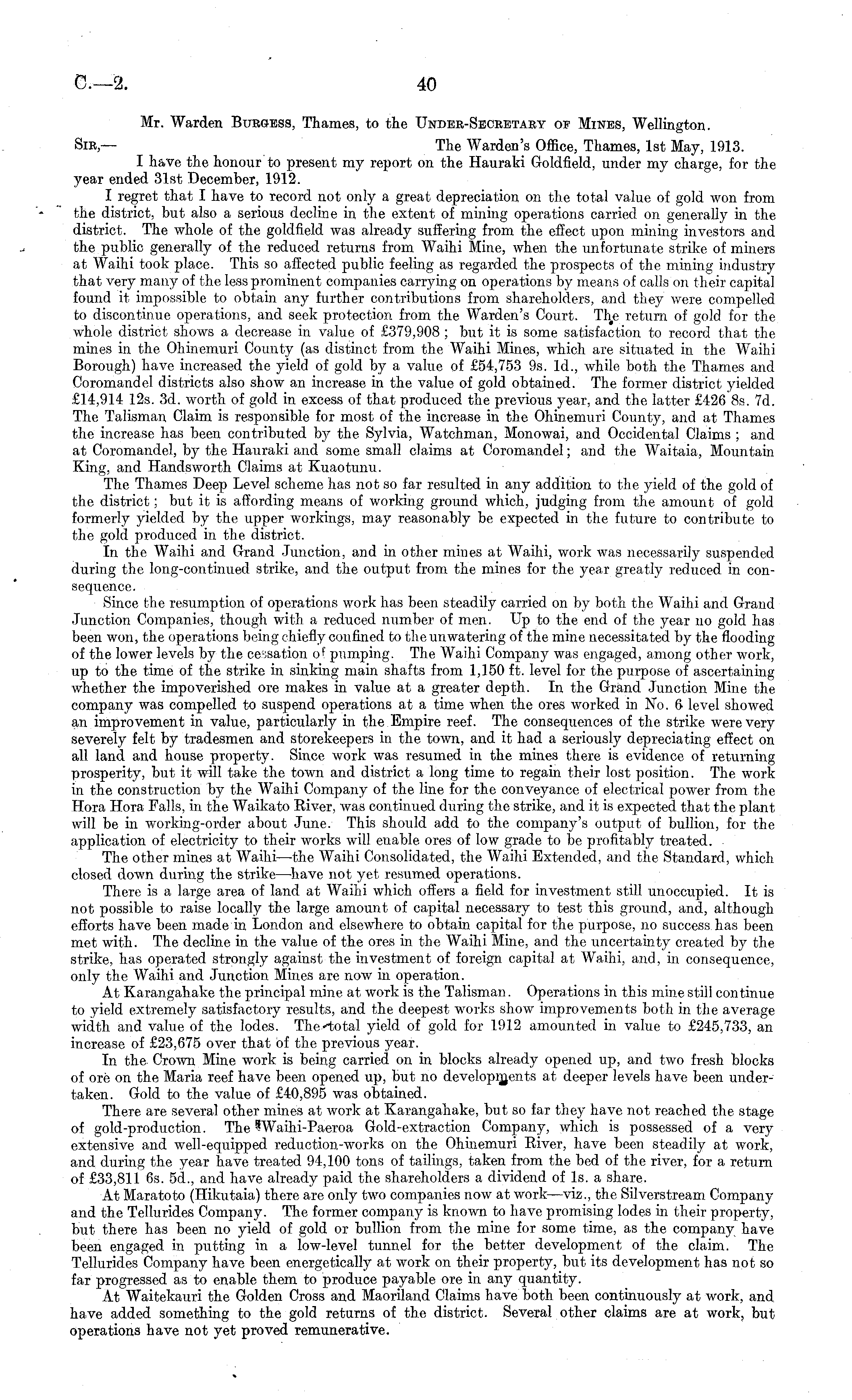 Mr. Warden Burgess, Thames, to the Under-Secretary of Mines, Wellington. Sir,— The Warden's Office, Thames, Ist May, 1913. I have the honour to present my report on the Hauraki Goldfield, under my charge, for the year ended 31st December, 1912. I regret that I have to record not only a great depreciation on the total value of gold won from the district, but also a serious decline in the extent of mining operations carried on generally in the district. The whole of the goldfield was already suffering from the effect upon mining investors and the public generally of the reduced returns from Waihi Mine, when the unfortunate strike of miners at Waihi took place. This so affected public feeling as regarded the prospects of the mining industry that very many of the less prominent companies carrying on operations by means of calls on their capital found it impossible to obtain any further contributions from shareholders, and they were compelled to discontinue operations, and seek protection from the Warden's Court. Ttyj return of gold for the whole district shows a decrease in value of £379,908 ; but it is some satisfaction to record that the mines in the Ohinemuri County (as distinct from the Waihi Mines, which are situated in the Waihi Borough) have increased the yield of gold by a value of £54,753 9s. Id., while both the Thames and Coromandel districts also show an increase in the value of gold obtained. The former district yielded £14,914 12s. 3d. worth of gold in excess of that produced the previous year, and the latter £426 Bs. 7d. The Talisman Claim is responsible for most of the increase in the Ohinemuri County, and at Thames the increase has been contributed by the Sylvia, Watchman, Monowai, and Occidental Claims ; and at Coromandel, by the Hauraki and some small claims at Coromandel; and the Waitaia, Mountain King, and Handsworth Claims at Kuaotunu. The Thames Deep Level scheme has not so far resulted in any addition to the yield of the gold of the district; but it is affording means of working ground which, judging from the amount of gold formerly yielded by the upper workings, may reasonably be expected in the future to contribute to the gold, produced in the. district. In the Waihi and Grand Junction, and in other mines at Waihi, work was necessarily suspended during the long-continued strike, and the output from the mines for the year greatly reduced in consequence. Since the resumption of operations work has been steadily carried on by both the Waihi and Grand Junction Companies, though with a reduced number of men. Up to the end of the year no gold has been won, the operations being chiefly confined to the unwatering of the mine necessitated by the flooding of the lower levels by the cessation of pumping. The Waihi Company was engaged, among other work, up to the time of the strike in sinking main shafts from 1,150 ft. level for the purpose of ascertaining whether the impoverished ore makes in value at a greater depth. In the Grand Junction Mine the company was compelled to suspend operations at a time when the ores worked in No. 6 level showed an improvement in value, particularly in the Empire reef. The consequences of the strike were very severely felt by tradesmen and storekeepers in the town, and it had a seriously depreciating effect on all land and house property. Since work was resumed in the mines there is evidence of returning prosperity, but it will take the town and district a long time to regain their lost position. The work in the construction by the Waihi Company of the line for the conveyance of electrical power from the Hora Hora Falls, in the Waikato River, was continued during the strike, and it is expected that the plant will be in working-order about June. This should add to the company's output of bullion, for the application of electricity to their works will enable ores of low grade to be profitably treated. The other mines at Waihi —the Waihi Consolidated, the Waihi Extended, and the Standard, which closed down during the strike—have not yet resumed operations. There is a large area of land at Waihi which offers a field for investment still unoccupied. It is not possible to raise locally the large amount of capital necessary to test this ground, and., although efforts have been made in London and elsewhere to obtain capital for the purpose, no success has been met with. The decline in the value of the ores in the Waihi Mine, and the uncertainty created by the strike, has operated strongly against the investment of foreign capital at Waihi, and, in consequence, only the Waihi and Junction Mines are now in operation. At Karangahake the principal mine at work is the Talisman. Operations in this mine still continue to yield extremely satisfactory results, and the deepest works show improvements both in the average width and value of the lodes. The'total yield of gold for 1912 amounted in value to £245,733, an increase of £23,675 over that of the previous year. In the Crown Mine work is being carried on in blocks already opened up, and two fresh blocks of ore on the Maria reef have been opened up, but no developments at deeper levels have been undertaken. Gold to the value of £40,895 was obtained. There are several other mines at work at Karangahake, but so far they have not reached the stage of gold-production. The Gold-extraction Company, which is possessed of a very extensive and well-equipped reduction-works on the Ohinemuri River, have been steadily at work, and during the year have treated 94,100 tons of tailings, taken from the bed of the river, for a return of £33,811 6s. 5d., and have already paid the shareholders a dividend of Is. a share. At Maratoto (Hikutaia) there are only two companies now at work —viz., the Silverstream Company and the Tellurides Company. The former company is known to have promising lodes in their property, but there has been no yield of gold or bullion from the mine for some time, as the company have been eng