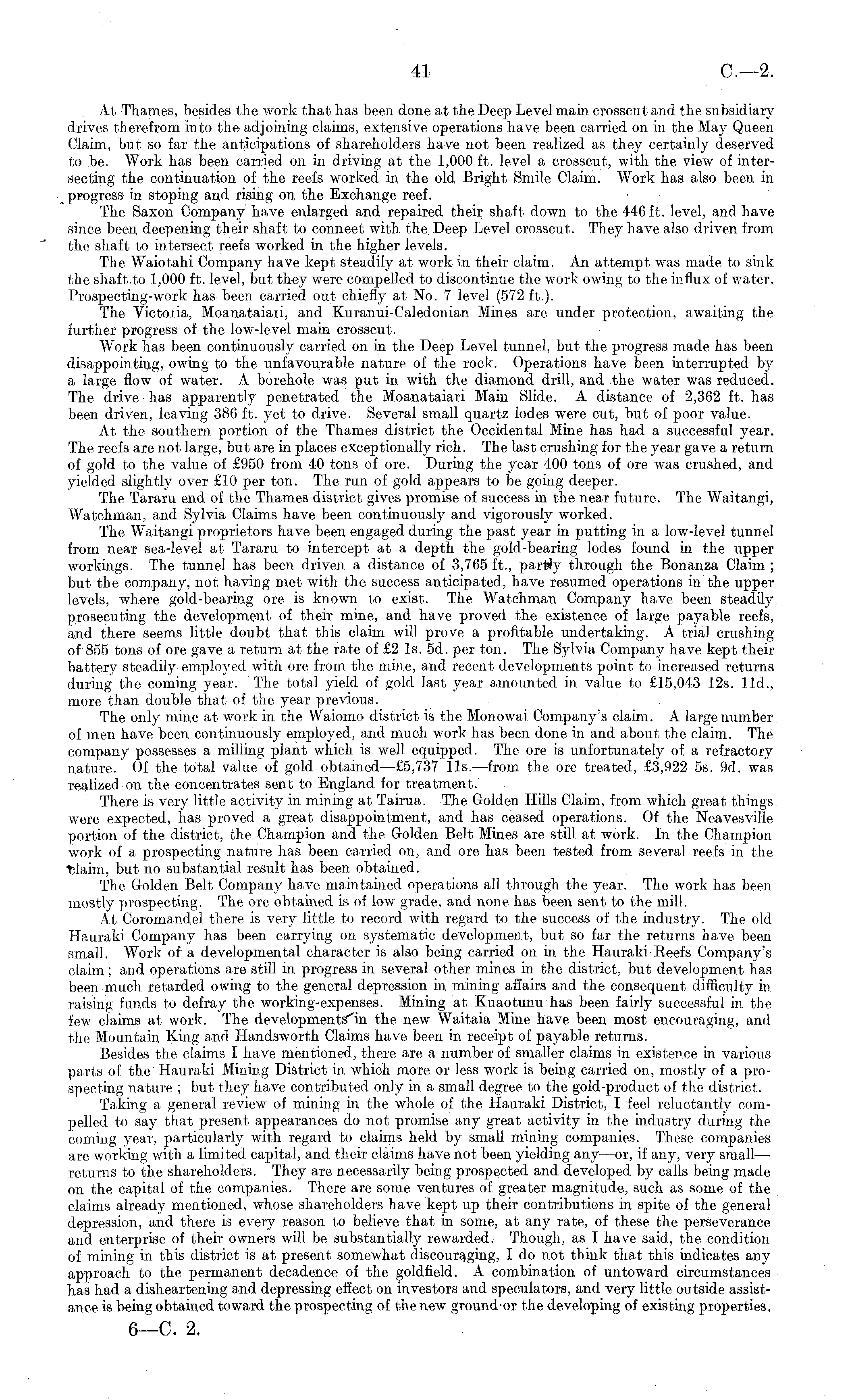 At Thames, besides the work that has been done at the Deep Level main crosscut and the subsidiary drives therefrom into the adjoining claims, extensive operations have been carried on in the May Queen Claim, but so far the anticipations of shareholders have not been realized as they certainly deserved to be. Work has been carried on in driving at the 1,000 ft. level a crosscut, with the view of intersecting the continuation of the reefs worked in the old Bright Smile Claim. Work has also been in progress in stoping and rising on the Exchange reef. The Saxon Company have enlarged and repaired their shaft down to the 446 ft. level, and have since been deepening their shaft to connect with the Deep Level crosscut. They have also driven from the shaft to intersect reefs worked in the higher levels. The Waiotahi Company have kept steadily at work in their claim. An attempt was made to sink the shaft.to 1,000 ft. level, but they were compelled to discontinue the work owing to the influx of water. Prospecting-work has been carried out chiefly at No. 7 level (572 ft.). The Victoria, Moanataiari, and Kuranui-Caledonian Mines are under protection, awaiting the further progress of the low-level main crosscut. Work has been continuously carried on in the Deep Level tunnel, but the progress made has been disappointing, owing to the unfavourable nature of the rock. Operations have been interrupted by a large flow of water. A borehole was put in with the diamond drill, and .the water was reduced. The drive has apparently penetrated the Moanataiari Main Slide. A distance of 2,362 ft. has been driven, leaving 386 ft. yet to drive. Several small quartz lodes were cut, but of poor value. At the southern portion of the Thames district the Occidental Mine has had a successful year. The reefs are not large, but are in places exceptionally rich. The last crushing for the year gave a return of gold to the value of £950 from 40 tons of ore. During the year 400 tons of ore was crushed, and yielded slightly over £10 per ton. The run of gold appears to be going deeper. The Tararu end of the Thames district gives promise of success in the near future. The Waitangi, Watchman, and Sylvia Claims have been continuously and vigorously worked. The Waitangi proprietors have been engaged during the past year in putting in a low-level tunnel from near sea-level at Tararu to intercept at a depth the gold-bearing lodes found in the upper workings. The tunnel has been driven a distance of 3,765 ft., partly through the Bonanza Claim ; but the company, not having met with the success anticipated, have resumed operations in the upper levels, where gold-bearing ore is known to exist. The Watchman Company have been steadily prosecuting the development of their mine, and have proved the existence of large payable reefs, and there seems little doubt that this claim will prove a profitable undertaking. A trial crushing of 855 tons of ore gave a return at the rate of £2 Is. sd. per ton. The Sylvia Company have kept their battery steadily employed with ore from the mine, and recent developments point to increased returns during the coming year. The total yield of gold last year amounted in value to £15,043 12s. lid., more than double that of the year previous. The only mine at work in the Waiomo district is the Monowai Company's claim. A large number of men have been continuously employed, and much work has been done in and about the claim. The company possesses a milling plant which is well equipped. The ore is unfortunately of a refractory nature. Of the total value of gold obtained —£5,737 lis.—from the ore treated, £3,922 ss. 9d. was realized on the concentrates sent to England for treatment. . There is very little activity in mining at Tairua. The Golden Hills Claim, from which great things were expected, has proved a great disappointment, and has ceased operations. Of the Neavesville portion of the district, the Champion and the Golden Belt Mines are still, at work. In the Champion work of a prospecting nature has been carried on, and ore has been tested from several reefs in the Tslaim, but no substantial result has been obtained. The Golden Belt Company have maintained operations all through the year. The work has been mostly prospecting. The ore obtained is of low grade, and none has been sent to the mill. At Coromandel there is very little to record with regard to the success of the industry. The old Hauraki Company has been carrying on systematic development, but so far the returns have been small. Work of a developmental character is also being carried on in the Hauraki Beefs Company's claim; and operations are still in progress in several other mines in the district, but development has been much retarded owing to the general depression in mining affairs and the consequent difficulty in raising funds to defray the working-expenses. Mining at Kuaotunu has been fairly successful in the few claims at work. The the new Waitaia Mine have been most encouraging, and the Mountain King and Handsworth Claims have been in receipt of payable returns. Besides the claims I have mentioned, there are a number of smaller claims in existence in various parts of the Hauraki Mining District in which more or less work is being carried on, mostly of a prospecting nature ; but they have contributed only in a small degree to the gold-product of the district. Taking a general review of mining in the whole of the Hauraki District, I feel reluctantly compelled to say that present appearances do not promise any great activity in the industry during the coming year, particularly with regard to claims held by small mining companies. These companies are working with a limited capital, and their claims have not been yielding any —or, if any, very small — returns to the shareholders. They are necessarily being prospected and developed by calls being made on the capital of the companies. There are some ventures of greater magnitude, such as som
