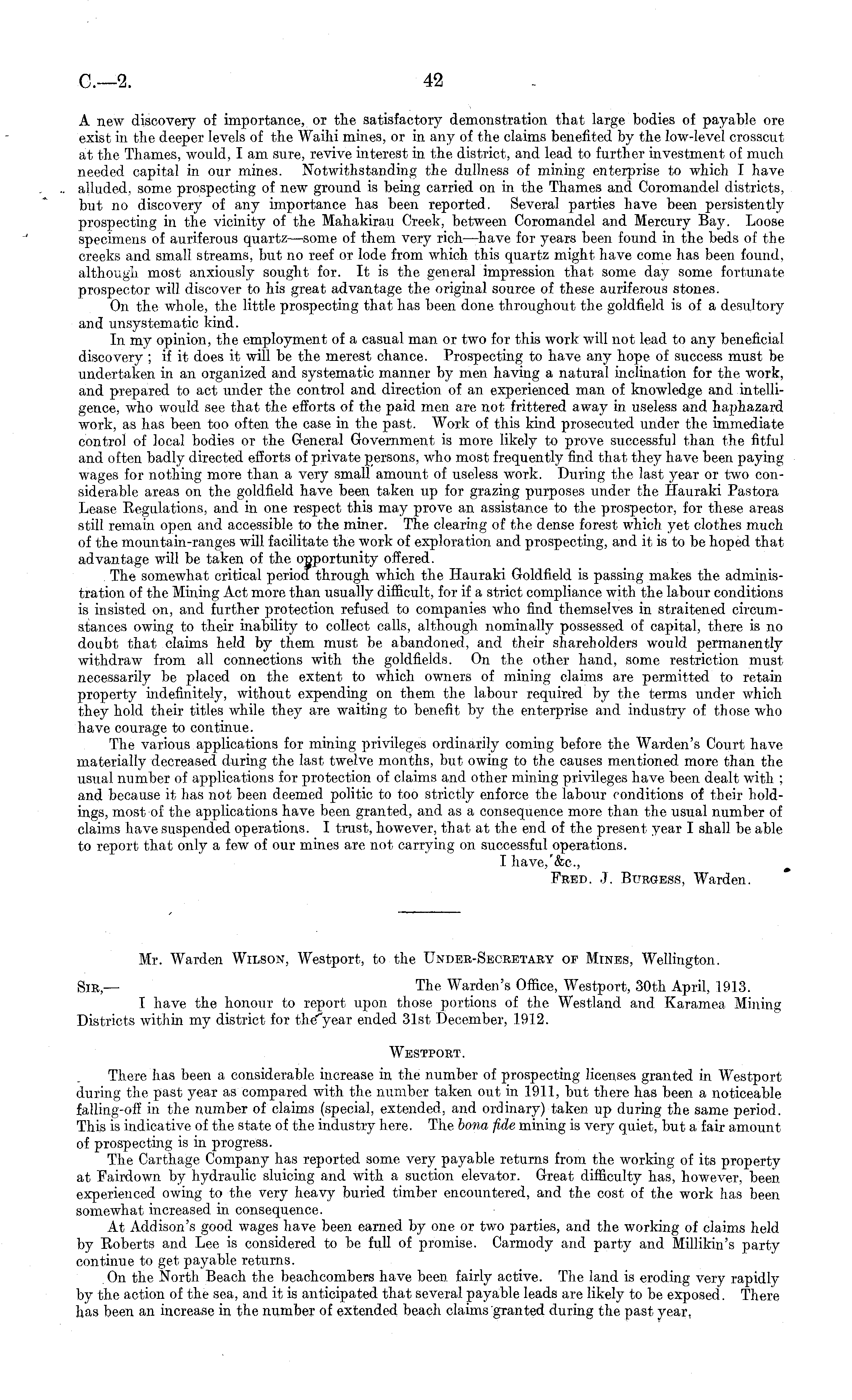 Mr. Warden Wilson, Westport, to the Undee-Secretary of Mines, Wellington. Sir,— The Warden's Office, Westport, 30th April, 1913. I have the honour to report upon those portions of the Westland and Karamea Mining Districts within my district for ended 31st December, 1912. Westport. There has been a considerable increase in the number of prospecting licenses granted in Westport during the past year as compared with the number taken out in 1911, but there has been a noticeable falling-off in the number of claims (special, extended, and ordinary) taken up during the same period. This is indicative of the state of the industry here. The bona fide mining is very quiet, but a fair amount of prospecting is in progress. The Carthage Company has reported some very payable returns from the working of its property at Fairdown by hydraulic sluicing and with a suction elevator. Great difficulty has, however, been experienced owing to the very heavy buried timber encountered, and the cost of the work has been somewhat increased in consequence. At Addison's good wages have been earned by one or two parties, and the working of claims held by Roberts and Lee is considered to be full of promise. Carmody and party and Millikin's party continue to get payable returns. On the North Beach the beachcombers have been fairly active. The land is eroding very rapidly by the action of the sea, and it is anticipated that several payable leads are likely to be exposed. There has been an increase in the number of extended beach claims granted during the past year,