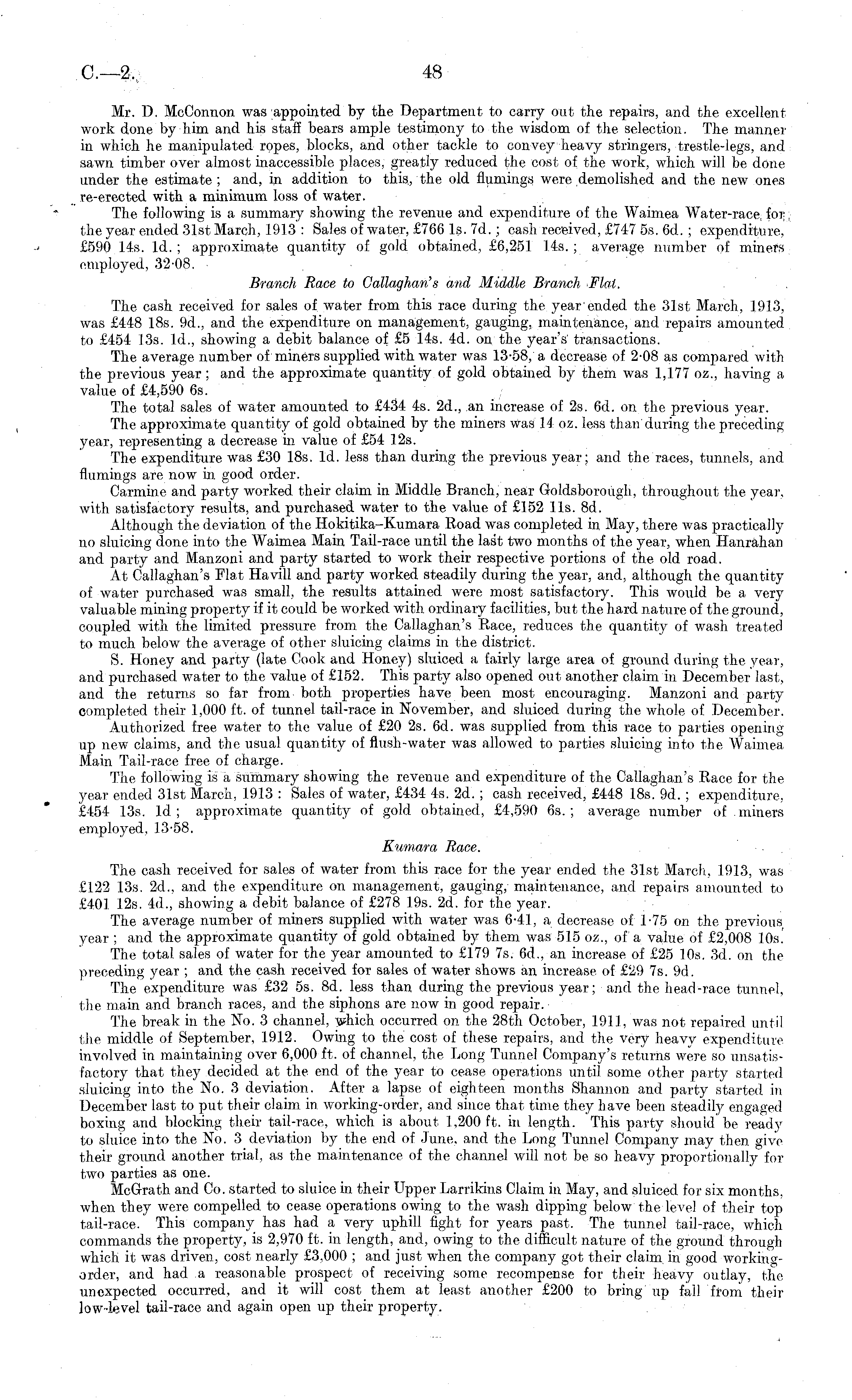 Mr. T). McConnon was appointed by the Department to carry out the repairs, and the excellent work done by him and his staff bears ample testimony to the wisdom of the selection. The manner in which he manipulated ropes, blocks, and other tackle to convey heavy stringers, trestle-legs, and sawn timber over almost inaccessible places, greatly reduced the cost, of the work, which will be done under the estimate ; and, in addition to this,, the old flumings were demolished and the new ones re-erected with a minimum loss of water. The following is a summary showing the revenue and expenditure of the Waimea Water-race for the year ended 31st March, 1913 : Sales of water, £766 Is. 7d.; cash received, £747 ss. 6d. ; expenditure, £590 14s. Id. ; approximate quantity of gold obtained, £6,251 1.45. ; average number of miners employed, 32-08. Branch Race to Callaghan , s and Middle Branch Flat. The cash received for sales of water from this race during the year , ended the 31st March, 1913, was £448 18s. 9d., and the expenditure on management, gauging, maintenance, and repairs amounted to £454 13s. Id., showing a debit balance of £5 14s. 4d. on the year's transactions. The average number of miners supplied with water was 13-58, a decrease of 2-08 as compared with the previous year ; and the approximate quantity of gold obtained by them was 1,177 oz., having a value of £4,590 6s. The total sales of water amounted to £434 4s. 2d., an increase of 2s. 6d. on the previous year. The approximate quantity of gold obtained by the miners was 14 oz. less than during the preceding year, representing a decrease in value of £54 12s. The expenditure was £30 18s. Id. less than during the previous year; and the races, tunnels, and flumings are now in good order. Carmine and party worked their claim in Middle Branch, near Gtoldsborough, throughout the year, with satisfactory results, and purchased water to the value of £152 11s. Bd. Although the deviation of the Hokitika-Kumara Road was completed in May, there was practically no sluicing done into the Waimea Main Tail-race until the last two months of the year, when Hanrahan and party and Manzoni and party started to work their respective portions of the old road. At Callaghan's Flat Havill and party worked steadily during the year, and, although the quantity of water purchased was small, the results attained were most satisfactory. This would be a very valuable mining property if it could be worked with ordinary facilities, but the hard nature of the ground, coupled with the limited pressure from the Callaghan's Race, reduces the quantity of wash treated to much below the average of other sluicing claims in the district. S. Honey and party (late Cook and Honey) sluiced a fairly large area of ground during the year, and purchased water to the value of £152. This party also opened out another claim in December last, and the returns so far from both properties have been most encouraging. Manzoni and party completed their 1,000 ft. of tunnel tail-race in November, and sluiced during the whole of December. Authorized free water to the value of £20 2s. 6d. was supplied from this race to parties opening up new claims, and the usual quantity of flush-water was allowed to parties sluicing into the Waimea Main Tail-race free of charge. The following is a summary showing the revenue and expenditure of the Callaghan's Race for the year ended 31st March, 1913 : Sales of water, £434 4s. 2d. ; cash received, £448 18s. 9d. ; expenditure, £454 13s. Id ; approximate quantity of gold obtained, £4,590 6s. ; average number of miners employed, 13-58. Kumar a Race. The cash received for sales of water from this race for the year ended the 31st March, 1913, was £122 13s. 2d., and the expenditure on management, gauging, maintenance, and repairs amounted to £401 12s. 4d., showing a debit balance of £278 19s. 2d. for the year. The average number of miners supplied with water was 6-41, a decrease of 1-75 on the, previous year ; and the approximate quantity of gold obtained by them was 515 oz., of a value of £2,008 10s.' The total sales of water for the year amounted to £179 7s. 6d., an increase of £25 10s. 3d. on the preceding year ; and the cash received for sales of water shows an increase of £29 7s. 9d. The expenditure was £32 ss. Bd. less than during the previous year; and the head-race tunnel, the main and branch races, and the siphons are now in good repair. The break in the No. 3 channel, which occurred on the 28th October, 1911, was not repaired until the middle of September, 1912. Owing to the cost of these repairs, and the very heavy expenditure involved in maintaining over 6,000 ft. of channel, the Long Tunnel Company's returns were so unsatisfactory that they decided at the end of the year to cease operations until some other party started sluicing into the No. 3 deviation. After a lapse of eighteen months Shannon and party started in December last to put their claim in working-order, and since that time they have been steadily engaged boxing and blocking their tail-race, which is about 1,200 ft. in length. This party should be ready to sluice into the No. 3 deviation by the end of June, and the Long Tunnel Company may then give their ground another trial, as the maintenance of the channel will not be so heavy proportionally for two parties as one. McGrath and Co. started to sluice in their Upper Larrikins Claim in May, and sluiced for six months, when they were compelled to cease operations owing to the wash dipping below the level of their top tail-race. This company has had a very uphill fight for years past. The tunnel tail-race, which commands the property, is 2,970 ft. in length, and, owing to the difficult nature of the ground through which it was driven, cost nearly £3,000 ; and just when the company got their claim in good workingorder, and had a reasonable prospect of receiving some recompense for their heavy outlay, the unexpected occurred, and