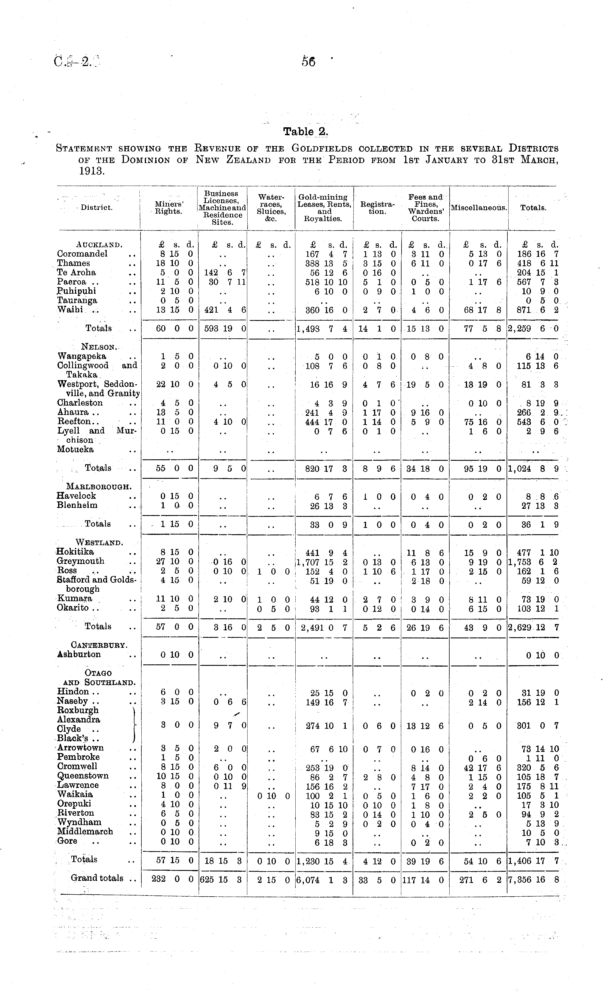 Table 2. Statement showing the Revenue of the Goldfields collected in the several Districts of the Dominion of New Zealand for the Period from 1st January to 31st March, 1913.