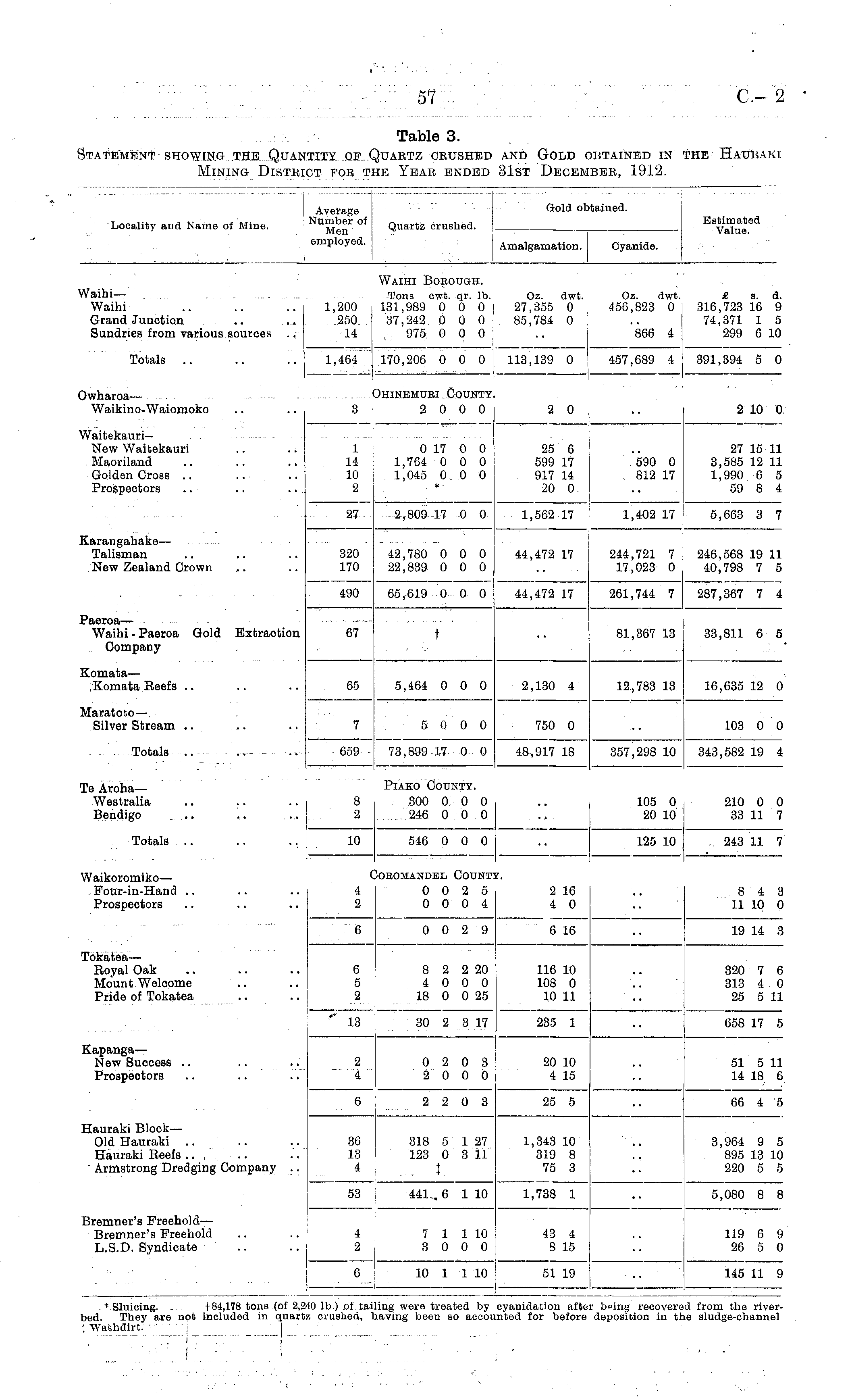 Table 3. Statement showing the Quantity of Quartz crushed and Gold obtained in the Hauraki Mining District for the Year ended 31st December, 1912.