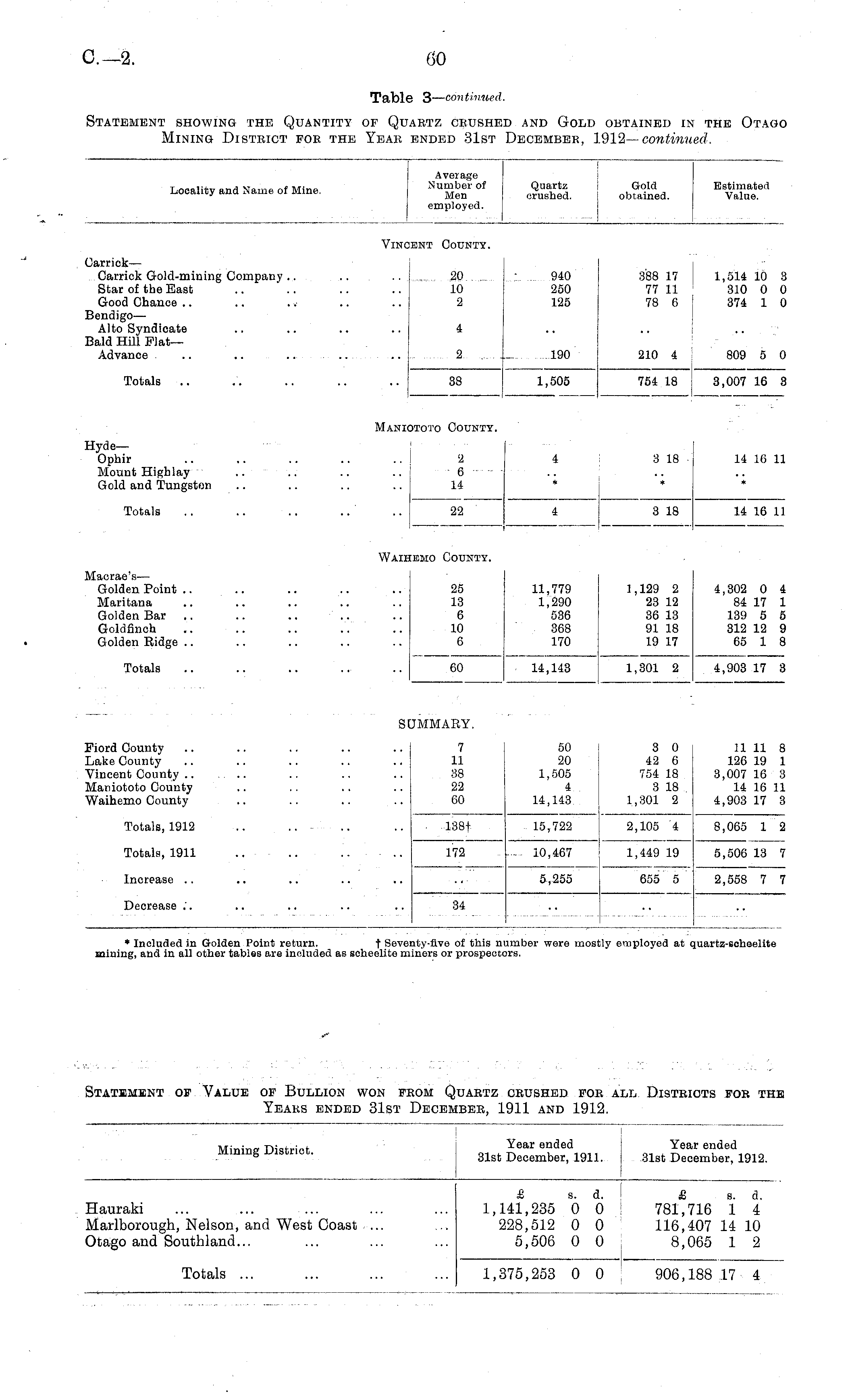 Table 3—continued. Statement showing the Quantity of Quartz crushed and Gold obtained in the Otago Mining District for the Year ended 31st December, 1912— continued.