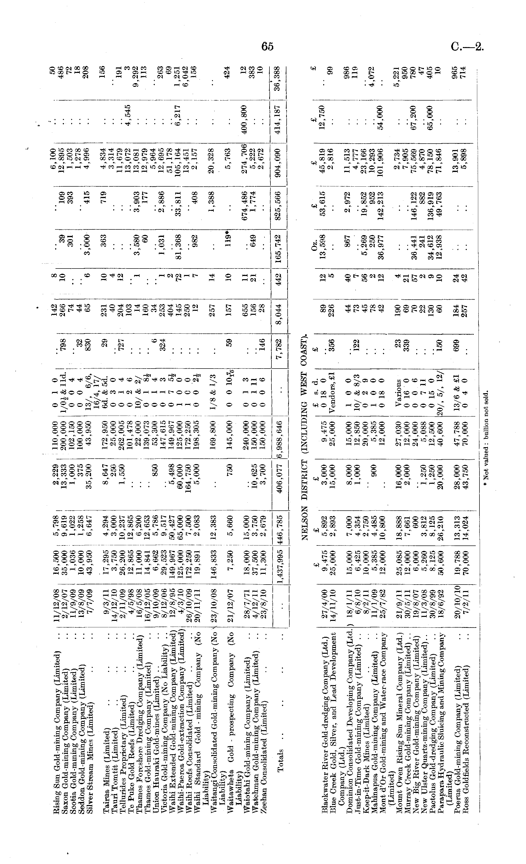 Blackwater River Gold-dredging Company (Ltd.) Blue Creek Gold, Silver, and Lead Development Company (Ltd.) Dominion Consolidated Developing Company (Ltd. Just-in-Time Gold-mining Company (Limited) . . Keep-it-Dark Mines (Limited) Mahinapua Gold-mining Company (Limited) Mont d'Or Gold-mining and AYater-raee Company (Limited) Mount Owen Rising Sun Mineral Company (Ltd.) Murray Creek Gold-mining Company (Limited) .. New Big River Gold-mining Company (Limited) New Ulster Quartz-mining Company (Limited).. Pactolus Gold-dredging Company (Limited) Parapara Hydraulic Sluicing and Mining Companj' (Limited) Poerua Gold-mining Company (Limited) Ross Goldfields Reconstructed (Limited) 27/4/00 14/11/10 £ 9,475 25,000 5,892 2,893 3,000 15,000 9,475 25,000 £ s. d. 0 18 0 Vendors, £1 356 89 226 12 5 13,598 -*._ i 53,615 45,819 2,816 12,750 99 ) 18/1/H 6/8/10 8/2/11 11/1/09 25/7/82 15,000 6,425 10,000 5,385 12,000 7,000 4,354 2,750 4,485 10,800 8,000 1,000 15,000 12,850 20,000 5,385 12,000 1 0 0 10/ & 8/3 0 2 9 1 0 0 0 18 0 122 44 73 45 78 42 40 56 2 12 867 2,972 19^852 952 142,213 11,513 4,777 23,166 10,293 101.906 986 119 900 5,269 250 36,977 54,000 4,072 21/9/11 30/5/11 19/8/07 11/3/08 30/8/99 18/6/92 25,085 12,000 6.000 5,260 8,125 50,600 18,888 7,661 600 3,812 8,125 26,210 16,000 2,000 1,250 1,250 20.000 27,030 12,000 24,000 5,088 12,500 40,600 Various 0 16 0 0 0 6 0 7 11 0 15 0 20/, 5/, 12/ 23 339 190 69 70 22 130 60 4 21 57 2 9 10 36,441 241 34,612 12,938 146,122 882 136,919 49.763 2,734 7,905 75,569 4,870 78,150 71,846 67,200 5,221 950 780 47 405 10 65,000 iso 20/10/10 7/2/11 19,788 70,000 13,313 14,024 28,000 43,750 47,788 70,000 13/6 & £1 0 4 0 699 184 257 24 42 13,901 5,898 965 714 * Not val [ued : bullion not sold.