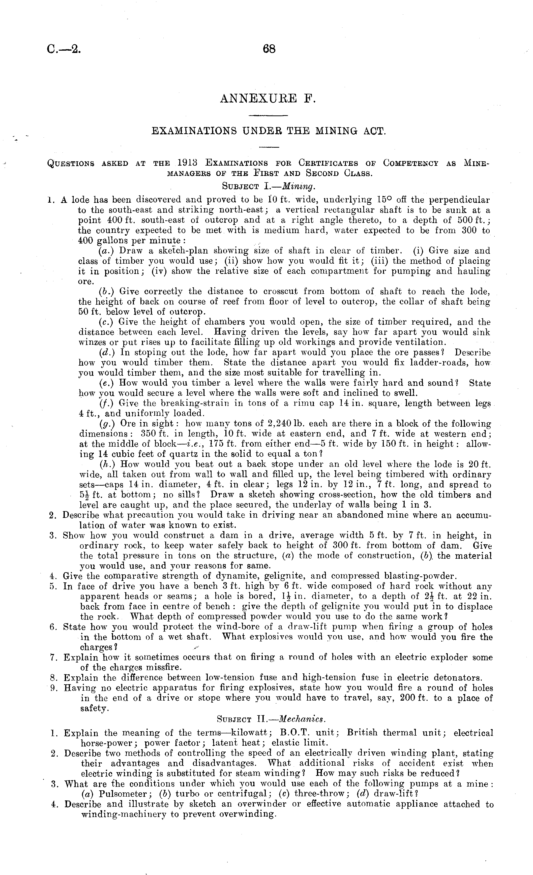 Questions asked at the 1913 Examinations fok Certificates of Competency as Minemanagebs of the flrst and second class. Subject I.— Mining. 1. A lode has been discovered and proved to be 10 ft. wide, underlying 15° off the perpendicular to the south-east and striking north-east; a vertical rectangular shaft is to be sunk at a point 400 ft. south-east of outcrop and at a right angle thereto, to a depth of 500 ft.; the country expected to be met with is medium hard, water expected to be from 300 to 400 gallons per minute : (a.) Draw a sketch-plan showing size of shaft in clear of timber, (i) Give size and class of timber you would use; (ii) show how you would fit it; (iii) the method of placing it in position; (iv) show the relative size of each compartment for pumping and hauling ore. (b.) Give correctly the distance to crosscut from bottom of shaft to reach the lode, the height of back on course of reef from floor of level to outcrop, the collar of shaft being 50 ft. below level of outcrop. (c.) Give the height of chambers you would open, the size of timber required, and the distance between each level. Having driven the levels, say how far apart you would sink winzes or put rises up to facilitate filling up old workings and provide ventilation. (d ) In stoping out the lode, how far apart would you place the ore passes? Describe how you would timber them. State the distance apart you would fix ladder-roads, how you would timber them, and the size most suitable for travelling in. (c.) How would you timber a level where the walls were fairly hard and sound? State how you would secure a level where the walls were soft and inclined to swell. (/.) Give the breaking-strain in tons of a rimu cap 14 in. square, length between legs 4 ft., and uniformly loaded. (g.) Ore in sight: how many tons of 2,2401b. each are there in a block of the following dimensions: 350 ft. in length, 10ft. wide at eastern end, and 7ft. wide at western end; at the middle of block — i.e., 175 ft. from either end —5 ft. wide by 150 ft. in height : allowing 14 cubic feet of quartz in the solid to equal a ton? (h.) How would you beat out a back stope under an old level where the lode is 20 ft. wide, all taken out from wall to wall and filled up, the level being timbered with ordinary sets —caps 14 in. diameter, 4 ft. in clear; legs 12 in. by 12 in., 7 ft. long, and spread to 5J ft. at bottom; no sills? Draw a sketch showing cross-section, how the old timbers and level are caught up, and the place secured, the underlay of walls being 1 in 3. 2. Describe what precaution you would take in driving near an abandoned mine where an accumulation of water was known to exist. 3. Show how you would construct a dam in a drive, average width 5 ft. by 7 ft. in height, in ordinary rock, to keep water safely back to height of 300 ft. from bottom of dam. Give the total pressure in tons on the structure, (a) the mode of construction, (6). the material you would use, and your reasons for same. 4. Give the comparative strength of dynamite, gelignite, and compressed blasting-powder. 5. In face of drive you have a bench 3 ft. high by 6 ft. wide composed of hard rock without any apparent heads or seams; a hole is bored, lj in. diameter, to a depth of 2A ft. at 22 in. back from face in centre of bench : give the depth of gelignite you would put in to displace the rock. What depth of compressed powder would you use to do the same work? 6. State how you would protect the wind-bore of a draw-lift pump when firing a group of holes in the bottom of a wet shaft. What explosives would you use, and how would you fire the charges 1 7. Explain how it sometimes occurs that on firing a round of holes with an electric exploder some of the charges missfire. 8. Explain the difference between low-tension fuse and high-tension fuse in electric detonators. 9. Having no electric apparatus for firing explosives, state how you would fire a round of holes in the end of a drive or stope where you would have to travel, say, 200 ft. to a place of safety. Subject II. — Mechanics. 1. Explain the meaning of the terms —kilowatt; 8.0. T. unit; British thermal unit; electrical horse-power; power factor; latent heat; elastic limit. 2. Describe two methods of controlling the speed of an electrically driven winding plant, stating their advantages and disadvantages. What additional risks of accident exist when electric winding is substituted for steam winding? How may such risks be reduced? 3. What are the conditions under which you would use each of the following pumps at a mine : (a) Pulsometer; (6) turbo or centrifugal; (c) three-throw; (d) draw-lift? 4. Describe and illustrate by sketch an overwinder or effective automatic appliance attached to winding-machinery to prevent overwinding.