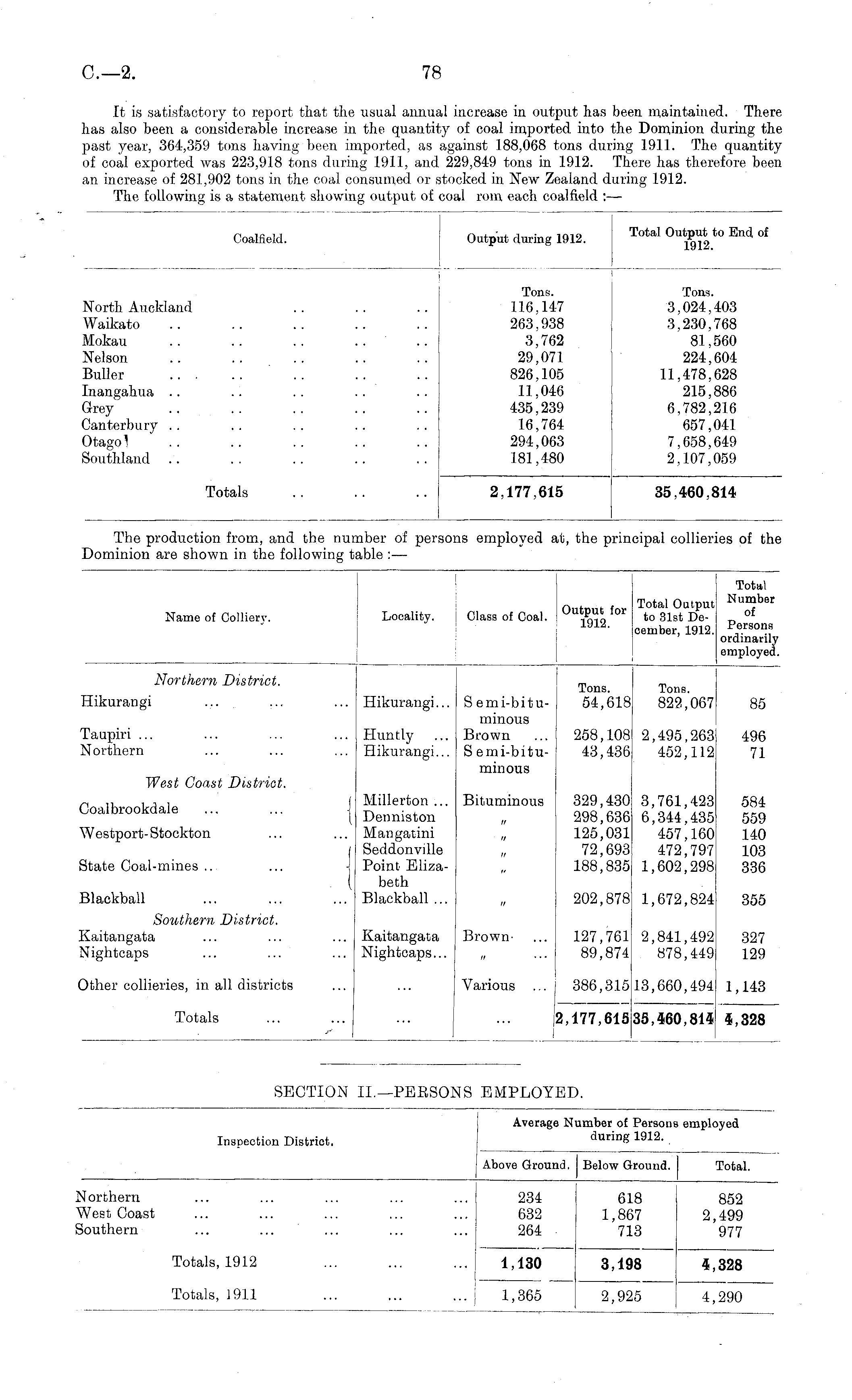It is satisfactory to report that the usual annual increase in output has been maintained. There has also been a considerable increase in the quantity of coal imported into the Dominion during the past year, 364,359 tons having been imported, as against 188,068 tons during 1911. The quantity of coal exported was 223,918 tons during 1911, and 229,849 tons in 1912. There has therefore been an increase of 281,902 tons in the coal consumed or stocked in New Zealand during 1912.