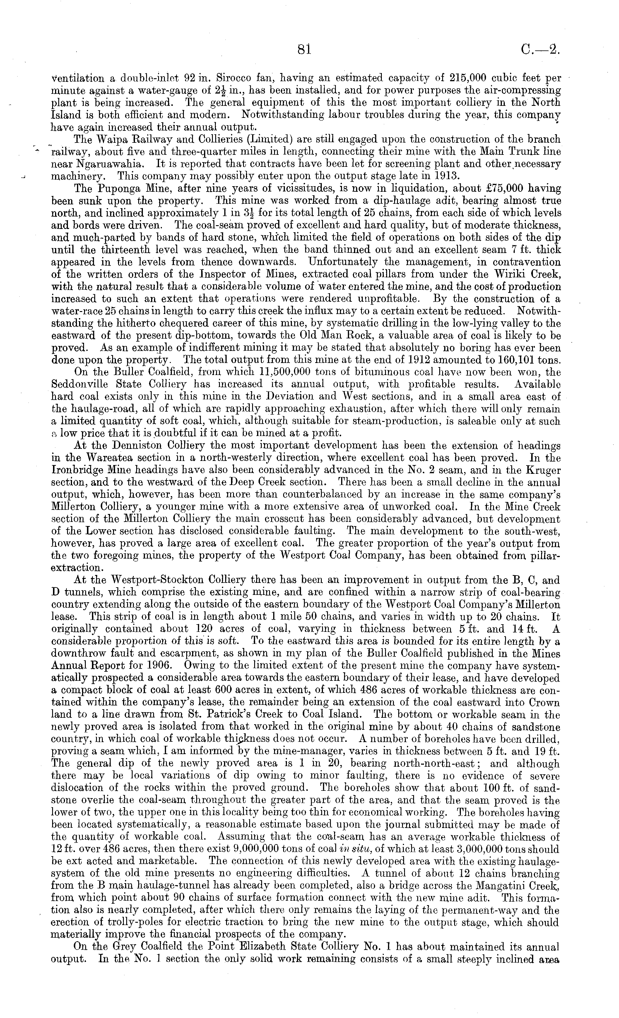 ventilation a double-inlet 92 in. Sirocco fan, having an estimated of 215,000 cubic feet per minute against a water-gauge of 2£ in., has been installed, and for power purposes the air-compressing plant is being increased. The general equipment of this the most important colliery in the North Island is both efficient and modern. Notwithstanding labour troubles during the year, this company have again increased their annual output. The Waipa Railway and Collieries (Limited) are still engaged upon the construction of the branch railway, about five and three-quarter miles in length, connecting their mine with the Main Trunk line near Ngaraawahia. It is reported that contracts have been let for screening plant and other,necessary machinery. This company may possibly enter upon the output stage late in 1913. The Puponga Mine, after nine years of vicissitudes, is now in liquidation, about £75,000 having been sunk upon the property. This mine was worked from a dip-haulage adit, bearing almost true north, and inclined approximately 1 in 3| for its total length of 25 chains, from each side of which levels and bords were driven. The coal-seam proved of excellent and hard quality, but of moderate thickness, and much-parted by bands of hard stone, which limited the field of operations on both sides of the dip until the thirteenth level was reached, when the band thinned out and an excellent seam 7 ft. thick appeared in the levels from thence downwards. Unfortunately the management, in contravention of the written orders of the Inspector of Mines, extracted coal pillars from under the Wiriki Creek, with the natural result that a considerable volume of water entered the mine, and the cost of production increased to such an extent that operations were rendered unprofitable. By the construction of a water-race 25 chains in length to carry this creek the influx may to a certain extent be reduced. Notwithstanding the hitherto chequered career of this mine, by systematic drilling in the low-lying valley to the eastward of the present dip-bottom, towards the Old Man Rock, a valuable area of coal is likely to be proved. As an example of indifferent mining it may be stated that absolutely no boring has ever been done upon the property. The total output from this mine at the end of 1912 amounted to 160,101 tons. On the Buller Coalfield, from which 11.500,000 tons of bituminous coal have now been won, the Seddonville State Colliery has increased its annual output, with profitable results. Available hard coal exists only in this mine in the Deviation and West sections, and in a small area east of the haulage-road, all of which are rapidly approaching exhaustion, after which there will only remain a limited quantity of soft coal, which, although suitable for steam-production, is saleable only at such a low price that it is doubtful if it can be mined at a profit. At the Denniston Colliery the most important development has been the extension of headings in the Wareatea section in a north-westerly direction, where excellent coal has been proved. In the Ironbridge Mine headings have also been considerably advanced in the No. 2 seam, and in the Kruger section, and to the westward of the Deep Creek section. There has been a small decline in the annual output, which, however, has been more than counterbalanced by an increase in the same company's Millerton Colliery, a younger mine with a more extensive area of unworked coal. In the Mine Creek section of the Millerton Colliery the main crosscut has been considerably advanced, but development of the Lower section has disclosed considerable faulting. The main development to the south-west, however, has proved a large area of excellent coal. The greater proportion of the year's output from the two foregoing mines, the property of the Westport Coal Company, has been obtained from pillarextraction. At the Westport-Stockton Colliery there has been an improvement in output from the B, C, and D tunnels, which comprise the existing mine, and are confined within a narrow strip of coal-bearing country extending along the outside of the eastern boundary of the Westport Coal Company's Millerton lease. This strip of coal is in length about 1 mile 50 chains, and varies in width up to 20 chains. It originally contained about 120 acres of coal, varying in thickness between 5 ft. and 14 ft. A considerable proportion of this is soft. To the eastward this area is bounded for its entire length by a downthrow fault and escarpment, as shown in my plan of the Buller Coalfield published in the Mines Annual Report for 1906. Owing to the limited extent of the present mine the company have systematically prospected a considerable area towards the eastern boundary of their lease, and have developed a compact block of coal at least 600 acres in extent, of which 486 acres of workable thickness are contained within the company's lease, the remainder being an extension of the coal eastward into Crown land to a line drawn from St. Patrick's Creek to Coal Island. The bottom or workable seam, in the newly proved area is isolated from that worked in the original mine by about 40 chains of sandstone country, in which coal of workable thipkness does not occur. A number of boreholes have been drilled, proving a seam which, I am informed by the mine-manager, varies in thickness between 5 ft. and 19 ft. The general dip of the newly proved area is 1 in 20, bearing north-north-east; and although there may be local variations of dip owing to minor faulting, there is no evidence of severe dislocation of the rocks within the proved ground. The boreholes show that about 100 ft. of sandstone overlie the coal-seam throughout the greater part of the area, and that the seam proved is the lower of two, the upper one in this locality being too thin for economical working. The boreholes having been located systematically, a reasonable estimate based upon the journal submitted may be made of the quantity of workable coal. 
