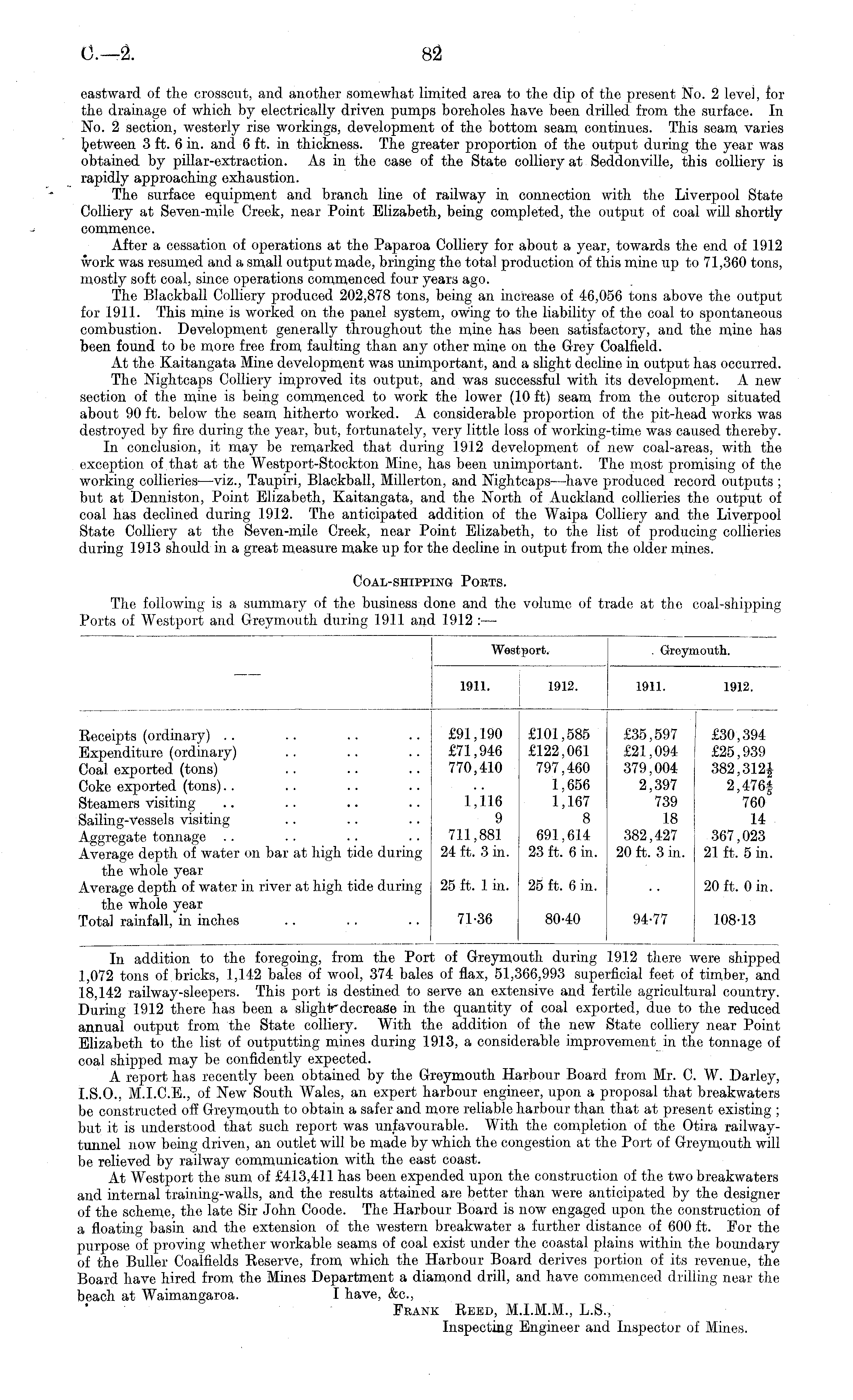 In addition to the foregoing, from the Port of Greymouth during 1912 there were shipped 1,072 tons of bricks, 1,142 bales of wool, 374 bales of flax, 51,366,993 superficial feet of timber, and 18,142 railway-sleepers. This port is destined to serve an extensive and fertile agricultural country. During 1912 there has been a slight" decrease in the quantity of coal exported, due to the reduced annual output from the State colliery. With the addition of the new State colliery near Point Elizabeth to the list of outputting mines during 1913, a considerable improvement in the tonnage of coal shipped may be confidently expected. A report has recently been obtained by the Greymouth Harbour Board from Mr. C. W. Darley, 1.5.0., M.1.C.E., of New South Wales, an expert harbour engineer, upon a proposal that breakwaters be constructed off Greymouth to obtain a safer and more reliable harbour than that at present existing ; but it is understood that such report was unfavourable. With the completion of the Otira railwaytunnel now being driven, an outlet will be made by which the congestion at the Port of Greymouth will be relieved by railway communication with the east coast. At Westport the sum of £413,411 has been expended upon the construction of the two breakwaters and internal training-walls, and the results attained are better than were anticipated by the designer of the scheme, the late Sir John Coode. The Harbour Board is now engaged upon the construction of a floating basin and the extension of the western breakwater a further distance of 600 ft. For the purpose of proving whether workable seams of coal exist under the coastal plains within the boundary of the Buller Coalfields Reserve, from which the Harbour Board derives portion of its revenue, the Board have hired from the Mines Department a diamond drill, and have commenced drilling near the beach at Waimangaroa. I have, &c, Frank Reed, M.1.M.M., L.S., Inspecting Engineer and Inspector of Mines.