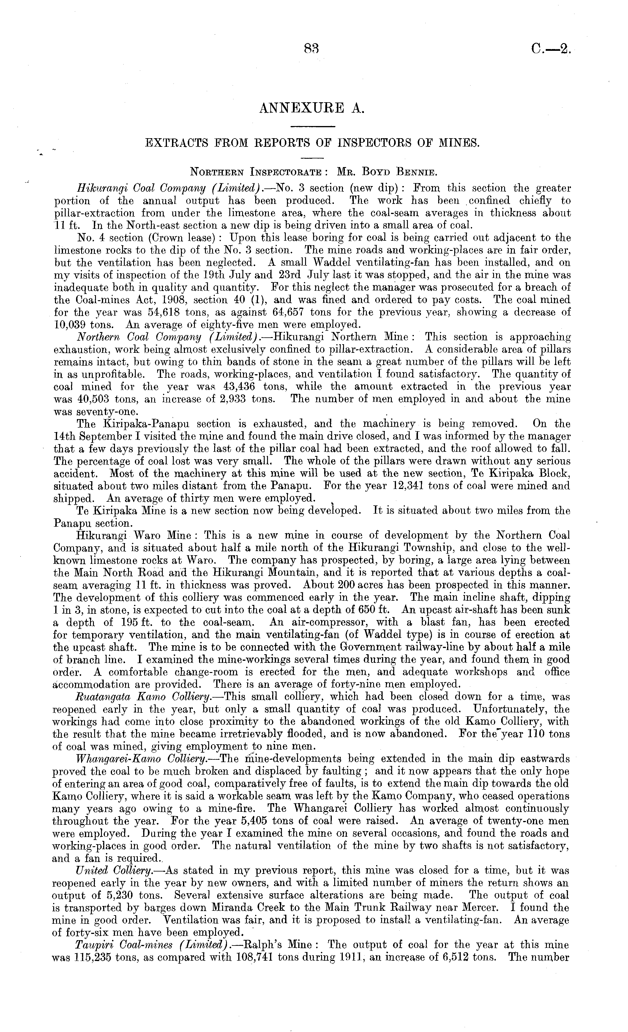 Northern Inspectorate : Mr. Boyd Bennie. Hikurangi Coal Company (Limited). —No. 3 section (new dip) : From this section the greater portion of the annual output has been produced. The work has been confined chiefly to pillar-extraction from under the limestone area, where the coal-seam averages in thickness about 11 ft. In the North-east section a new dip is being driven into a small area of coal. No. 4 section (Crown lease) : Upon this lease boring for coal is being carried out adjacent to the limestone rocks to the dip of the No. 3 section. The mine roads and working-places are in fair order, but the Ventilation has been neglected. A small Waddel ventilating-fan has been installed, and on my visits of inspection of the 19th July and 23rd July last it was stopped, and the air in the mine was inadequate both in quality and quantity. For this neglect the manager was prosecuted for a breach of the Coal-mines Act, 1908, section 40 (1), and was fined and ordered to pay costs. The coal mined for the year was 54,618 tons, as against 64,657 tons for the previous year, showing a decrease of 10,039 tons. An average of eighty-five men were employed. Northern Coal Company (Limited). —Hikurangi Northern Mine : This section is approaching exhaustion, work being almost exclusively confined to pillar-extraction. A considerable area of pillars remains intact, but owing to thin bands of stone in the seam, a great number of the pillars will be left in as unprofitable. The roads, working-places, and ventilation I found satisfactory. The quantity of coal mined for the year was 43,436 tons, while the amount extracted in the previous year was 40,503 tons, an increase of 2,933 tons. The number of men employed in and about the mine was seventy-one. The Kiripaka-Panapu section is exhausted, and the machinery is being removed. On the 14th September I visited the mine and found the main drive closed, and I was informed by the manager that a few days previously the last of the pillar coal had been extracted, and the roof allowed to fall. The percentage of coal lost was very small. The whole of the pillars were drawn without any serious accident. Most of the machinery at this mine will be used at the new section, Te Kiripaka Block, situated about two miles distant from the Panapu. For the year 12,341 tons of coal were mined and shipped. An average of thirty men were employed. Te Kiripaka Mine is a new section now being developed. It is situated about two miles from the Panapu section. Hikurangi Waro Mine : This is a new mine in course of development by the Northern Coal Company, and is situated about half a mile north of the Hikurangi Township, and close to the wellknown limestone rocks at Waro. The company has prospected, by boring, a large area lying between the Main North Road and the Hikurangi Mountain, and it is reported that at various depths a coalseam averaging 11 ft. in thickness was proved. About 200 acres has been prospected in this manner. The development of this colliery was commenced early in the year. The main incline shaft, dipping lin3, in stone, is expected to cut into the coal at a depth of 650 ft. An upcast air-shaft has been sunk a depth of 195 ft. to the coal-seam. An air-compressor, with a blast fan, has been erected for temporary ventilation, and the main ventilating-fan (of Waddel type) is in course of erection at the upcast shaft. The mine is to be connected with the Government railway-line by about half a mile of branch line. I examined the mine-workings several times during the year, and found them in good order. A comfortable change-room is erected for the men, and adequate workshops and office accommodation are provided. There is an average of forty-nine men employed. Ruatangata Kamo Colliery. —This small colliery, which had been closed down for a time, was reopened early in the year, but only a small quantity of coal was produced. Unfortunately, the workings had come into close proximity to the abandoned workings of the old Kamo Colliery, with the result that the mine became irretrievably flooded, and is now abandoned. For the'year 110 tons of coal was mined, giving employment to nine men. Whangarei-Kamo Colliery. —The mine-developments being extended in the main dip eastwards proved the coal to be much broken and displaced by faulting ; and it now appears that the only hope of entering an area of good coal, comparatively free of faults, is to extend the main dip towards the old Kamo Colliery, where it is said a workable seam was left by the Kamo Company, who ceased operations many years ago owing to a mine-fire. The Whangarei Colliery has worked almost continuously throughout the year. For the year 5,405 tons of coal were raised. An average of twenty-one men were employed. During the year I examined the mine on several occasions, and found the roads and working-places in good order. The natural ventilation of the mine by two shafts is not satisfactory, and a fan is required. United Colliery. —-As stated in my previous report, this mine was closed for a time, but it was reopened early in the year by new owners, and with a limited number of miners the return shows an output of 5,230 tons. Several extensive surface alterations are being made. The output of coal is transported by barges down Miranda Creek to the Main Trunk Railway near Mercer. I found the mine in good order. Ventilation was fair, and it is proposed to install a ventilating-fan. An average of forty-six men have been employed. Taupiri Coal-mines (Limited). —Ralph's Mine : The output of coal for the year at this mine was 115,235 tons, as compared with 108,741 tons during 1911, an increase of 6,512 tons. The number