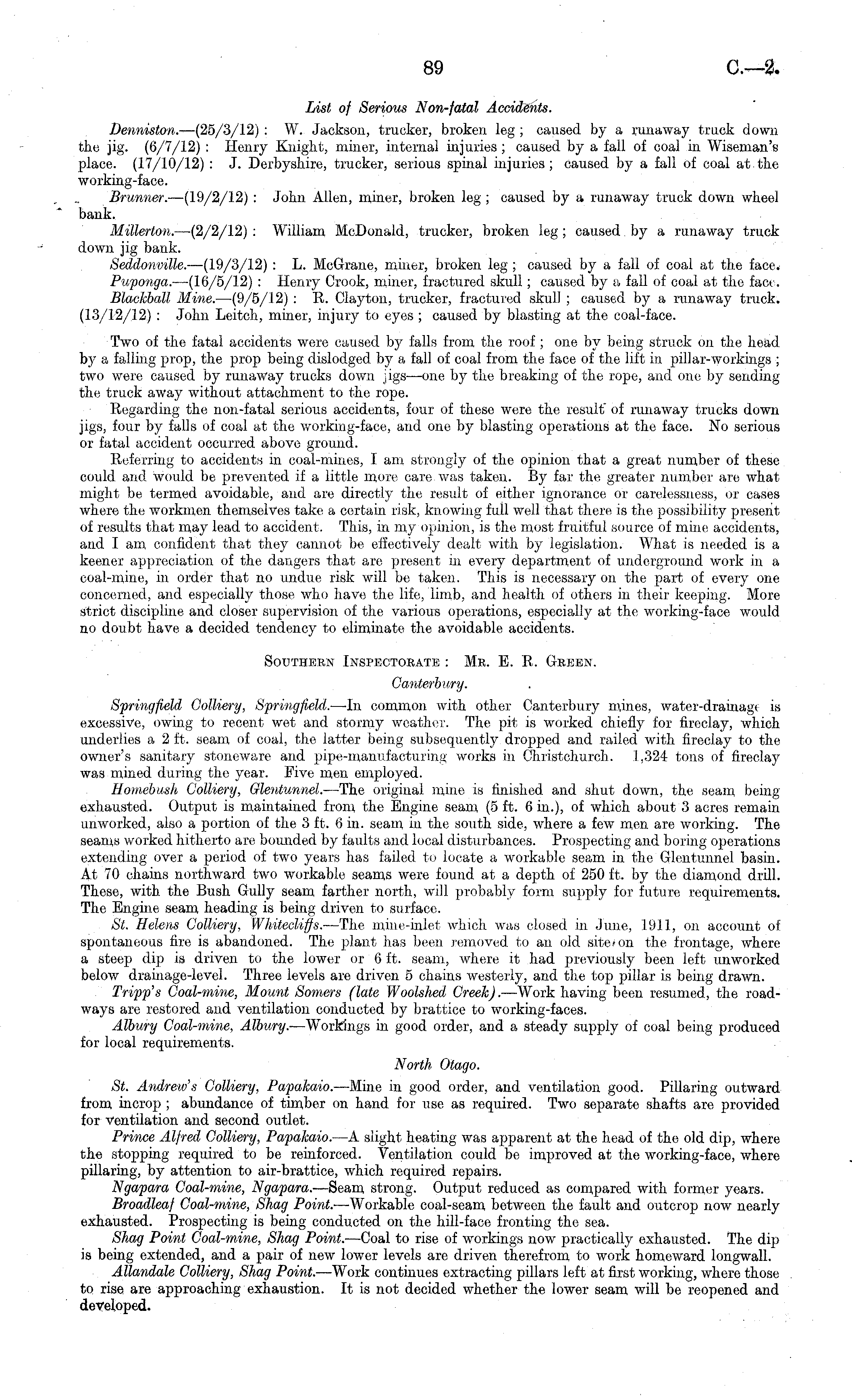 List of Serious Non-fatal Accidents. Denniston. —(2s/3/12) : W. Jackson, trucker, broken leg ; caused by a runaway track down the jig. (6/7/12) : Henry Knight, miner, internal injuries ; caused by a fall of coal in Wiseman's place. (17/10/12) :J. Derbyshire, trucker, serious spinal injuries; caused by a fall of coal at the working-face. Brunner. —(l9/2/12) : John Allen, miner, broken leg ; caused by a runaway truck down wheel bank. Millerton. —(2/2/12) : William McDonald, trucker, broken leg ; caused by a runaway truck down jig bank. Seddonoille. —(19/3/12) : L. McGrane, miner, broken leg ; caused by a fall of coal at the face. Puponga. —(l6/5/12) : Henry Crook, miner, fractured skull; caused by a fall of coal at the fact;. Blackball Mine. —(9/5/12) : R. Clayton, trucker, fractured skull ; caused by a runaway truck. (13/12/12) : John Leitch, miner, injury to eyes ; caused by blasting at the coal-face. Two of the fatal accidents were caused by falls from the roof ; one by being struck on the head by a falling prop, the prop being dislodged by a fall of coal from the face of the lift in pillar-workings ; two were caused by runaway trucks down jigs—one by the breaking of the rope, and one by sending the truck away without attachment to the rope. Regarding the non-fatal serious accidents, four of these were the result of runaway trucks down jigs, four by falls of coal at the working-face, and one by blasting operations at the face. No serious or fatal accident occurred above ground. Referring to accidents in coal-mines, I am strongly of the opinion that a great number of these could and would be prevented if a little more care was taken. By far the greater number are what might be termed avoidable, and are directly the result of either ignorance or carelessness, or cases where the workmen themselves take a certain risk, knowing full well that there is the possibility present of results that may lead to accident. This, in my opinion, is the most fruitful source of mine accidents, and lam confident that they cannot be effectively dealt with by legislation. What is needed is a keener appreciation of the dangers that are present in every department of underground work in a coal-mine, in order that no undue risk will be taken. This is necessary on the part of every one concerned, and especially those who have the life, limb, and health of others in their keeping. More strict discipline and closer supervision of the various operations, especially at the working-face would no doubt have a decided tendency to eliminate the avoidable accidents. Southern Inspectorate : Mr. E. R. Green. Canterbury. Springfield Colliery, Springfield. —-In common with other Canterbury mines, water-drainage is excessive, owing to recent wet and stormy weather. The pit is worked chiefly for fireclay, which underlies a 2 ft. seam of coal, the latter being subsequently dropped and railed with fireclay to the owner's sanitary stoneware and pipe-manufacturing works in Christchurch. 1,324 tons of fireclay was mined during the year. Five men employed. Homebush Colliery, Glentunnel. —The original mine is finished and shut down, the seam being exhausted. Output is maintained from, the Engine seam (5 ft. 6 in.), of which about 3 acres remain unworked, also a portion of the 3 ft. 6 in. seam in the south side, where a few men are working. The seams worked hitherto are bounded by faults and local disturbances. Prospecting and boring operations extending over a period of two years has failed to locate a workable seam in the Glentunnel basin. At 70 chains northward two workable seams were found at a depth of 250 ft. by the diamond drill. These, with the Bush Gully seam farther north, will probably form supply for future requirements. The Engine seam heading is being driven to surface. St. Helens Colliery, Whitecliffs. —The mine-inlet which was closed in June, 1911, on account of spontaneous fire is abandoned. The plant has been removed to an old site- on the frontage, where a steep dip is driven to the lower or 6 ft. seam, where it had previously been left unworked below drainage-level. Three levels are driven 5 chains westerly, and the top pillar is being drawn. Tripp's Coal-mine, Mount Somers (late Woolshed Creek). —Work having been resumed, the roadways are restored and ventilation conducted by brattice to working-faces. Albury Coal-mine, Albury.- —Workings in good order, and a steady supply of coal being produced for local requirements. North Otago. St. Andrew's Colliery, Papakaio. —Mine in good order, and ventilation good. Pillaring outward from incrop ; abundance of timber on hand for use as required. Two separate shafts are provided for ventilation and second outlet. Prince Alfred Colliery, Papakaio. —A slight heating was apparent at the head of the old dip, where the stopping required to be reinforced. Ventilation could be improved at the working-face, where pillaring, by attention to air-brattice, which required repairs. Ngapara Coal-mine, Ngapara.—Sea,nx strong. Output reduced as compared with former years. Broadleaf Coal-mine, Shag Point. —Workable coal-seam between the fault and outcrop now nearly exhausted. Prospecting is being conducted on the hill-face fronting the sea. Shag Point Coal-mine, Shag Point. —Coal to rise of workings now practically exhausted. The dip is being extended, and a pair of new lower levels are driven therefrom to work homeward longwall. Allandale Colliery, Shag Point. —Work continues extracting pillars left at first working, where those to rise are approaching exhaustion. It is not decided whether the lower seam will be reopened and developed.