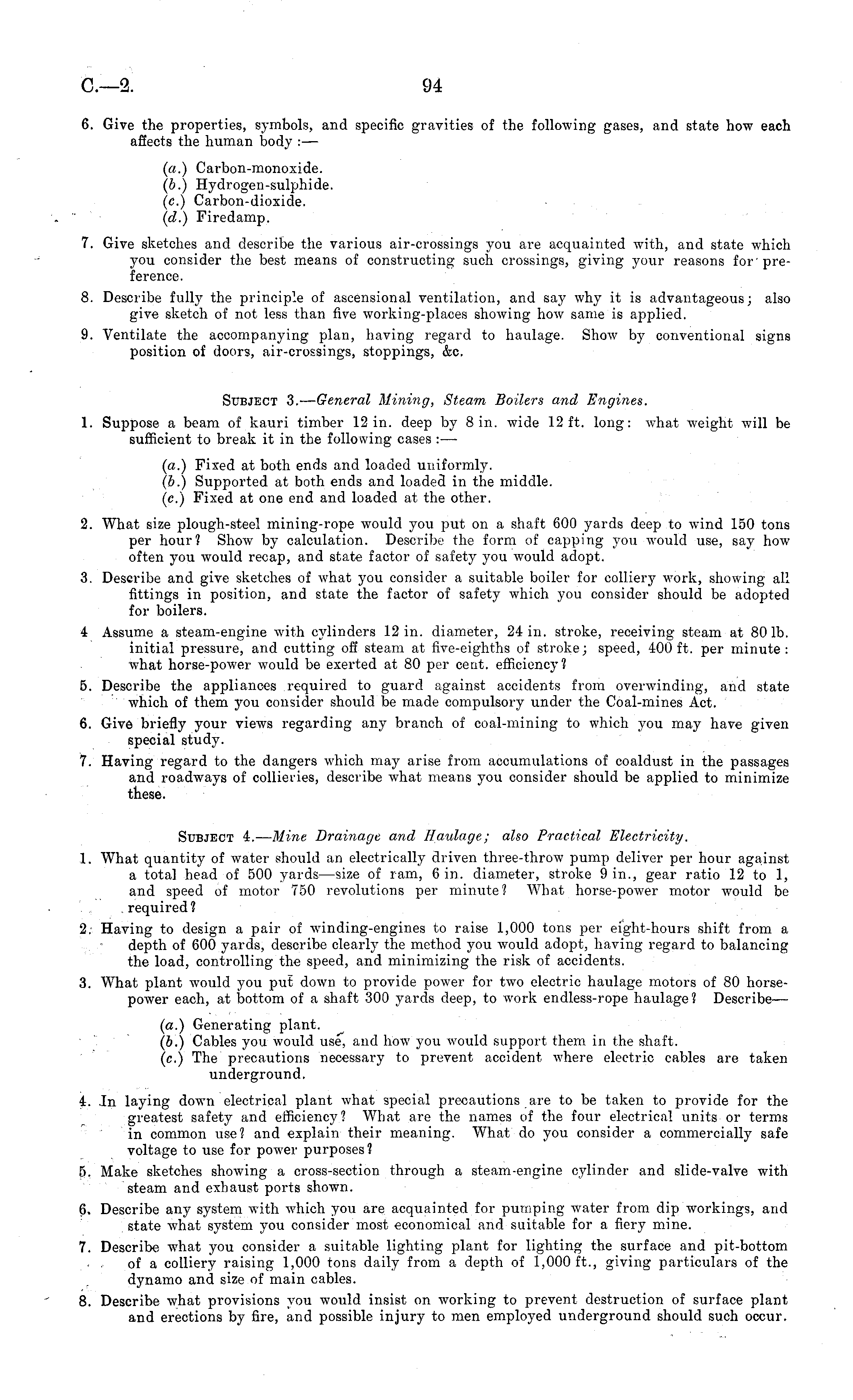 6. Give the properties, symbols, and specific gravities of the following gases, and state how each affects the human body : — (a.) Carbon-monoxide. (b.) Hydrogen-sulphide. (c.) Carbon-dioxide. (d.) Firedamp. 7. Give sketches and describe the various air-crossings you are acquainted with, and state which you consider the best means of constructing such crossings, giving your reasons for , preference. 8. Describe fully the principle of ascensional ventilation, and say why it is advantageous; also give sketch of not less than five working-places showing how same is applied. 9. Ventilate the accompanying plan, having regard to haulage. Show by conventional signs position of doors, air-crossings, stoppings, &c. Subject 3. — General Mining, Steam Boilers and Engines. 1. Suppose a beam of kauri timber 12 in. deep by 8 in. wide 12 ft. long: what weight will be sufficient to break it in the following cases : — (a.) Fixed at both ends and loaded uniformly. (b.) Supported at both ends and loaded in the middle. (c.) Fixed at one end and loaded at the other. 2. What size plough-steel mining-rope would you put on a shaft 600 yards deep to wind 150 tons per hour? Show by calculation. Describe the form of capping you would use, say how often you would recap, and state factor of safety you would adopt. 3. Describe and give sketches of what you consider a suitable boiler for colliery work, showing all fittings in position, and state the factor of safety which you consider should be adopted for boilers. 4 Assume a steam-engine with cylinders 12 in. diameter, 24 in. stroke, receiving steam at 801b. initial pressure, and cutting off steam at five-eighths of stroke; speed, 400 ft. per minute: what horse-power would be exerted at 80 per cent, efficiency? 5. Describe the appliances required to guard against accidents from overwinding, and state which of them you consider should be made compulsory under the Coal-mines Act. 6. Give briefly your views regarding any branch of coal-mining to which you may have given special study. 7. Having regard to the dangers which may arise from accumulations of coaldust in the passages and roadways of collieries, describe what means you consider should be applied to minimize these. Subject 4.— Mine Drainage and Haulage; also Practical Electricity. 1. What quantity of water should an electrically driven three-throw pump deliver per hour against a total head of 500 yards—size of ram, 6 in. diameter, stroke 9 in., gear ratio 12 to 1, and speed of motor 750 revolutions per minute? What horse-power motor would be required? 2. Having to design a pair of winding-engines to raise 1,000 tons per eight-hours shift from a depth of 600 yards, describe clearly the method you would adopt, having regard to balancing the load, controlling the speed, and minimizing the risk of accidents. 3. What plant would you put down to provide power for two electric haulage motors of 80 horsepower each, at bottom of a shaft 300 yards deep, to work endless-rope haulage? Describe— (a.) Generating plant. (b.) Cables you would use, and how you would support them in the shaft, (c.) The precautions necessary to prevent accident where electric cables are taken underground. 4. In laying down electrical plant what special precautions are to be taken to provide for the greatest safety and efficiency? What are the names of the four electrical units or terms in common use? and explain their meaning. What do you consider a commercially safe voltage to use for power purposes? 5. Make sketches showing a cross-section through a steam-engine cylinder and slide-valve with steam and exhaust ports shown. 6. Describe any system with which you are acquainted for pumping water from dip workings, and state what system you consider most economical and suitable for a fiery mine. 7. Describe what you consider a suitable lighting plant for lighting the surface and pit-bottom of a colliery raising 1,000 tons daily from a depth of 1,000 ft., giving particulars of the dynamo and size of main cables. 8. Describe what provisions you would insist on working to prevent destruction of surface plant and erections by fire, and possible injury to men employed underground should such occur.