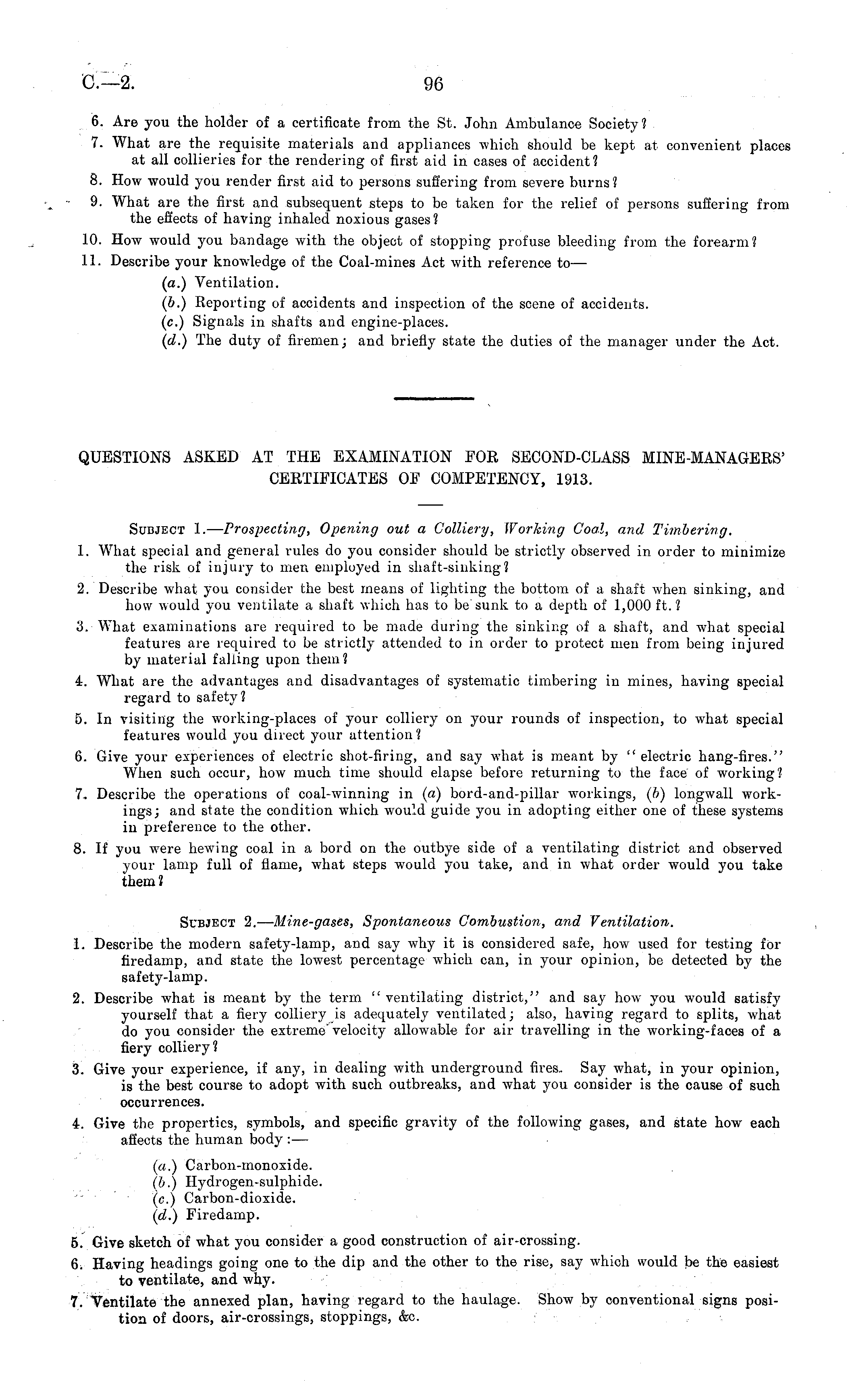 QUESTIONS ASKED AT THE EXAMINATION FOR SECOND-CLASS MINE-MANAGERS' CERTIFICATES OF COMPETENCY, 1913. Subject 1. — Prospecting, Opening out a Colliery, Working Coal, and Timbering. 1. What special and general rules do you consider should be strictly observed in order to minimize the risk of injury to men employed in shaft-sinking? 2. Describe what you consider the best means of lighting the bottom of a shaft when sinking, and how would you ventilate a shaft which has to be sunk to a depth of 1,000 ft. ? 3. What examinations are required to be made during the sinking of a shaft, and what special features are required to be strictly attended to in order to protect men from being injured by material falling upon them? 4. What are the advantages and disadvantages of systematic timbering in mines, having special regard to safety? 5. In visiting the working-places of your colliery on your rounds of inspection, to what special features would you direct your attention 1 6. Give your experiences of electric shot-firing, and say what is meant by "electric hang-fires." When such occur, how much time should elapse before returning to the face of working ? 7. Describe the operations of coal-winning in (a) bord-and-pillar workings, (ft) longwall workings; and state the condition which would guide you in adopting either one of these systems in preference to the other. 8. If you were hewing coal in a bord on the outbye side of a ventilating district and observed your lamp full of flame, what steps would you take, and in what order would you take them? Subject 2.- — Mine-gases, Spontaneous Combustion, and Ventilation. 1. Describe the modern safety-lamp, and say why it is considered safe, how used for testing for firedamp, and state the lowest percentage which can, in your opinion, be detected by the safety-lamp. 2. Describe what is meant by the term " ventilating district," and say how you would satisfy yourself that a fiery colliery is adequately ventilated; also, having regard to splits, what do you consider the extreme' velocity allowable for air travelling in the working-faces of a fiery colliery? 3. Give your experience, if any, in dealing with underground fires,. Say what, in your opinion, is the best course to adopt with such outbreaks, and what you consider is the cause of such occurrences. 4. Give the properties, symbols, and specific gravity of the following gases, and state how each affects the human body :— (a.) Carbon-monoxide. (6.) Hydrogen-sulphide. (c.) Carbon-dioxide. (d.) Firedamp. 5. Give sketch of what you consider a good construction of air-crossing. 6. Having headings going one to the dip and the other to the rise, say which would be the easiest to ventilate, and why. 7. Ventilate the annexed plan, having regard to the haulage. Show by conventional signs position of doors, air-crossings, stoppings, &c.