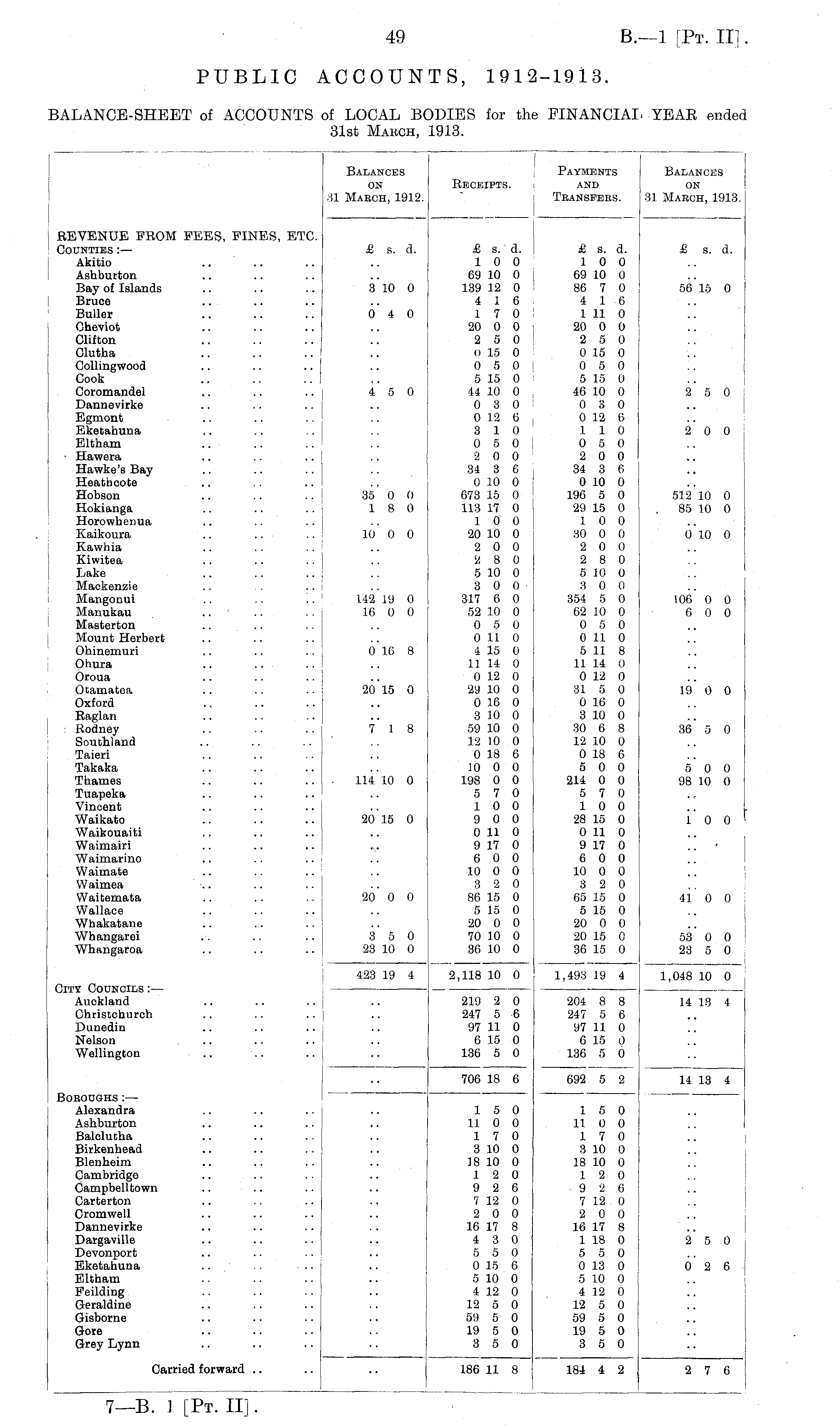 .REVENUE PROM FEES, PINES, ETC. Counties :— Akitio Ashburton Bay of Islands Bruce Buller Cheviot Clifton Clutha Collingwood Cook Coromandel Dannevirke Egmont Eketahuna Eltham .. ■ • Hawera Hawke's Bay Heathoote Hobson Hokianga Horowhenua Kaikoura Kawhia Kiwitea Lake Mackenzie Mangonui Manukau Masterton .. Mount Herbert Ohinemuri Ohura Oroua Otamatea Oxford Raglan .. .. Rodney Southland Taieri Takaka Thames Tuapeka Vincent Waikato Waikouaiti Waimairi Waimarino Waimate Waimea Waitemata Wallace Wbakatane Whangarei Whangaroa Balances on 31 Mabch, 1912. £ s. d. 310 0 0 4 0 4 5 0 35 0 0 18 0 10 0 0 Payments Receipts. and Teansfebs. & s. d. £ s. d. 10 0 10 0 69 10 0 69 10 0 139 12 0 86 7 0 4 16 4 16 17 0 1 11 0 20 0 0 20 0 0 2 5 0 2 5 0 o 15 0 0 15 0 0 5 0 0 5 0 5 15 0 5 15 0 44 10 0 46 10 0 0 3 0 0 3 0 0 12 6 0 12 6 3 10 110 0 5 0 0 5 0 2 0 0 2 0 0 34 3 6 34 3 6 0 10 0 0 10 0 673 15 0 196 5 0 113 17 0 29 15 0 1 0 0 J 10 0 20 10 0 30 0 0 2 0 0 2 0 0 2 8 0 2 8 0 5 10 0 5 .10 0 3 0 0 3 0 0 317 6 0 354 5 0 52 10 0 62 10 0 0 5 0 0 5 0 0 11 0 0 11 0 4 15 0 5 11 8 11 14 0 11 14 0 0 12 0 0 12 0 29 10 0 31 5 0 0 16 0 0 16 0 3 10 0 3 10 0 59 10 0 30 6 8 12 10 0 12 10 0 0 18 6 0 18 6 10 0 0 5 0 0 198 0 0 214 0 0 5 7 0 5 7 0 10 0 10 0 9 0 0 28 15 0 0 11 0 J 0 11 0 9 17 0 9 17 0 6 0 0 6 0 0 10 0 0 10 0 0 3 2 0 3 2 0 86 15 0 65 15 0 5 15 0 5 15 0 20 0 0 20 0 0 70 10 0 20 15 0 36 10 0 36 15 0 Balances ON 31 Maech, 1913. £ s. d. 56 15 0 2 6 0 2 0 0 512 10 0 85 10 0 0 10 0 142 19 0 16 0 0 106 0 0 6 0 0 0 16 8 20 15 0 19 0 0 i' i 8 36 5 0 114 10 0 5 0 0 98 10 0 2015 0 i'o o 20 0 0 41 0 0 3 5 0 23 10 0 53 0 0 23 5 0 City Councils :— Auckland Christcburch Dunedin Nelson Wellington 423 19 4 2,118 10 0 219 2 0 247 5 6 97 11 0 6 15 0 136 5 0 1,493 19 4 204 8 8 247 5 6 97 11 0 6 15 0 136 5 0 1,048 10 0 14 13 4 Boboughs:— Alexandra Ashburton Balelutha Birkenhead Blenheim Cambridge Campbelltown Carterton Cromwell Dannevirke Dargaville Devonport Eketahuna Eltham Peilding Geraldine Gisborne Gore Grey Lynn 706 18 6 15 0 11 0 0 17 0 3 10 0 18 10 0 12 0 9 2 6 7 12 0 2 0 0 16 17 8 4 3 0 5 5 0 0 15 6 5 10 0 4 12 0 12 5 0 59 5 0 19 5 0 3 5 0 15 0 11 0 0 17 0 3 10 0 18 10 0 12 0 9 2 6 7 12 0 2 0 0 16 17 8 1 18 0 5 5 0 0 13 0 5 10 0 4 12 0 12 5 0 59 5 0 19 5 0 3 5 0 692 5 2 14 13 4 2 5 0 02 6 Carried forward 186 11 8 184 4 2 2 7 6