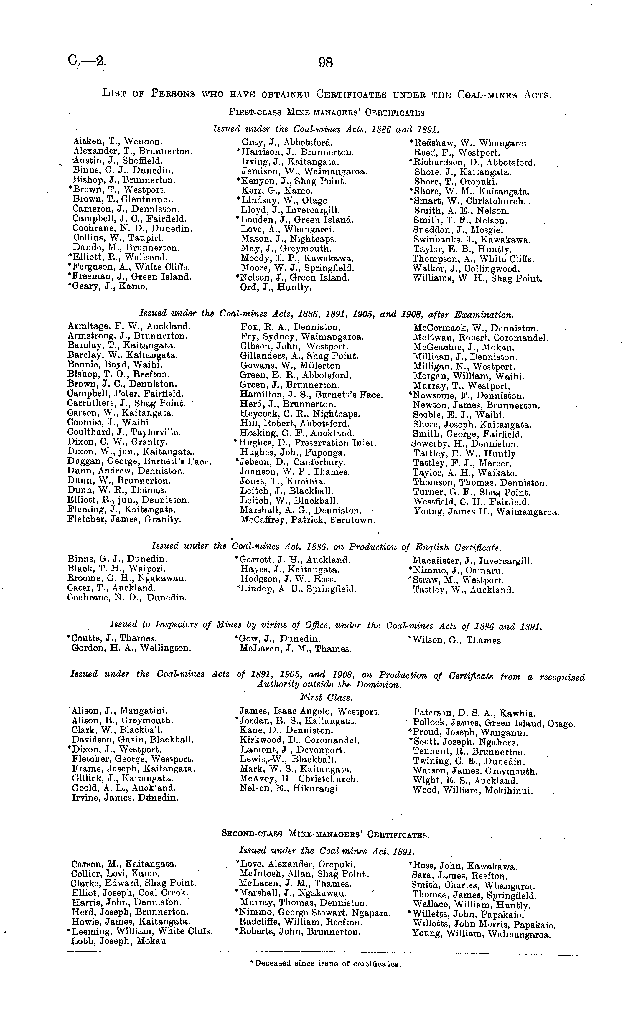 List op Persons who have obtained Certificates under the Coal-mines Acts. First-class Mine-managers' Certificates. Issued wider the Coal-mines Acts, 1886 and 1891. Aitken, T,, Wendon. Gray, J., Abbotsford. 'Redsbaw, W., Whangarei. Alexander, T., Brunnerton. *Harrison, J., Brunnerton. Reed, P., Westport. Austin, J., Sheffield. Irving, J., Kaitangata. •Richardson, D., Abbotsford. Binns, G. J., Dunedin. Jemison, W., Waimangaroa. Shore, J., Kaitangata. Bishop, J., Brunnerton. 'Kenyon, J., Shag Point. Shore, T., Orepuki. •Brown, T., Westport. Kerr, G., Kamo. 'Shore, W. M., Kaitangata. Brown, T., Glentunnel. "Lindsay, W., Otago. 'Smart, W., Christchurch. Cameron, J., Denniston. Lloyd, J., Inveroargill. Smith, A. E., Nelson. Campbell, J. C, Fairfield. 'Louden, J., Green Island. Smith, T. F., Nelson. Cochrane, N. D., Dunedin. Love, A., Whangarei. Sneddon, J., Mosgiel. Collins, W., Taupiri. Mason, J., Nightcaps. Swinbanks, J., Kavvakawa. Dando, M., Brunnerton. May, J., Greymouth. Taylor, E. 8., Huntly. ♦Elliott, R., Wallsend. Moody, T. P., Kawakawa. Thompson, A., White Cliffs. 'Ferguson, A., White Cliffs. Moore, W. J., Springfield. Walker, J., Collingwood. •Freeman, J., Green Island. 'Nelson, J., Green Island. Williams, W. H., Shag Point. •Geary, J., Kamo. Ord, J., Huntly. Issued under the Coal-mines Acts, 1886, 1891, 1905, and 1908, after Examination. Armitage, F. W., Auckland. Fox, R. A., Denniston. McCormaok, W., Denniston. Armstrong, J., Brunnerton. Fry, Sydney, Waimangaroa. McEwan, Robert, Coromandel. Barclay, T., Kaitangata. Gibson, John, Westport. MoGeachie, J., Mokau. Barclay, W., Kaitangata. Gillanders, A., Shag Point. MiUis>an, J., Denniston. Bennie, Boyd, Waihi. Gowans, W., Millerton. Milligan, N., Westport. Bishop, T. 0., Reefton. Green, E. R., Abbotsford. Morgan, William, Waihi. Brown, J. C., Denniston. Green, J., Brunnerton. Murray, T., Westport. Campbell, Peter, Fairfield. Hamilton, J. S., Burnett's Face. 'Newsome, F., Denniston. Carruthers, J., Shag Point. Herd, J., Brunnerton. Newton. James, Brunnerton. Garson, W., Kaitangata. Heycock, C. R., Nightcaps. Sooble, E. J., Waihi. Coombe, J., Waihi. Hill, Robert, Abbots-ford. Shore, Joseph, Kaitangata. Coulthard, J., Taylorville. Hosking, G. F., Auckland. Smith, George, Fairfield. Dixon, C. W., Graiiity. 'Hughes, D., Preservation Inlet. Sowerby, H.J Detimston. Dixon, W., jun., Kaitangata. Hughes, Joh., Puponga. Tattley, E. W., Huntly Duggan, George, Burnett's Faci>. \Tebson, D., Canterbury. Tattley, F. J., Mercer. Dunn, Andrew, Denniston. Johnson, W. P., Thames. Taylor, A. H., Waikato. Dunn, W., Brunnerton. Jones, T., Kimibia. Thomson, Thomas, Dennistou. Dunn, W. R., Thames. Leiteh, J., Blackball. Turner, G. F., Shag Point. Elliott, R., jun., Denniston. Leiteh, W., Blackball. Westfield, C. H., Fairfield. Fleming, J., Kaitangata, Marshall, A. G., Denniston. Young, James H., Waimangaroa. Fletcher, James, Granity. McCaffrey, Patrick, Ferntown. Issued under the Coal-mines Act, 1886, on Production of English Certificate. Binns, G. J., Dunedin. 'Garrett, J. H., Auckland. Macalister, J., Invercargill. Black, T. H., Waipori. Hayes, J., Kaitangata. 'Nimmo, J., Oamaru. Broome, G. H., Ngakawau. Hodgson, J. W., Ross. 'Straw, M., Westport. Cater, T., Auckland. 'Lindop, A. 8., Springfield. Tattley, W., Auckland. Cochrane, N. D., Dunedin. Issued to Inspectors of Mines by virtue of Office, under the Coal-mines Acts of 1886 and 1891. •Coutts, J., Thames. *Gow, J., Dunedin. "Wilson, G., Thames. Gordon, H. A., Wellington. McLaren, J. M., Thames. Issued under the Coal-mines Acts of 1891, 1905, and 1908, on Production of Certificate from a recognized Authority outside the Dominion. First Class. Alison, J., Mangatini. James, Isaac Angelo, Westport. Paterson, D. S. A., Kawhia Alison, R., Greymouth. 'Jordan, R. S., Kaitangata. Pollock, James, Green Island Otaeo Clark, W., Blackball. Kane, D., Denniston. 'Proud, Joseph, Wanganui. Davidson, Gavin, Blackball. Kirkwood, D., Coromandel. 'Scott, Joseph, Ngahere •Dixon, J., Westport. Lamont, J , Devonport. Tennent, R., Brunnerton Fletcher, George, Westport. Blackball. Twining, C. E., Dunedin. Frame, Jcseph, Kaitangata. Mark, W. S., Kaitangata. Watson, James, Greymouth. Gillick, J., Kaitangata. McAvoy, H., Christchurch. Wight, E. S., Auckland. Goold, A. L., Auckland. Nelson, E., Hikurangi. Wood, William, Mokihinui. Irvine, James, Dunedin. Second-class Mine-managers' Certificates. Issued under the Coal-mines Act, 1891. Carson, M., Kaitangata. 'Love, Alexander, Orepuki. 'Ross, John, Kawakawa. Collier, Levi, Kamo. Mclntosh, Allan, Shag Point- Sara, James, Beefton. Clarke, Edward, Shag Point. McLaren, J. M., Thames. Smith, Charles, Whangarei Elliot, Joseph, Coal Creek. 'Marshall, J., Ngakawau. Thomas, James, Springfield. Harris, John, Denniston. Murray, Thomas, Denniston. Wallace, William, Huntly Herd, Joseph, Brunnerton. *Nimmo, George Stewart, Ngapara. *Willetts, John, Papakaio Howie, James, Kaitangata. Radcliffe, William, Reefton. Willetts, John Morris, Papakaio •Leeming, William, White Cliffs. 'Roberts, John, Brunnerton. Young, William, Waimangaroa Lobb, Joseph, Mokau