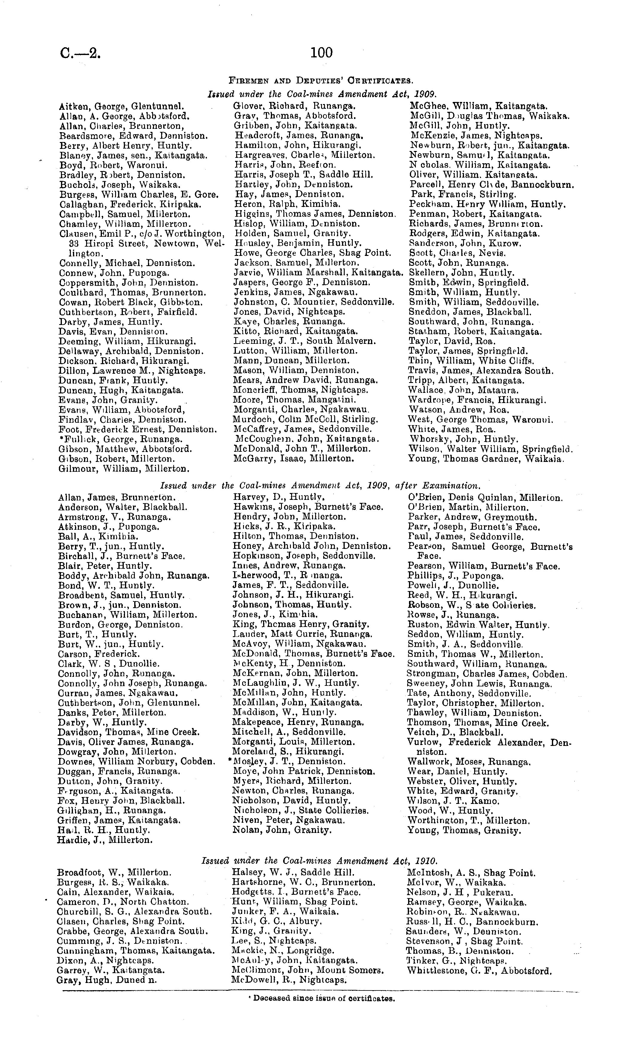 PIEEMEN AND DEPUTIES' CERTIFICATES. Issued under the Coal-mines Amendment Act, 1909. Aitken, George, Glentunnel. . Glover, Riohard, Runanga. MoGhee, William, Kaitangata. Allan, A. George, Abb jtsford. Gray, Thomas, Abbotsford. MoGill, D >uglas Thomas, Waikaka. Allan, Charles, Brunnerton, Gribben, John, Kaitangata. McGill, John, Huntly. Beardsmore, Edward, Denniston. Headcroft, James, Runanga, McKenzie, James, Nightonps. Berry, Albert Henry, Huntly. Hamilton, John, Hikurangi. Newburn, Robert, jun., Kaitangata. Blanr;y, James, sen., Kaitangata. Hargreaves, Charles Millerton. Newburn, Samvul, Kaitangata. Boyd, Robert, Waronui. Harris, John, Reefion. N oholas. William, Kaitangata. Bradley, R>bert, DenniBton. Harris, Joseph T., Saddle Hill. Oliver, William. Kaitangata. Buchols, Joseph, Waikaka. Hartley, John, Denniston. Parcel!, Henry Chde, Bannookburn. Burgess, William Charles, E. Gore. Hay, James, Denniston. Park, Francis, Stirling. Callagban, Frederick, Kiripaka. Heron, Balph, Kimihia. Peckharn. Henry William, Huntly. Campbell, Samuel, Miilerton. Hig°ins, Thomas James, Denniston. Penman, Robert, Kaitangata. Chamley, William, Millerton. Hislop, William, Denniston. Richards, James, Brunmrion. Clausen, Emil P., c/o J. Worthington, Holden, Samuel, Granity. Rodgers, Edwin, Kaitangata. 33 Hiropi Street, Newtown, Wei- Housloy, Benjamin, Huntly. Sanderson, John, Kurow. lington. Howe, George Charles, Shag Point. Soott, Chailes, Nevis. Connelly, Michael, Denniston. Jackson, Samuel, Millerton. Soott, John, Runanga. Connew, John. Puponga. Jarvie, William Marshall, Kaitangata. Skellern, John, Huntly. Coppersmith, John, Denniston. Jaspers, George F., Denniston. Smith, Ed-win, Springfield. Coultbard, Thomas, Brunnerton. Jenkins, James, Ngakawau. Smith, William, Huntly. Cowan, Robert Black, Gibbston. Johnston, C. Mountier, Seddonville. Smith, William, Seddonville. Cuthbertson, Robert, Fairfield. Jones, David, Nightcaps. Sneddon, James, Blackball. Darby, Jnmes, Huntly. Knye, Charles, Runanga. Southward, John, Runanga. Davis, Evan, Denniston. Kitto, Richard, Kaitangata. Statham, Robert, Kaiiangata. Deeming, William, Hikurangi. Leeming, J. T., South Malvern. Taylor, David, Roa. Dellaway, Archibald, Denniston. Lutton, William, Millerton. Taylor, James, Springfield. Dickson. Richard, Hikurangi. Mann, Duncan, Millerton. Thin, William, White Cliffs. Dillon, Lawrence M., Nightcaps. Mason, William, Denniston. Travis, James, Alexandra South. Duncan, Frank, Huntly. Mears, Andrew David, Runanga. Tripp, Albert, Kaitangata. Duncan, Hugh, Kaitangata. Monorieff, Thomas, Nightcaps. Wallace, John, Mataura. Evans, John, Granity. . Moore, Thomas, Mangaiini. Wardrope, Francis, Hikurangi. Evans, William, Abbotsford, Morganti, Charles, Ngakawau. Watson, Andrew, Roa. Findlav, Charles, Denniston. Murdoch, Colin McColl, Stirling. West, George Thomas, Waronui. Foot, Frederick Ernest, Denniston. McCaffrey, James, Seddonville. White, James, Roa. •Fullick, George, Runanga. McCoughem. John, Kaitangata. Whortky, Johr;, Huntly. Gibson, Matthew, Abbotsford. McDonald, John T., Millerton. Wilson, Walter William, Springfield. Gibson, Robert, Millerton. McGarry, Isaac, Millerton. Young, Thomas Gardner, Waikaia. Gilmour, William, Millerton. Issued under the Coal-mines Amendment Act, 1909, after Examination. Allan, James, Brunnerton. Harvey, D., Huntly. O'Brien, Denis Quinlan, Millerton. Anderson, Walter, Blackball. Hawkins, Joseph, Burnett's Face. O'Brien, Martin, Millerton. Armstrong, V., Runanga. Hendry, John, Millerton. Parker, Andrew, Greymouth. Atkinson, J., Puponga. Hicks, J. R., Kiripaka. Parr, Joseph, Burnett's Face. Ball, A., Kimihia. Hilton, Thomas, Denniston. Paul, James, Seddonville. Berry, T., jun., Huntly. Honey, Archibald John, Denniston. Pearson, Samuel George, Burnett's Birchall, J., Burnett's Face. Hopkinson, Joseph, Seddonville. Face. Blair, Peter, Huntly. Innes, Andrew, Runanga. Pearson, William, Burnett's Face. Boddy, Archibald John, Runanga. Iwherwood, T., R manga. Phillips, J., Puponga. Bond, W. T., Huntly. James, F. T., Seddonville. Powell, J., Dunollie. Broadbent, Samuel, Huntly. Johnson, J. H., Hikurangi. Reed, W. H., H-kurangi. Brown, J., jun., Denniston. Johnson, Thomas, Huntly. Robson, W., S ate Collieries. Buchanan, William, Millerton. Jones, J., Kim'hia. Rowse, J., Runanga. Burdon, George, Denniston. King, Thcmas Henry, Granity. Ruston, Edwin Walter, Huntly. Burt, T., Huntly. Lander, Matt Currie, Runanga. Seddon, William, Huntly. Burt, W.. jun., Huntly. McAvoy, William, Ngakawau. Smith, J. A., Seddonville. Carson, Frederick. McDonald, Thomas, Burnett's Faoe. Smith, Thomas W., Millerton. Clark, W. S , Dunollie. MoKenty, H , Denniston. Southward, William, Kunanga. Connolly, John, Runanga. McKrrnan, John, Millerton. Strongman, Charles James, Cobden. Connolly, John Joseph, Runanga. McLaughlin, J. W., Huntly. Sweeney, John Lewis, Runanga. Ourran, James, Ngakawau. McMilliin, John, Huntly. Tate, Anthony, Seddonville. Cuthbertson, John, Glentunnel. McMillan, John, Kaitangata. Taylor, Christopher, Millerton. Danks, Peter, Millerton. M'iddison, W., Huntly. Thawley, William, Denniston. Darby, W., Huntly. Makepeace, Henry, Runanga. Thomson, Thomas, Mine Creek. Davidson, Thomas, Mine Creek. Mitchell, A., Seddonville. Veitch, D., Blackball. Davis, Oliver James, Runanga. Morganti, Louis, Millerton. Vurlow, Frederick Alexander, DenDowgray, John, Millerton. Moreland, S., Hikurangi. niston. Downes, William Norbury, Cobden. 'Alosley, J. T., Denniston. Wallwork, Moses, Runanga. Duggan, Francis, Runanga. Moye, John Patrick, Denniston. Wear, Daniel, Huntly. Dutton, John, Granity. Myers, Richard, Millerton. Webster, Oliver, Huntly. F-rguson, A., Kaitangata. Newton, Charles, Runanga. White, Edward, Granity. Fox, Henry John, Blackball. Nicholson, David, Huntly. Wilson, J. T., Karno. H., Runanga. Nicholson, J., State Collieries. Wood, W., Huntly. Griffen, James, Kaitangata. Niven, Peter, Ngakawau. Worthington, T., Millerton. Hail, R. H