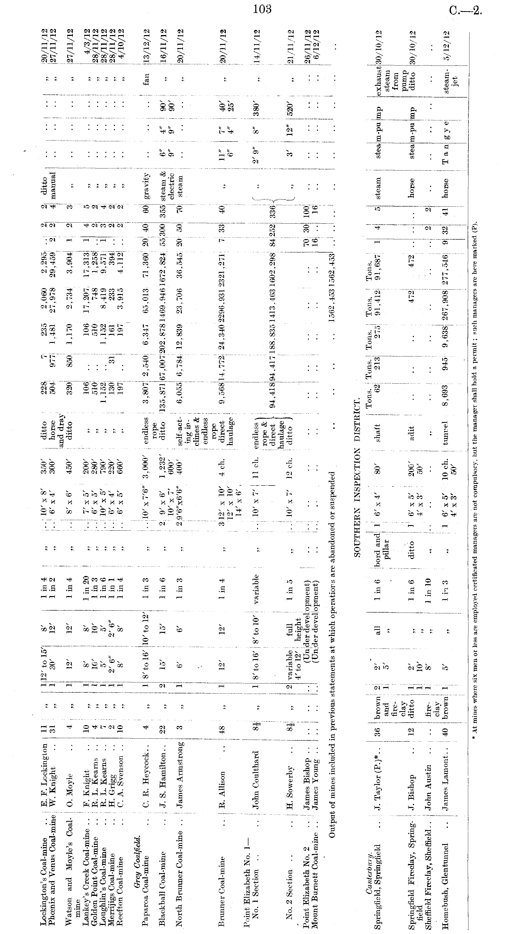 Canterbury. Springfield, Springfield .. J. Taylor (P.)*.. 36 brown 2 and 1 fireclay Springfield Fireclay, Spring- J. Bishop .. 12 ditto 1 field 1 Sheffield Fireclay, Sheffield.. John Austin .. .. lire- 1 clay Homebush, Glentunnel .. James Lament.. 40 brown 1 2' 5' 2' 10' 8' 5' all 1 in 6 1 in 6 1 in 10 1 in 3 ■ bord and; 1 6' x 4' pillar ditto | 1 6' x 5' 4' x 3' ., 1 6' x 5' 4'x 3' | Tons, i Tons. I Tons. ] Tons. ! Tons. 80' shaft ' 62 213 275 1 91,412 91,687 1 4 200' adit .. .. .. 472> 472 50' '.. ..2 10 ch. i tunnel 8.693 945 9,638 267,908 277,546 9 32 < 50' 5 steam stea horse stea 2 41 horse Tan m-pu mp n-pu mp exhaust 30/10/12 steam from pump ditto 30/10/12 gye steam- 5/12/12 jet * At mines where six men or less are enl] ►loyed certificated managers are not compulsory, but the manager shall hold a permit; such managers are here marked (¥]