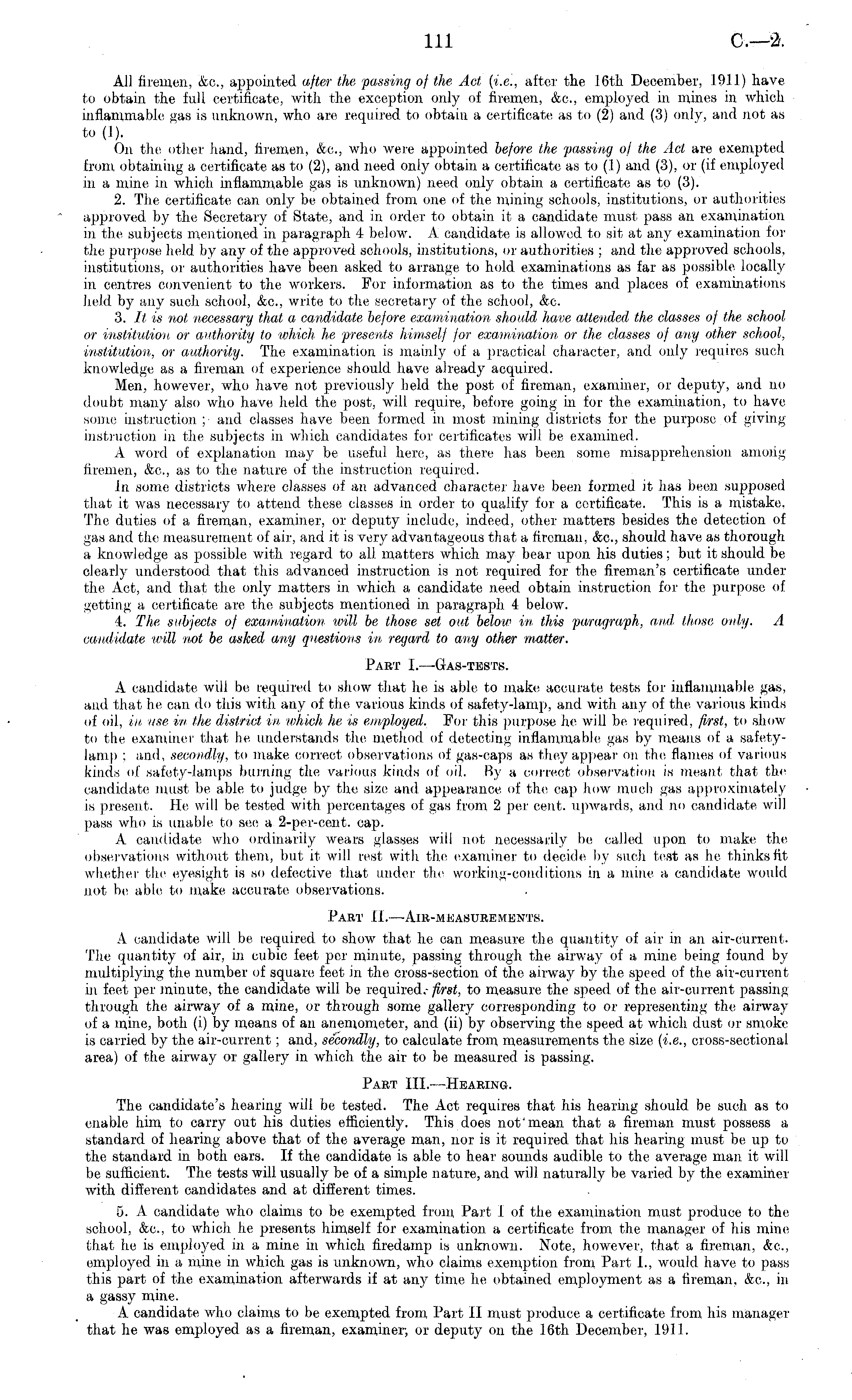 All firemen, &c, appointed after the passing of the Act {i.e., after the 16th December, 191.1) have to obtain the full certificate, with the exception only of firemen, &c, employed in mines in which inflammable gas is unknown, who are required to obtain a certificate as to (2) and (3) only, and not as to (I). On the other hand, firemen, &c, who were appointed before the passing of the Act are exempted from obtaining a certificate as to (2), and need only obtain a certificate as to (I) and (3), or (if employed in a mine in which inflammable gas is unknown) need only obtain a certificate as to (3). 2. The certificate can only be obtained from one of the mining schools, institutions, or authorities approved by the Secretary of State, and in order to obtain it a candidate must pass an examination in the subjects mentioned in paragraph 4 below. A candidate is allowed to sit at any examination for the purpose held by any of the approved schools, institutions, or authorities ; and the approved schools, institutions, or authorities have been asked to arrange to hold examinations as far as possible locally in centres convenient to the workers. For information as to the times and places of examinations held by any such school, &c, write to the secretary of the school, &c. 3. It is not necessary that a candidate before examination should have attended the classes of the school, or institution or authority to which he presents himself for examination or the classes of any other school, institution, or authority. The examination is mainly of a practical character, and only requires such knowledge as a fireman of experience should have already acquired. Men, however, who have not previously held the post of fireman, examiner, or deputy, and no doubt many also who have held the post, will require, before going in for the examination, to have some instruction ;• and classes have been formed in. most mining districts for the purpose of giving instruction in the subjects in which candidates for certificates will be examined. A word of explanation may be useful here, as there has been some misapprehension among firemen, &c, as to the nature of the instruction required. In some districts where classes of an advanced character have been formed it has been supposed that it was necessary to attend these classes in order to qualify for a certificate. This is a mistake. The duties of a fireman, examiner, or deputy include, indeed, other matters besides the detection of gas and the measurement of air, and it is very advantageous that a fireman, &c, should have as thorough a knowledge as possible with regard to all matters which may bear upon his duties; but it should be clearly understood that this advanced instruction is not required for the fireman's certificate under the Act, and that the only matters in which a candidate need obtain instruction for the purpose of getting a certificate are the subjects mentioned in paragraph 4 below. 4. The subjects of examination will be those set out below in this paragraph, and those only. A candidate will not be asked any questions in regard to any other matter. Part I. — U-as-tests. A candidate will be required to show that he is able to make accurate tests for inflammable gas, and that he can do this with any of the various kinds of safety-lamp, and with any of the various kinds of oil, in use in the district in which he is employed. For this purpose he will he required, first, to show to the examiner that he understands the method of detecting inflammable gas by means of a safetylamp ; and, secondly, to make correct observations of gas-caps as they appeal on the flames of various kinds of safety-lamps burning the various kinds of oil. By a correct observation is meant that the candidate must be able to judge by the size and appearance of the cap how much gas approximately is present. He will be tested with percentages of gas from 2 per cent, upwards, and no candidate will pass who is unable to see a 2-per-cent. cap. A candidate who ordinarily wears glasses will not necessarily be called upon to make the observations without them, but it will rest with the examiner to decide by such test as he thinks fit whether the eyesight is so defective that under the working-conditions in a mine a candidate would not be able to make accurate observations. Part ll.—Air-measurements. A candidate will be required, to show that he can measure the quantity of air in an air-current. The quantity of air, in cubic feet per minute, passing through the airway of a mine being found by multiplying the number of square feet in the cross-section of the airway by the speed of the air-current in feet per minute, the candidate will be required,- first, to measure the speed of the air-current passing through the airway of a mine, or through some gallery corresponding to or representing the airway of a mine, both (i) by means of an anemometer, and (ii) by observing the speed at which dust or smoke is carried by the air-current; and, secondly, to calculate from measurements the size {i.e., cross-sectional area) of the airway or gallery in which the air to be measured is passing. Part lll.—Hearing. The candidate's hearing will be tested. The Act requires that his hearing should be such as to enable him to carry out his duties efficiently. This does not'mean that a fireman must possess a standard of hearing above that of the average man, nor is it required that his hearing must be up to the standard in both ears. If the candidate is able to hear sounds audible to the average man it will be sufficient. The tests will usually be of a simple nature, and will naturally be varied by the examiner with different candidates and at different times. 5. A candidate who claims to be exempted from Part 1 of the examination must produce to the school, &c, to which he presents himself for examination a certificate from the manager of his mine that he is employed in a mine in which firedamp is unknown. Note, how