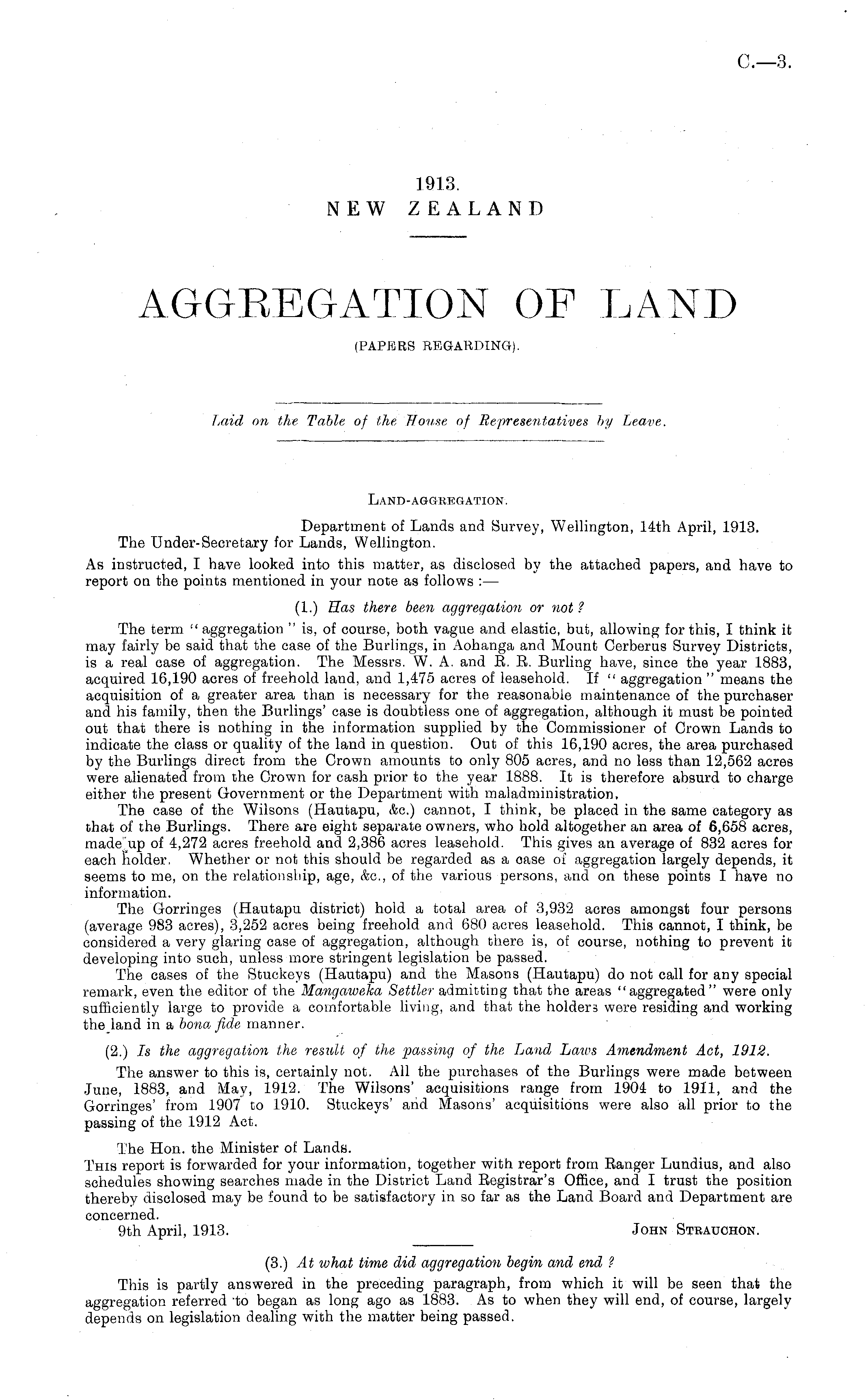 Land-aggkegation. Department of Lands and Survey, Wellington, 14th April, 1913. The Under-Secretary for Lands, Wellington. As instructed, I have looked into this matter, as disclosed by the attached papers, and have to report on the points mentioned in your note as follows : — (1.) Has there been aggregation or not ? The term "aggregation " is, of course, both vague and elastic, but, allowing for this, I think it may fairly be said that the case of the Burlings, in Aohanga and Mount Cerberus Survey Districts, is a real case of aggregation. The Messrs. W. A, and E. E. Burling have, since the year 1883, acquired 16,190 acres of freehold land, and 1,475 acres of leasehold. If " aggregation " means the acquisition of a greater area than is necessary for the reasonable maintenance of the purchaser and his family, then the Burlings' case is doubtless one of aggregation, although it must be pointed out that there is nothing in the information supplied by the Commissioner of Crown Lands to indicate the class or quality of the land in question. Out of this 16,190 acres, the area purchased by the Burlings direct from the Crown amounts to only 805 acres, and no less than 12,562 acres were alienated from the Crown for cash prior to the year 1888. It is therefore absurd to charge either the present Government or the Department with maladministration. The case of the Wilsons (Hautapu, &c.) cannot, I think, be placed in the same category as that of the Burlings. There are eight separate owners, who hold altogether an area of 6,658 acres, made'up of 4,272 acres freehold and 2,386 acres leasehold. This gives an average of 832 acres for each holder, Whether or not this should be regarded as a case of aggregation largely depends, it seems to me, on the relationship, age, kc, of the various persons, and on these points I have no information. The Gorringes (Hautapu district) hold a total area of 3,932 acres amongst four persons (average 983 acres), 3,252 acres being freehold and 680 acres leasehold. This cannot, I think, be considered a very glaring case of aggregation, although there is, of course, nothing to prevent it developing into such, unless more stringent legislation be passed. The cases of the Stuckeys (Hautapu) and the Masons (Hautapu) do not call for any special remark, even the editor of the MangaweJca Settler admitting that the areas "aggregated" were only sufficiently large to provide a comfortable living, and that the holders were residing and working theland in a bona fide manner. (2.) Is the aggregation the result of the passing of the Land Latus Amendment Act, 1912. The answer to this is, certainly not. All the purchases of the Burlings were made between June, 1883, and May, 1912. The Wilsons' acquisitions range from 1904 to 1911, and the Gorringes' from 1907 to 1910. Stuckeys' and Masons' acquisitions were also all prior to the passing of the 1912 Act. The Hon. the Minister of Lands. This report is forwarded for your information, together with report from Sanger Lundius, and also schedules showing searches made in the District Land Eegistrar's Office, and I trust the position thereby disclosed may be found to be satisfactory in so far as the Land Board and Department are concerned. 9th April, 1913. John Stbauchon. (3.) At what time did aggregation begin and end 1 This is partly answered in the preceding paragraph, from which it will be seen that the aggregation referred to began as long ago as 1883. As to when they will end, of course, largely depends on legislation dealing with the matter being passed.