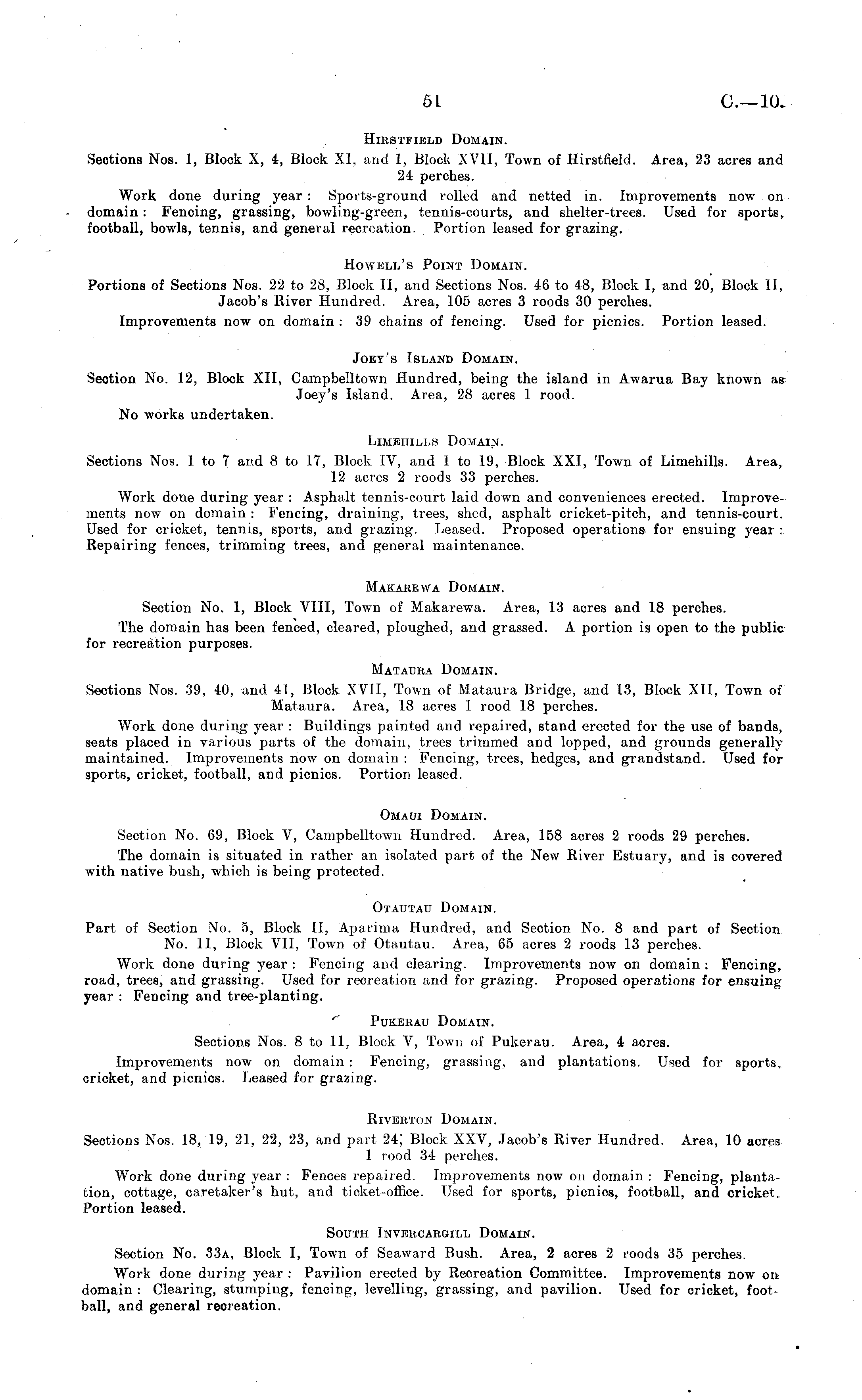 Hikstfield Domain. Sections Nos. 1, Block X, 4, Block XI, and 1, Block XVII, Town of Hirstfield. Area, 23 acres and 24 perches. Work done during year : Sports-ground rolled and netted in. Improvements now on domain: Fencing, grassing, bowling-green, tennis-courts, and shelter-trees. Used for sports, football, bowls, tennis, and general recreation. Portion leased for grazing. Howell's Point Domain. Portions of Sections Nos. 22 to 28, Block 11, and Sections Nos. 46 to 48, Block I, and 20, Block 11, Jacob's River Hundred. Area, 105 acres 3 roods 30 perches. Improvements now on domain :39 chains of fencing. Used for picnics. Portion leased. Joey's Island Domain. Section No. 12, Block XII, Campbelltown Hundred, being the island in Awarua Bay known as Joey's Island. Area, 28 acres 1 rood. No works undertaken. LimehilljS Domain. Sections Nos. 1 to 7 and Bto 17, Block IV, and Ito 19, Block XXI, Town of Limehills. Area, 12 acres 2 roods 33 perches. Work done during year : Asphalt tennis-court laid down and conveniences erected. Improvements now on domain : Fencing, draining, trees, shed, asphalt cricket-pitch, and tennis-court. Used for cricket, tennis, sports, and grazing. Leased. Proposed operations for ensuing year : Repairing fences, trimming trees, and general maintenance. Makarewa Domain. Section No. 1, Block VIII, Town of Makarewa. Area, 13 acres and 18 perches. The domain has been fenced, cleared, ploughed, and grassed. A portion is open to the public for recreation purposes. Mataura Domain. Sections Nos. 39, 40, and 41, Block XVII, Town of Mataura Bridge, and 13, Block XII, Town of Mataura. Area, 18 acres 1 rood 18 perches. Work done during year : Buildings painted and repaired, stand erected for the use of bands, seats placed in various parts of the domain, trees trimmed and lopped, and grounds generally maintained. Improvements now on domain : Fencing, trees, hedges, and grandstand. Used for sports, cricket, football, and picnics. Portion leased. Omaui Domain. Section No. 69, Block V, Campbelltown Hundred. Area, 158 acres 2 roods 29 perches. The domain is situated in rather an isolated part of the New River Estuary, and is covered with native bush, which is being protected. Otautau Domain. Part of Section No. 5, Block 11, Aparima Hundred, and Section No. 8 and part of Section No. 11, Block VII, Town of Otautau. Area, 65 acres 2 roods 13 perches. Work done during year : Fencing and clearing. Improvements now on domain : Fencing, road, trees, and grassing. Used for recreation and for grazing. Proposed operations for ensuing year : Fencing and tree-planting. Pukekau Domain. Sections Nos. Bto 11, Block V, Town of Pukerau. Area, 4 acres. Improvements now on domain : Fencing, grassing, and plantations. Used for sports, cricket, and picnics. Leased for grazing. Riverton Domain. Sections Nos. 18, 19, 21, 22, 23, and part 24; Block XXV, Jacob's River Hundred. Area, 10 acres 1 rood 34 perches. Work done during year : Fences repaired. Improvements now on domain : Fencing, plantation, cottage, caretaker's hut, and ticket-office. Used for sports, picnics, football, and cricket.. Portion leased. South Invercargill Domain. Section No. 33a, Block I, Town of Seaward Bush. Area, 2 acres 2 roods 35 perches. Work done during year : Pavilion erected by Recreation Committee. Improvements now on domain : Clearing, stumping, fencing, levelling, grassing, and pavilion. Used for cricket, football, and general recreation.
