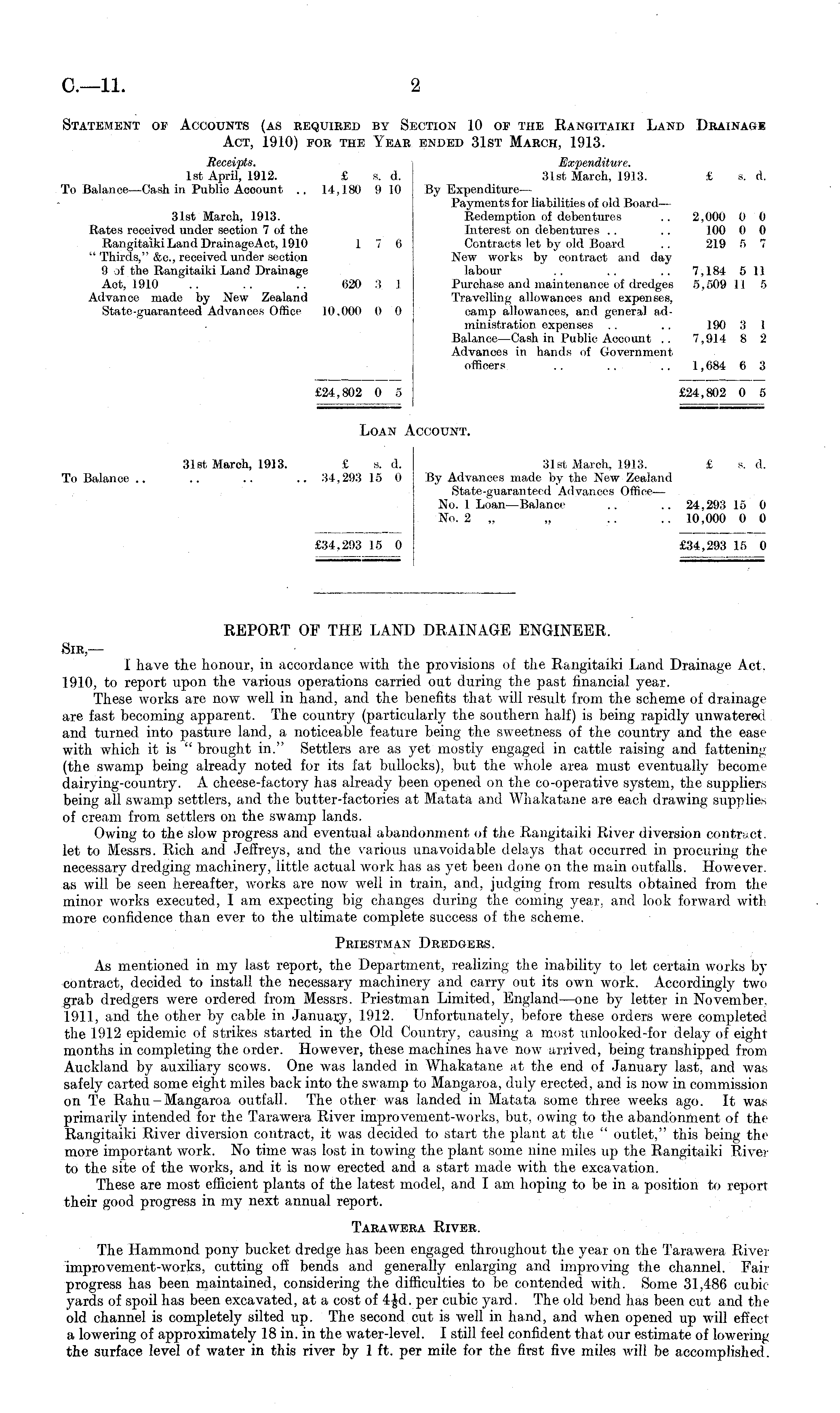 REPORT OF THE LAND DRAINAGE ENGINEER. Sir — I have the honour, in accordance with the provisions of the Rangitaiki Land Drainage Act. 1910, to report upon the various operations carried out during the past financial year. These works are now well in hand, and the benefits that will result from the scheme of drainage are fast becoming apparent. The country (particularly the southern half) is being rapidly unwatered and turned into pasture land, a noticeable feature being the sweetness of the country and the ease with which it is " brought in." Settlers are as yet mostly engaged in cattle raising and fattening (the swamp being already noted for its fat bullocks), but the whole area must eventually become dairying-country. A cheese-factory has already been opened on the co-operative system, the supplier* being all swamp settlers, and the butter-factories at Matata and Whakatane are each drawing supplier, of cream from settlers on the swamp lands. Owing to the slow progress and eventual abandonment of the Rangitaiki River diversion contract, let to Messrs. Rich and Jeffreys, and the various unavoidable delays that occurred in procuring the necessary dredging machinery, little actual work has as yet been done on the main outfalls. However, as will be seen hereafter, works are now well in train, and, judging from results obtained from the minor works executed, I am expecting big changes during the coming year, and look forward with more confidence than ever to the ultimate complete success of the scheme. Priestman Dredgers. As mentioned in my last report, the Department, realizing the inability to let certain works by contract, decided to install the necessary machinery and carry out its own work. Accordingly two grab dredgers were ordered from Messrs. Priestman Limited, England—one by letter in November. 1911, and the other by cable in January, 1912. Unfortunately, before these orders were completed the 1912 epidemic of strikes started in the Old Country, causing a most unlooked-for delay of eight months in completing the order. However, these machines have now arrived, being transhipped from Auckland by auxiliary scows. One was landed in Whakatane at the end of January last, and was safely carted some eight miles back into the swamp to Mangaroa, duly erected, and is now in commission on Te Rahu-Mangaroa outfall. The other was landed in Matata some three weeks ago. It was primarily intended for the Tarawera River improvement-works, but, owing to the abandonment of the Rangitaiki River diversion contract, it was decided to start the plant at the " outlet," this being the more important work. No time was lost in towing the plant some nine miles up the Rangitaiki River to the site of the works, and it is now erected and a start made with the excavation. These are most efficient plants of the latest model, and I am hoping to be in a position to report their good progress in my next annual report. Tarawera River. The Hammond pony bucket dredge has been engaged throughout the year on the Tarawera River improvement-works, cutting off bends and generally enlarging and improving the channel. Failprogress has been maintained, considering the difficulties to be contended with. Some 31,486 cubicyards of spoil has been excavated, at a cost of 4|d. per cubic yard. The old bend has been cut and the old channel is completely silted up. The second cut is well in hand, and when opened up will effect a lowering of approximately 18 in. in the water-level. I still feel confident that our estimate of lowering the surface level of water in this river by 1 ft. per mile for the first five miles will be accomplished.