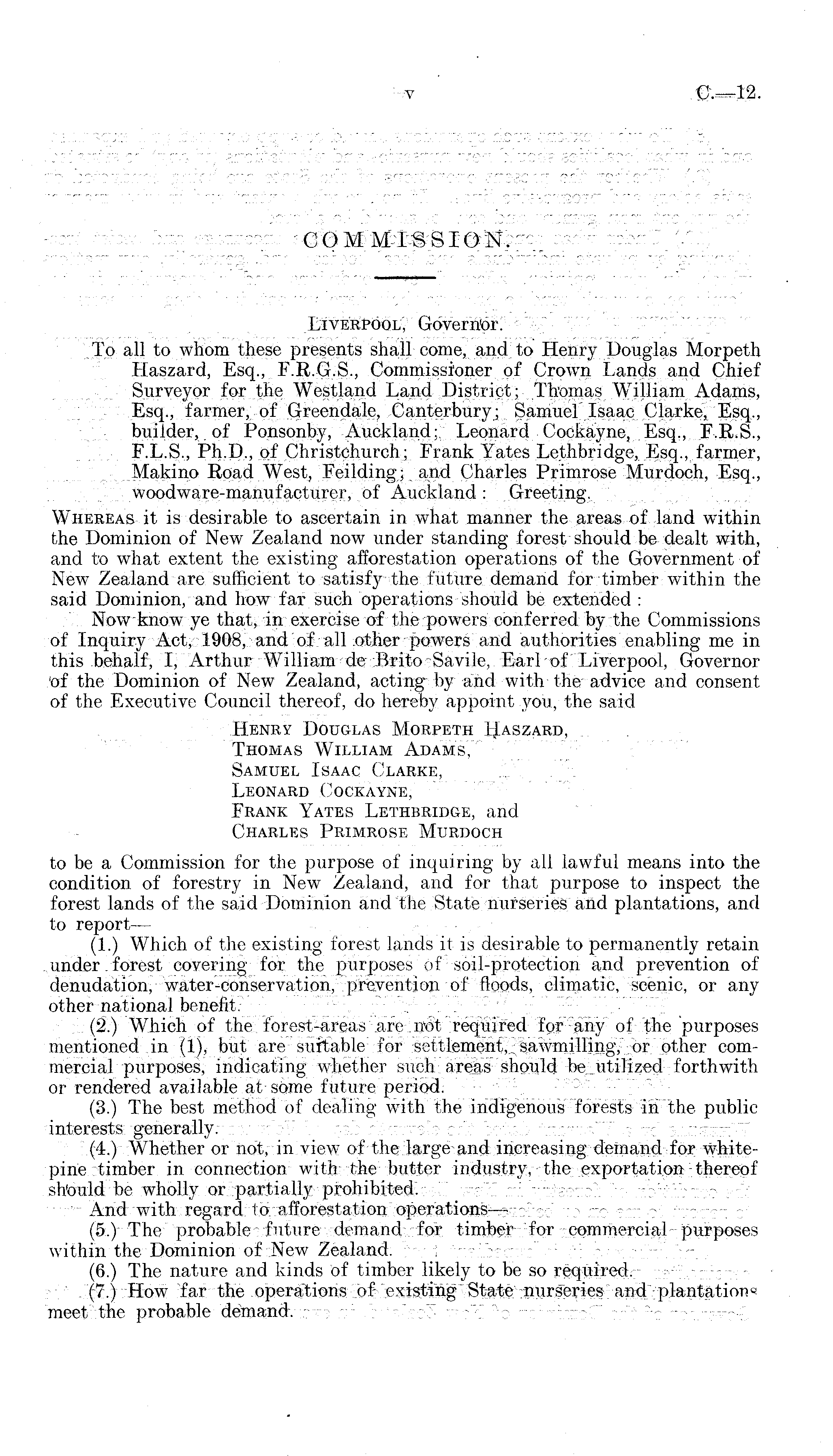 Liverpool, Governor. To all to whom these presents shall come, and to Henry Douglas Morpeth Haszard, Esq., F.E.G.S., Commissioner of Crown Lands and Chief Surveyor for the Westland Land District; Thomas William Adams, Esq., farmer, of Greendale, Canterbury; Samuel Isaac Clarke, Esq., builder, of Ponsonby, Auckland; Leonard Cockayne, Esq., F.R.S., F.L.S., Ph.D., of Christchurch; Frank Yates Lethbridge, Esq., farmer, Makino Road West, Feilding; and Charles Primrose Murdoch, Esq., woodware-manufacturer, of Auckland : Greeting. Whereas it is desirable to ascertain in what manner the areas of land within the Dominion of New Zealand now under standing forest should be dealt with, and to what extent the existing afforestation operations of the Government of New Zealand are sufficient to satisfy the future demand for timber within the said Dominion, and how far such operations should be extended : Now know ye that, in exercise of the powers conferred by the Commissions of Inquiry Act, 1908, and of all other powers and authorities enabling me in this behalf, I, Arthur William de Brito Savile, Earl of Liverpool, Governor 'of the Dominion of New Zealand, acting by and with the advice and consent of the Executive Council thereof, do hereby appoint you, the said Henry Douglas Morpeth Haszard, Thomas William Adams, Samuel Isaac Clarke, Leonard Cockayne, Frank Yates Lethbridge, and Charles Primrose Murdoch to be a Commission for the purpose of inquiring by all lawful means into the condition of forestry in New Zealand, and for that purpose to inspect the forest lands of the said Dominion and the State nurseries and plantations, and to report — (1.) Which of the existing forest lands it is desirable to permanently retain under forest covering for the purposes of soil-protection and prevention of denudation, water-conservation, prevention of floods, climatic, scenic, or any other national benefit. (2.) Which of the forest-areas are n-ot required for any of the purposes mentioned in (1), but are suitable for settlement,sawmilling, or other commercial purposes, indicating whether such areas should be utilized forthwith or rendered available at some future period. (3.) The best method of dealing with the indigenous forests in the public interests generally. (4.) Whether or not, in view of the large and increasing demand for whitepine timber in connection with the butter industry, the exportation thereof should be wholly or partially prohibited. And with regard to afforestation operations— (5.) The probable future demand for timber for commercial purposes within the Dominion of New Zealand. (6.) The nature and kinds of timber likely to be so required. (7.) How far the operations of existing State nurseries and plantation* meet the probable demand.