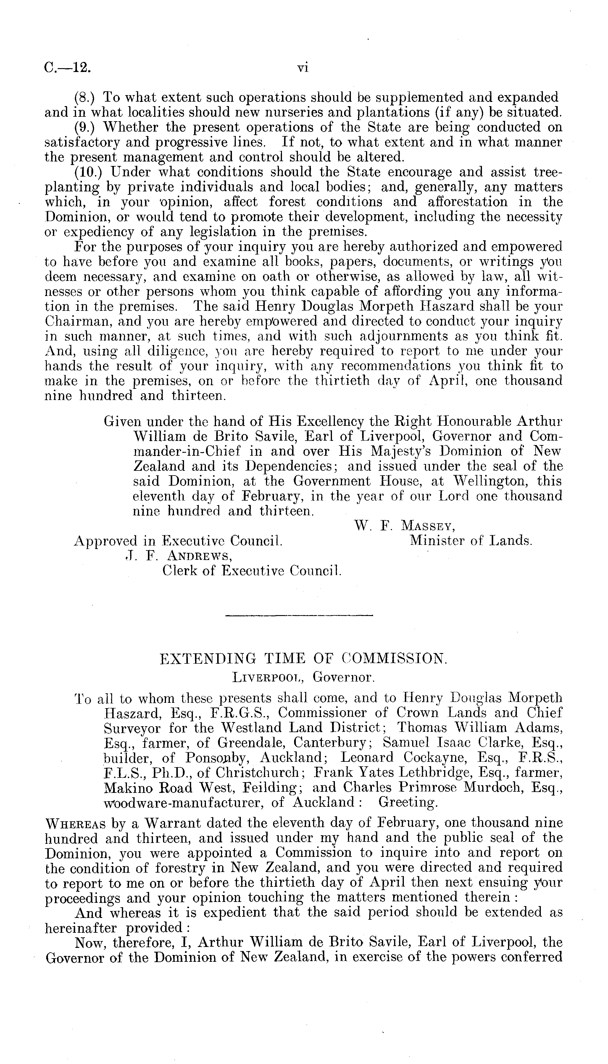 EXTENDING TIME OF COMMISSION. Liverpool, Governor. To all to whom these presents shall come, and to Henry Douglas Morpeth Haszard, Esq., F.R.G.S., Commissioner of Crown Lands and Chief Surveyor for the Westland Land District; Thomas William Adams, Esq., farmer, of Greendale, Canterbury; Samuel Isaac Clarke, Esq., builder, of Ponsojiby, Auckland; Leonard Cockayne, Esq., F.E.S., F.L.S., Ph.D., of Christchurch; Frank Yates Lethbridge, Esq., farmer, Makino Road West, Feilding; and Charles Primrose Murdoch, Esq., woodware-manufacturer, of Auckland : Greeting. Whereas by a Warrant dated the eleventh day of February, one thousand nine hundred and thirteen, and issued under my hand and the public seal of the Dominion, you were appointed a Commission to inquire into and report on the condition of forestry in New Zealand, and you were directed and required to report to me on or before the thirtieth day of April then next ensuing your proceedings and your opinion touching the matters mentioned therein : And whereas it is expedient that the said period should be extended as hereinafter provided : Now, therefore, I, Arthur William de Brito Savile, Earl of Liverpool, the Governor of the Dominion of New Zealand, in exercise of the powers conferred