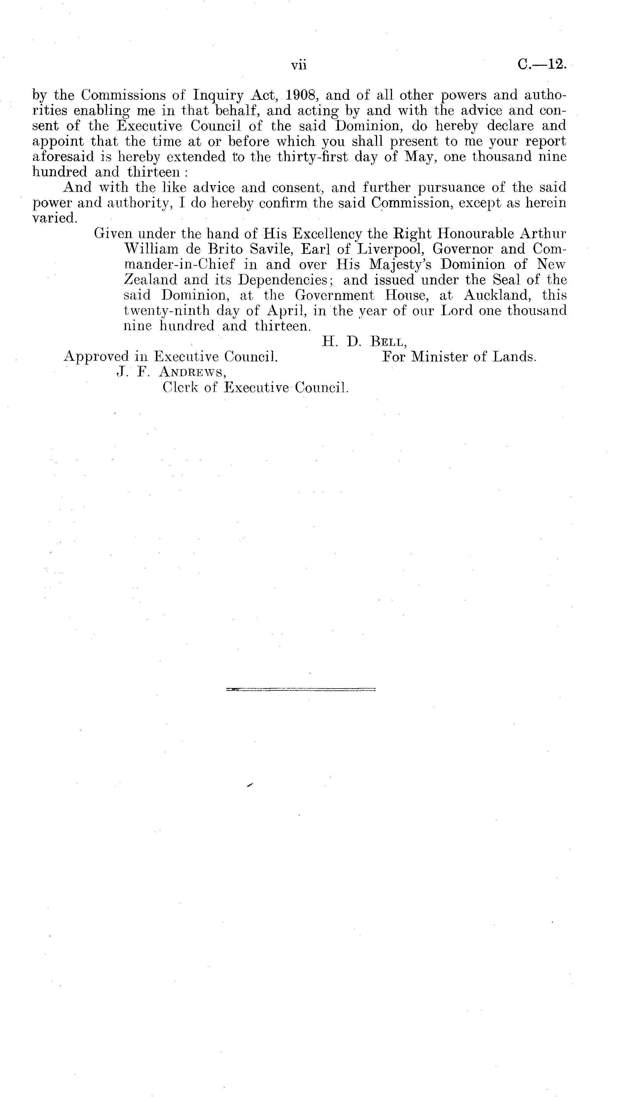 by the Commissions of Inquiry Act, 1908, and of all other powers and authorities enabling me in that behalf, and acting by and with the advice and consent of the Executive Council of the said Dominion, do hereby declare and appoint that the time at or before which you shall present to me your report aforesaid is hereby extended to the thirty-first day of May, one thousand nine hundred and thirteen : And with the like advice and consent, and further pursuance of the said power and authority, I do hereby confirm the said Commission, except as herein varied. Given under the hand of His Excellency the Right Honourable Arthur William de Brito Savile, Earl of Liverpool, Governor and Com-mander-in-Chief in and over His Majesty's Dominion of New Zealand and its Dependencies; and issued under the Seal of the said Dominion, at the Government House, at Auckland, this twenty-ninth day of April, in the year of our Lord one thousand nine hundred and thirteen. H. D. Bell, Approved in Executive Council. For Minister of Lands. J. F. Andrews, Clerk of Executive Council.