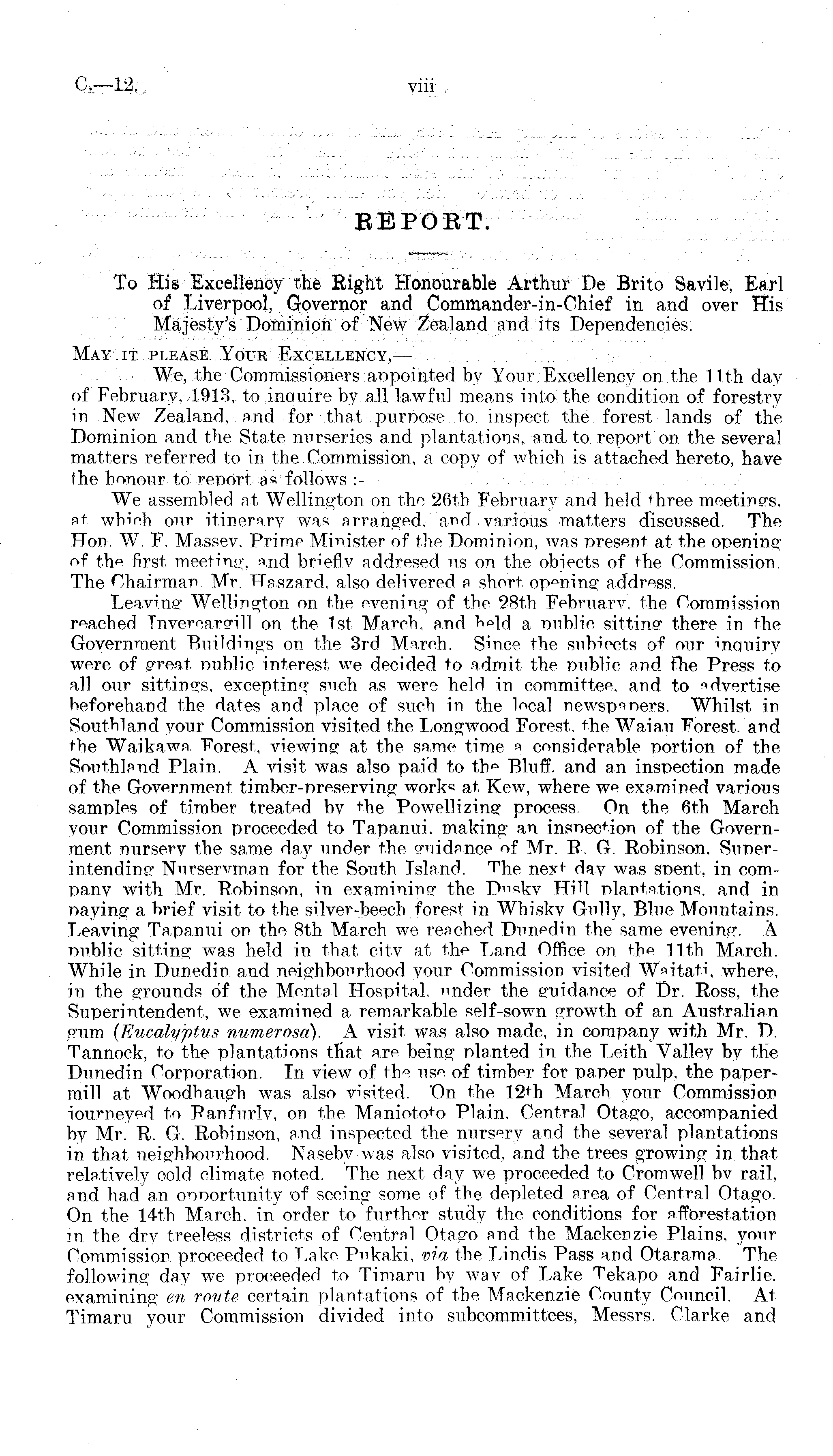 To His Excellency the Eight Honourable Arthur De Brito Savile, Earl of Liverpool, Governor and Commander-in-Chief in and over His Majesty's Dominion of New Zealand and its Dependencies. May it. please. Your Excellency,— We, the Commissioners appointed by Your Excellency on the 11th day of February, 1913, to inouire by all lawful means into the condition of forestry in New Zealand, and for that purpose to inspect the forest lands of the Dominion and the State nurseries and plantations, and to report on the several matters referred to in the Commission, a copy of which is attached hereto, have Ihe honour to report as follows : — We assembled at Wellington on the 26th February and held + hree meetings, nt whiHb our itinerary was arranged, and various matters discussed. The Hon. W. F. Massev, Primp Minister of the Dominion, was present at the opening of the first meeting, and briefly addresed us on the objects of the Commission. The Chairman Mr. Haszard, also delivered a short opening address. Leaving , Wellington on the evening; of the 28th February, the Commission reached Invereargill on the Ist March, and a public sitting - there in the Government Buildings on the 3rd March. Since the subiects of our inquiry were of great Dublic interest we decided to admit the public and the Press to all our sittings, excepting such as were held in committee, and to advertise beforehand the dates and place of such in the local newspapers. Whilst in Southland your Commission visited the Longwood Forest, the Waiau Forest, and the Wa,ikawa Forest, viewing at the same time a considerable portion of the Southland Plain. A visit was also paid to th° Bluff, and an inspection made of the Government timber-preserving; work« at Kew, where we examined various samples of timber treated by the Powellizing process. On the 6th March your Commission proceeded to Tapanui. making; an inspection of the Government nursery the same day under the o-iridance of Mr. R. G. Robinson, Superintending Nurseryman for the South Island. The next day was spent, in company with Mr. Robinson, in examining" the D"sky HiH plantations, and in paying a brief visit to the silver-beech forest in Whisky Gully, Blue Mountains. Leaving Tapanui on the Bth March we reached Dunedin the same evening. A public sitting was held in that city at the Land Office on the 11th March. While in Dunedin and neighbourhood your Commission visited where, in the grounds of the Mental Hospital, under the guidance of Dr. Ross, the Superintendent, we examined a remarkable self-sown growth of an Australian gum (Eucalyptus numerosd). A visit was also made, in company with Mr. D. Tannock, to the plantations that are being planted in the Leith Valley by the Dunedin Corporation. In view of the use of timber for paper pulp, the papermill at Woodhaugh was also visited. 'On the 12th March your Commission iourneyed to Ranfurlv, on the Manioto+o Plain. Central Otago, accompanied by Mr. R. G. Robinson, and inspected the nurs p ry and the several plantations in that neighbourhood. Naseby w r as also visited, and the trees growing in that relatively cold climate noted. The next day we proceeded to Cromwell by rail, and had an opportunity of seeing some of the depleted area of Central Otago. On the 14th March, in order to further study the conditions for afforestation in the dry treeless districts of Central Otago and the Mackenzie Plains, your Commission proceeded to Lake Pukaki, via the Lindis Pass and Otarama. The following day we proceeded to Timaru by wav of Lake Tekapo and Fairlie, examining en route certain plantations of the Mackenzie County Council. At Timaru your Commission divided into subcommittees, Messrs. Clarke and