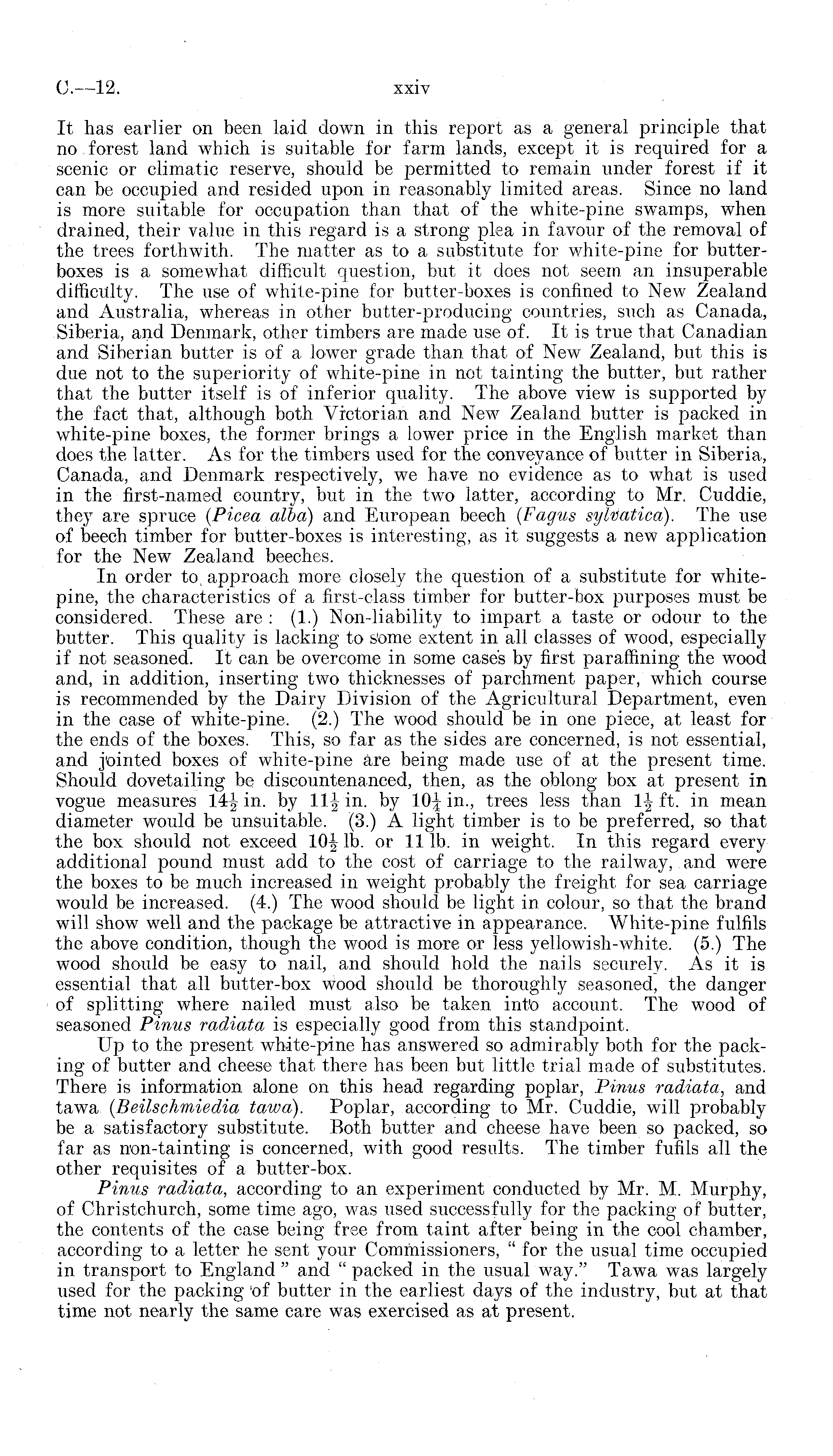 It has earlier on been laid down in this report as a general principle that no forest land which is suitable for farm lands, except it is required for a scenic or climatic reserve, should be permitted to remain under forest if it can be occupied and resided upon in reasonably limited areas. Since no land is more suitable for occupation than that of the white-pine swamps, when drained, their value in this regard is a strong plea in favour of the removal of the trees forthwith. The matter as to a substitute for white-pine for butterboxes is a somewhat difficult question, but it does not seem an insuperable difficulty. The use of white-pine for biitter-boxes is confined to New Zealand and Australia, whereas in other butter-producing countries, such as Canada, Siberia, and Denmark, other timbers are made use of. It is true that Canadian and Siberian butter is of a lower grade than that of New Zealand, but this is due not to the superiority of white-pine in not tainting the butter, but rather that the butter itself is of inferior quality. The above view is supported by the fact that, although both Victorian and New Zealand butter is packed in white-pine boxes, the former brings a lower price in the English market than does the latter. As for the timbers used for the conveyance of butter in Siberia, Canada, and Denmark respectively, we have no evidence as to what is used in the first-named country, but in the two latter, according to Mr. Cuddie, they are spruce (Picea alba) and European beech (Fagus sylvatica). The use of beech timber for butter-boxes is interesting, as it suggests a new application for the New Zealand beeches. In order to, approach more closely the question of a substitute for whitepine, the characteristics of a first-class timber for butter-box purposes must be considered. These are : (1.) Non-liability to impart a taste or odour to the butter. This quality is lacking to some extent in all classes of wood, especially if not seasoned. It can be overcome in some case's by first paraffining the wood and, in addition, inserting two thicknesses of parchment paper, which course is recommended by the Dairy Division of the Agricultural Department, even in the case of white-pine. (2.) The wood should be in one piece, at least for the ends of the boxes. This, so far as the sides are concerned, is not essential, and jointed boxes of white-pine are being made use of at the present time. Should dovetailing be discountenanced, then, as the oblong box at present in vogue measures 14J in. by in. by 10| : in., trees less than \\ ft. in mean diameter would be unsuitable. (3.) A light timber is to be preferred, so that the box should not exceed 10^-lb. or 111b. in weight. In this regard every additional pound must add to the cost of carriage to the railway, and were the boxes to be much increased in weight probably the freight for sea carriage would be increased. (4.) The wood should be light in colour, so that the brand will show well and the package be attractive in appearance. White-pine fulfils the above condition, though the wood is more or less yellowish-white. (5.) The wood should be easy to nail, and should hold the nails securely. As it is essential that all butter-box wood should be thoroughly seasoned, the danger of splitting where nailed must also be taken info account. The wood of seasoned Finns radiata is especially good from this standpoint. Up to the present white-pine has answered so admirably both for the packing of butter and cheese that there has been but little trial made of substitutes. There is information alone on this head regarding poplar, Pinus radiata, and tawa (Beilschmiedia tawa). Poplar, according to Mr. Cuddie, will probably be a satisfactory substitute. Both butter and cheese have been so packed, so far as non-tainting is concerned, with good results. The timber fufils all the other requisites of a butter-box. Pinus radiata, according to an experiment conducted by Mr. M. Murphy, of Christchurch, some time ago, was used successfully for the packing of butter, the contents of the case being free from taint after being in the cool chamber, according to a letter he sent your Commissioners, " for the usual time occupied in transport to England " and " packed in the usual way." Tawa was largely used for the packing 'of butter in the earliest days of the industry, but at that time not nearly the same care was exercised as at present.
